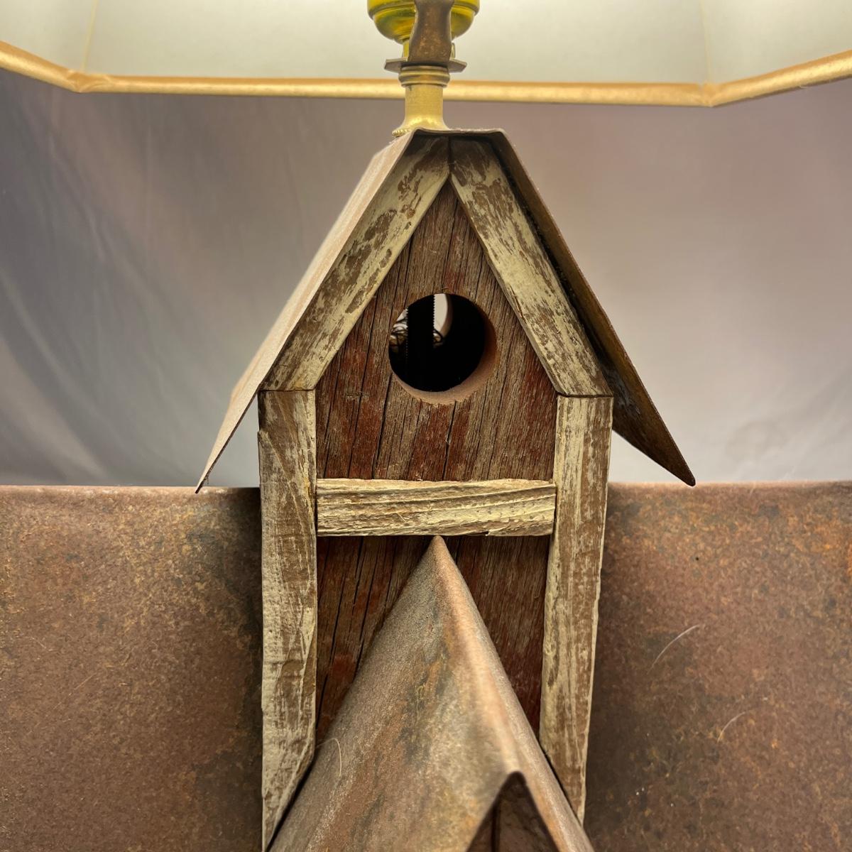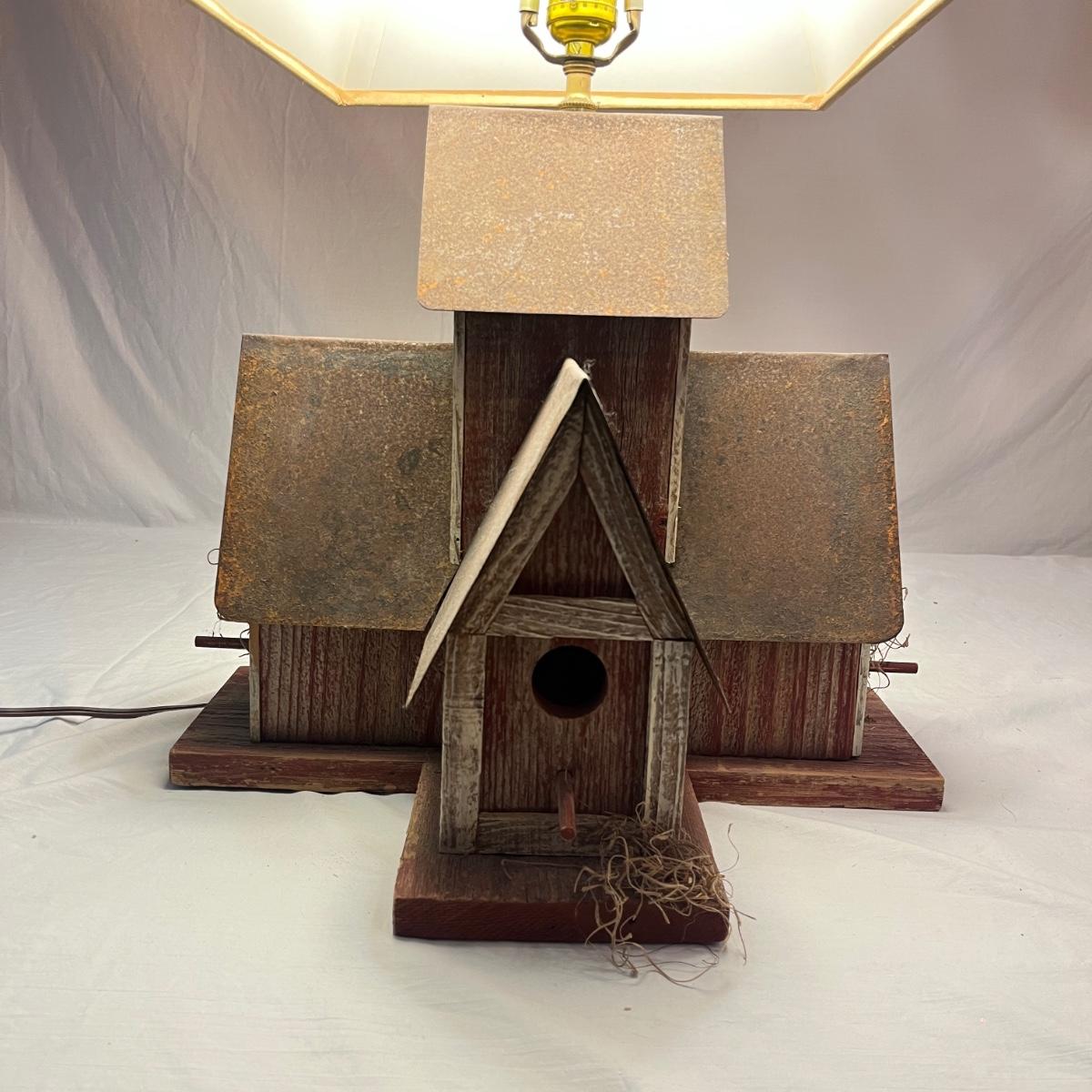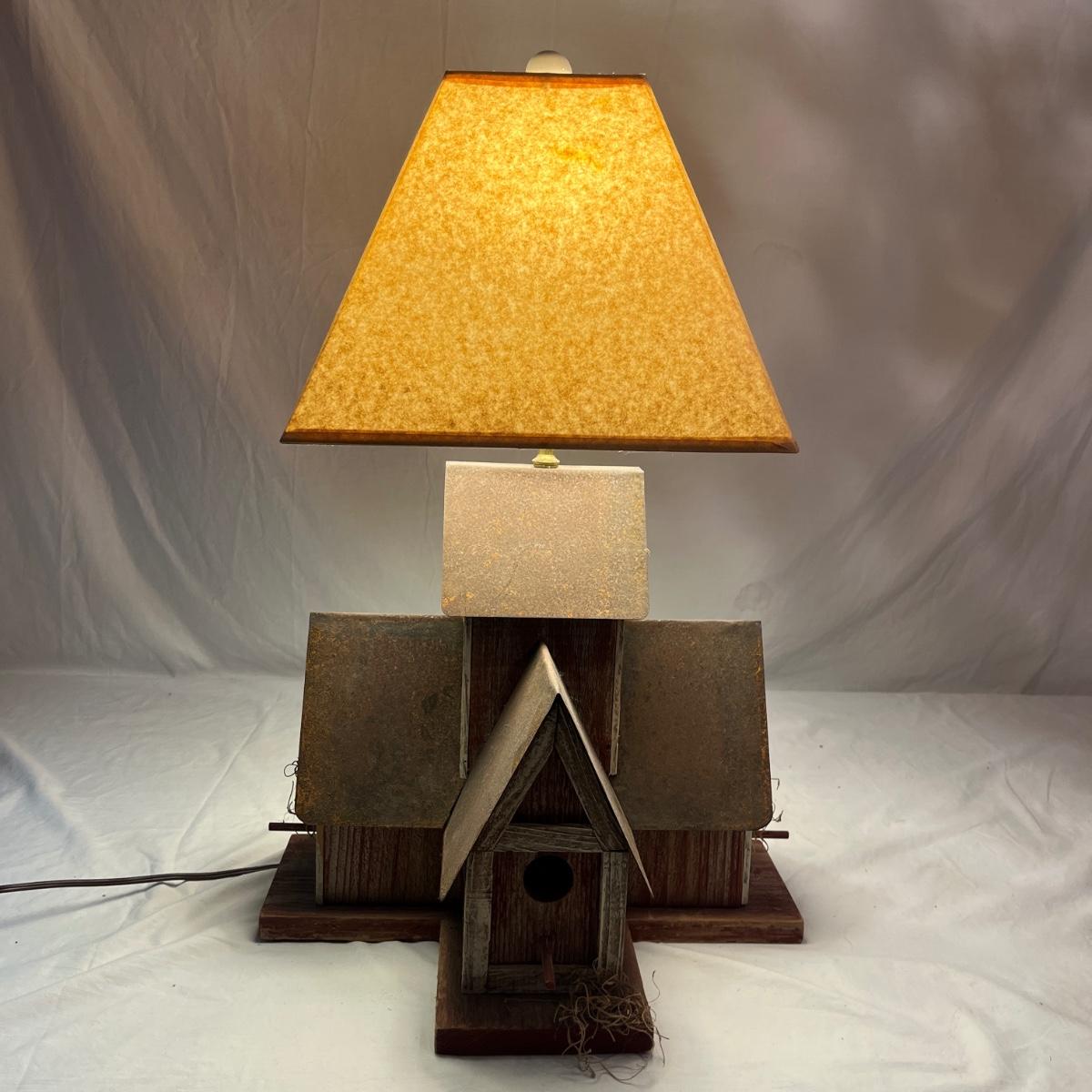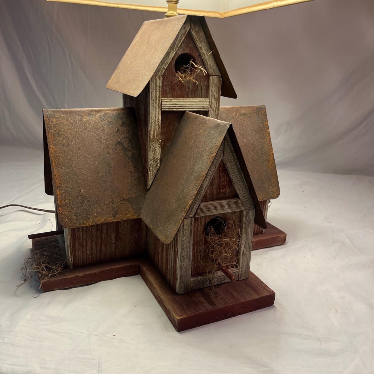 Lot includes a birdhouse table lamp that is made from wood and metal. Lamp measures 16” x 16” x 25”H. Lamp powered on when plugged in and has a on/off switch.