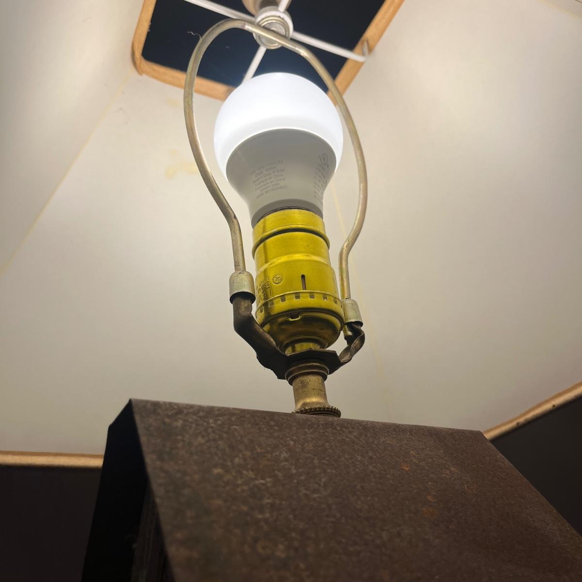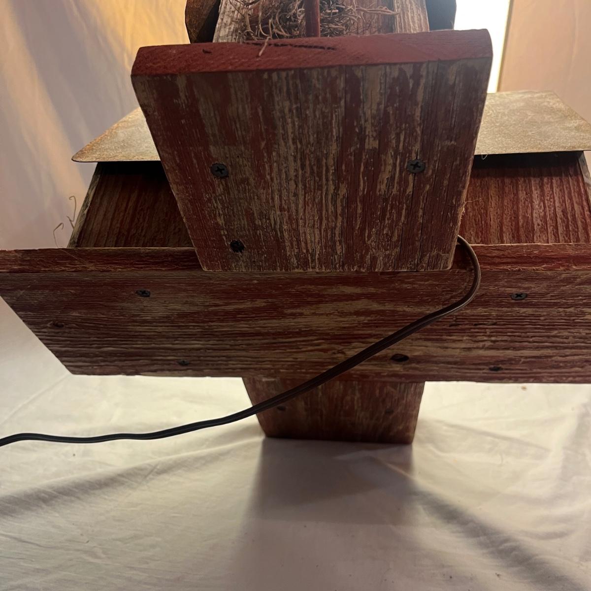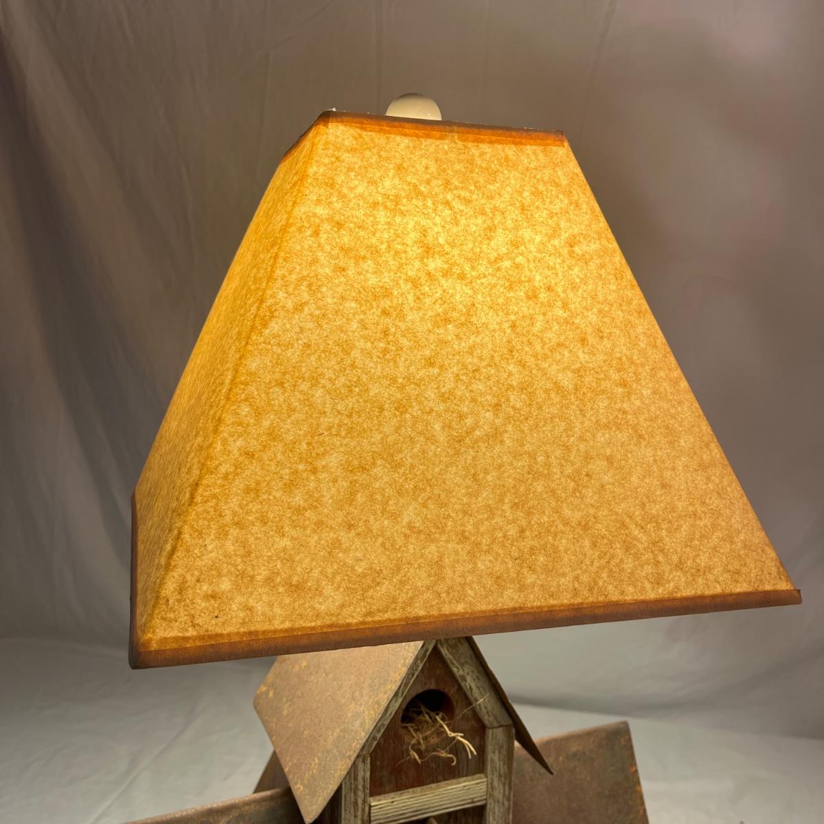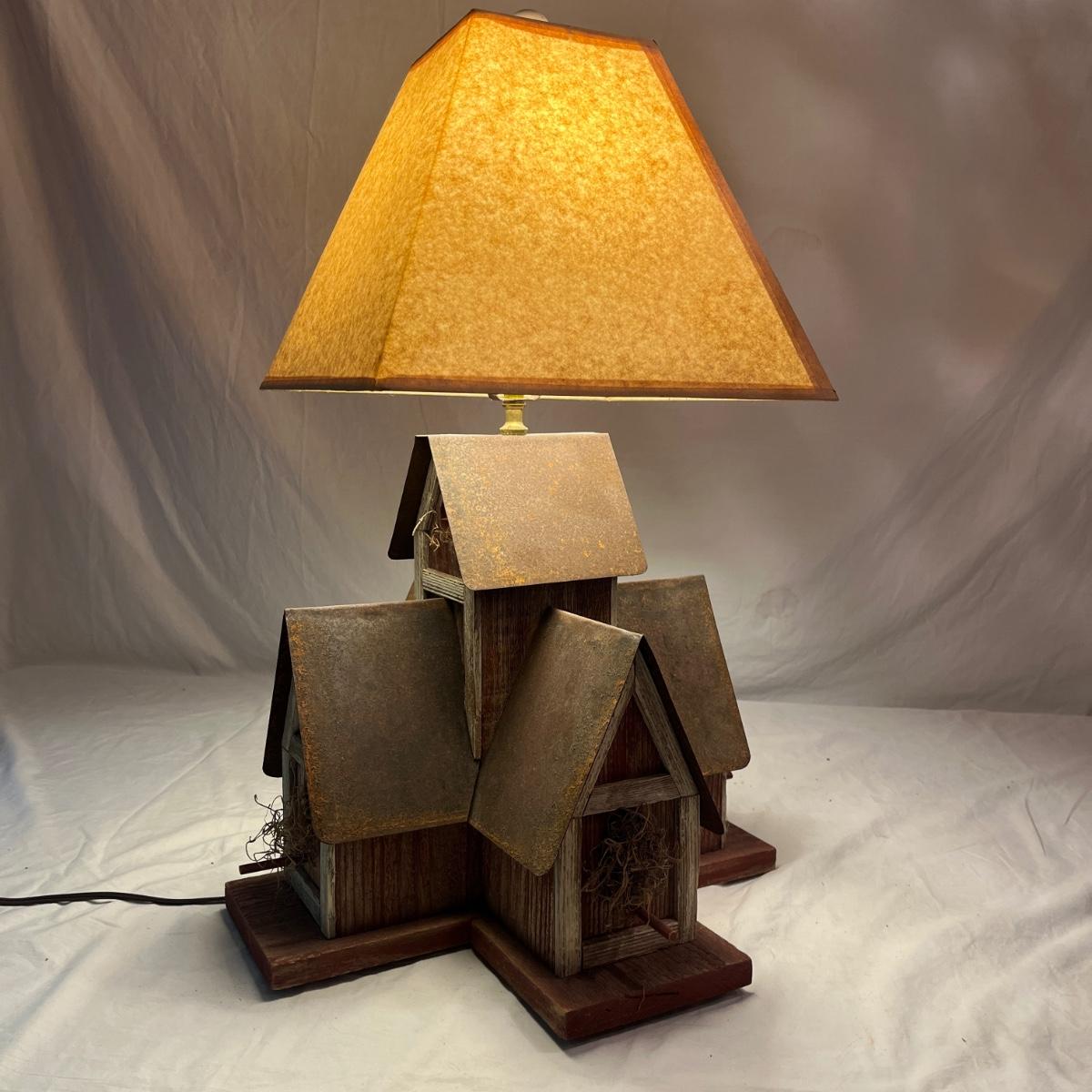 Lot includes a birdhouse table lamp that is made from wood and metal. Lamp measures 16” x 16” x 25”H. Lamp powered on when plugged in and has a on/off switch.