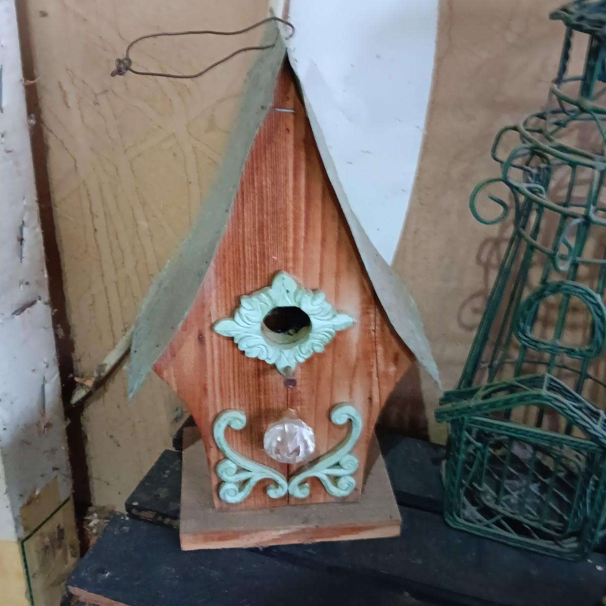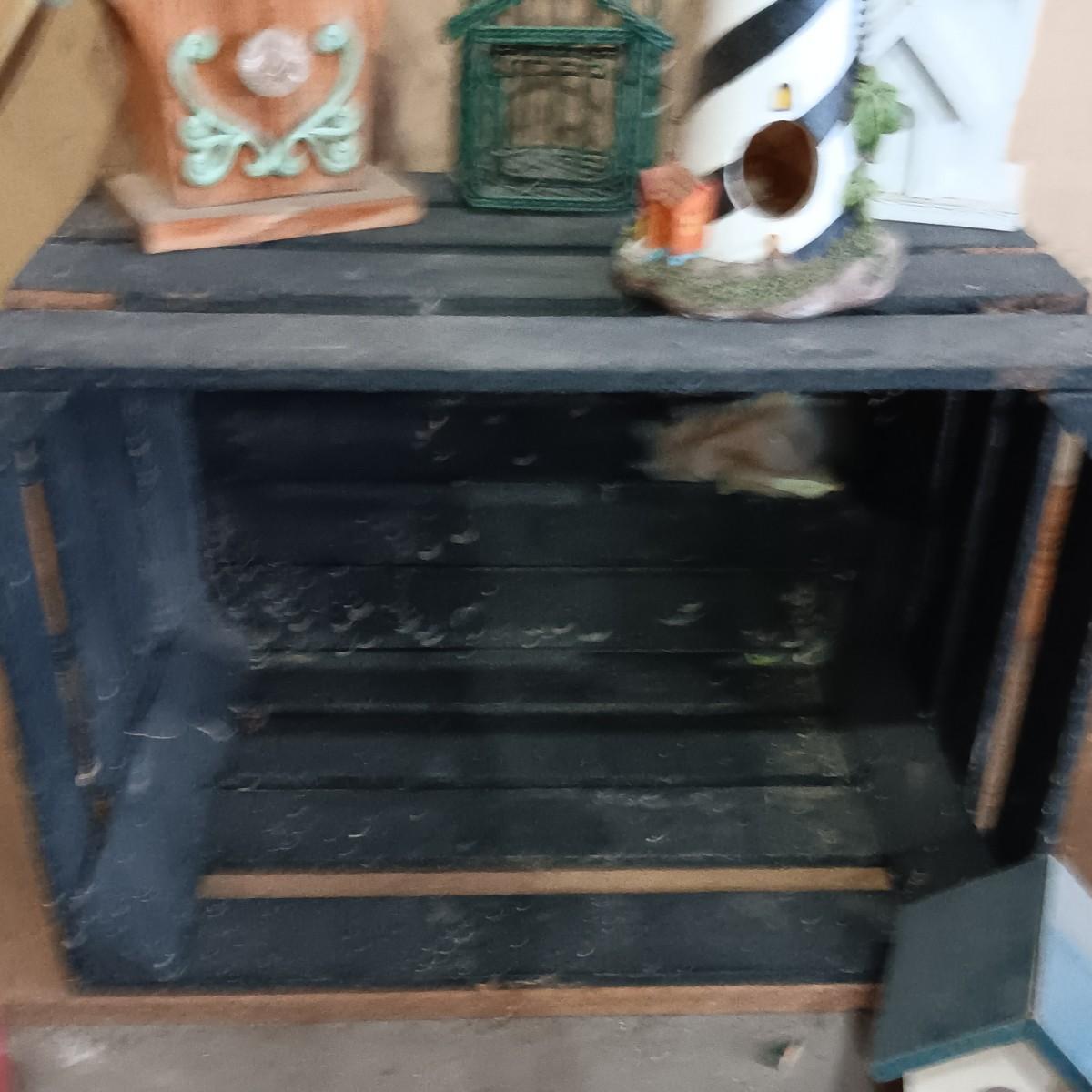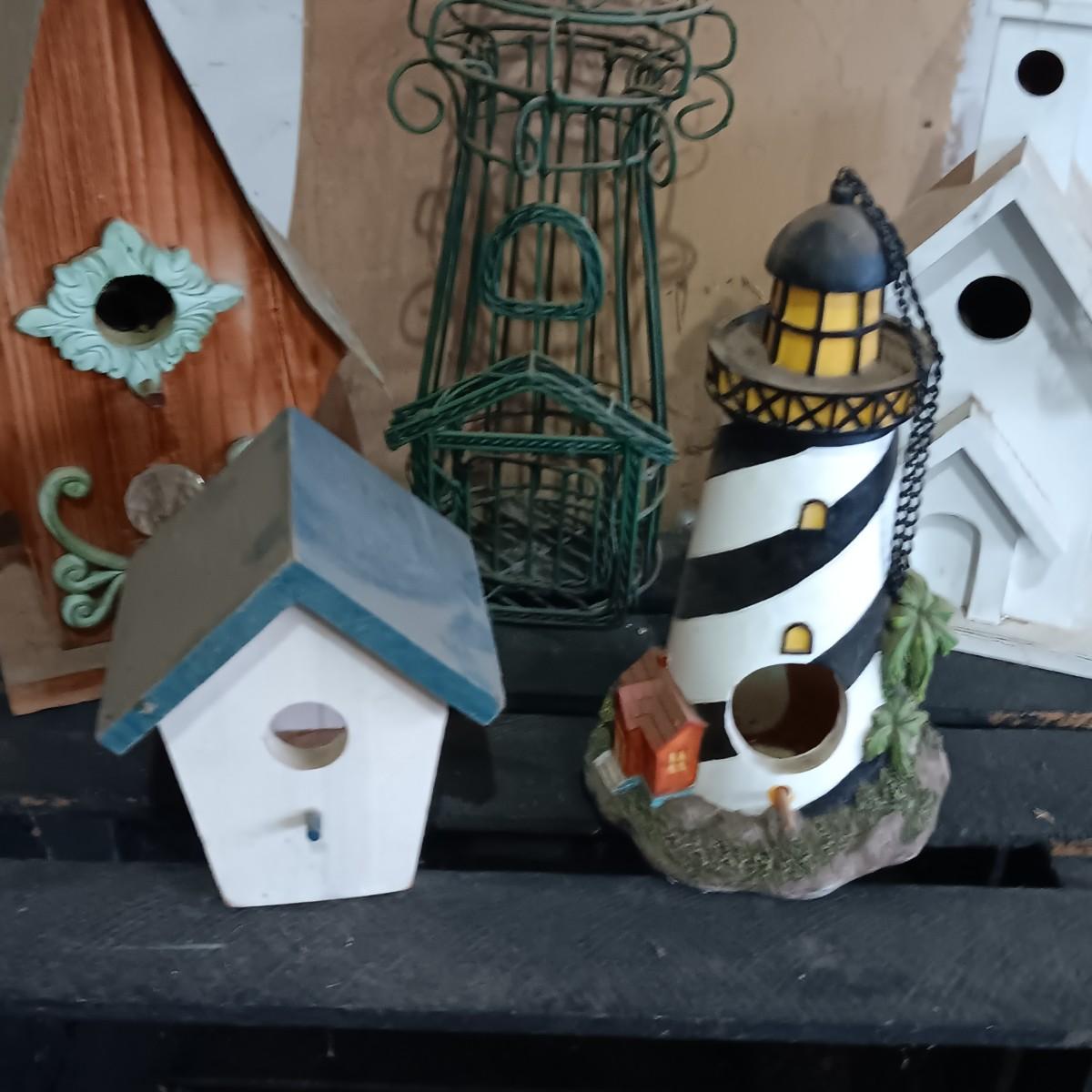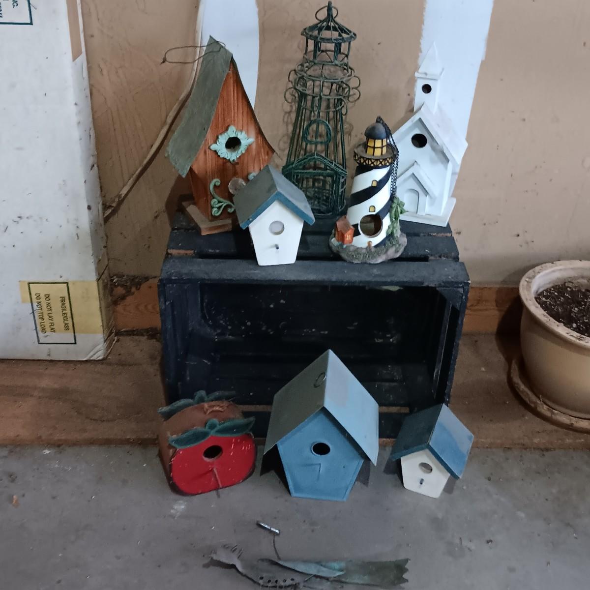 BIRDHOUSES, WINDCHIME AND WOOD CRATE
