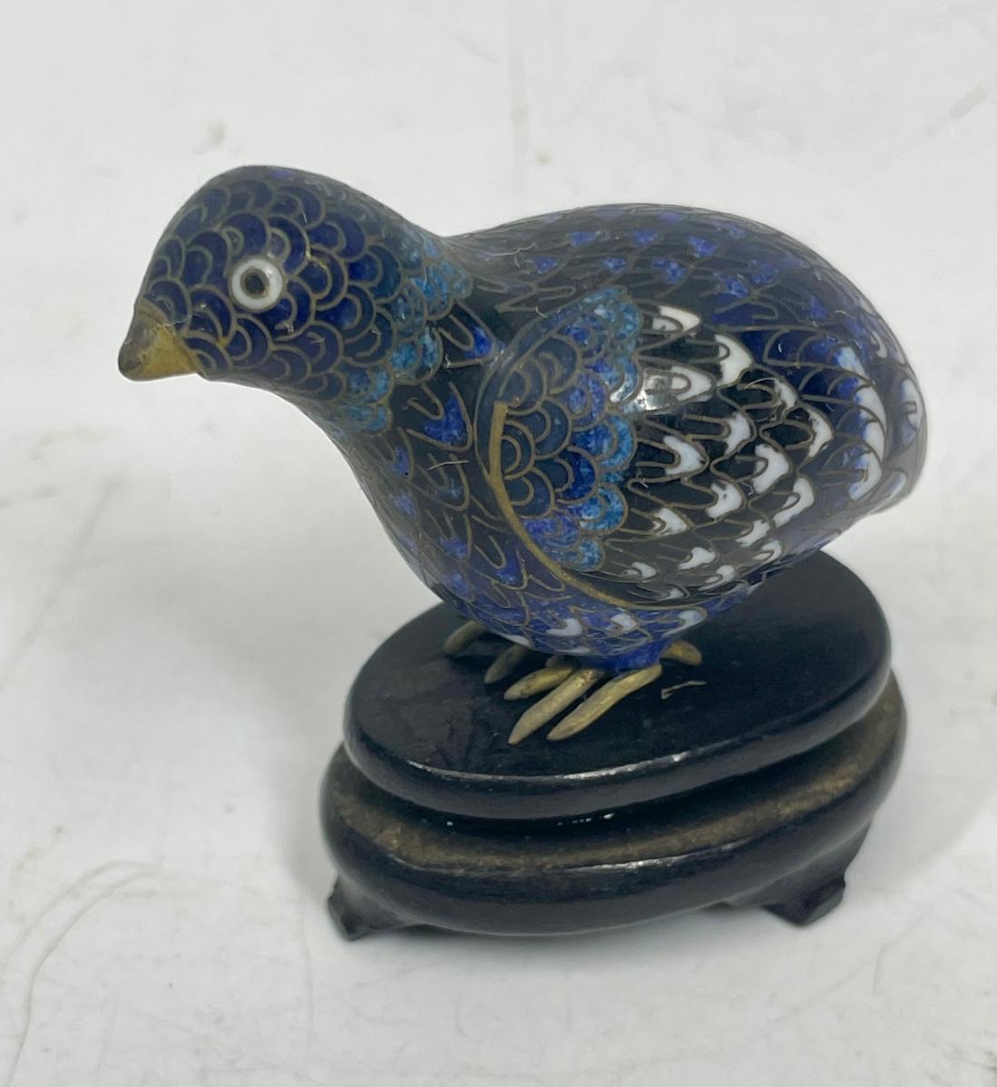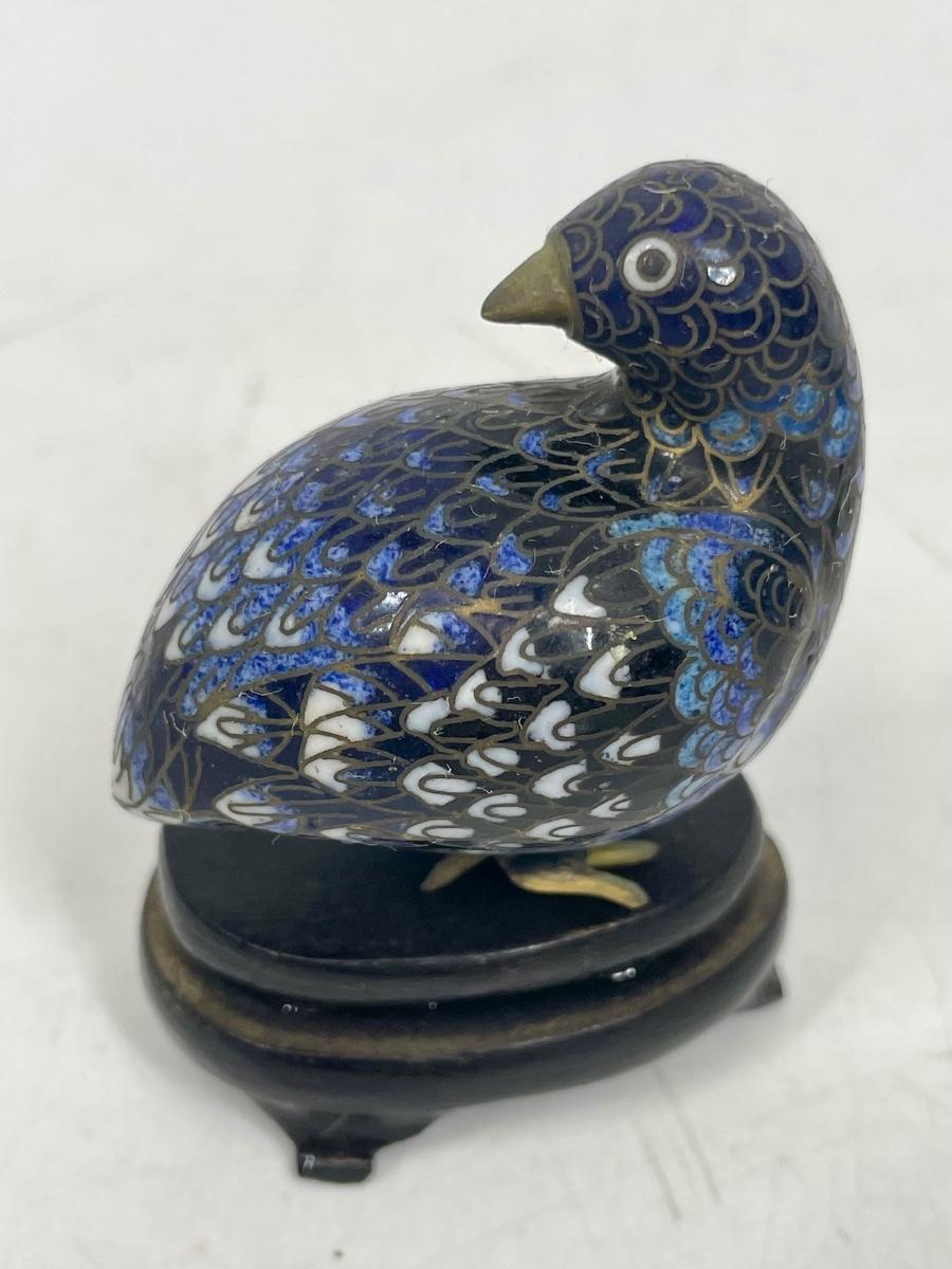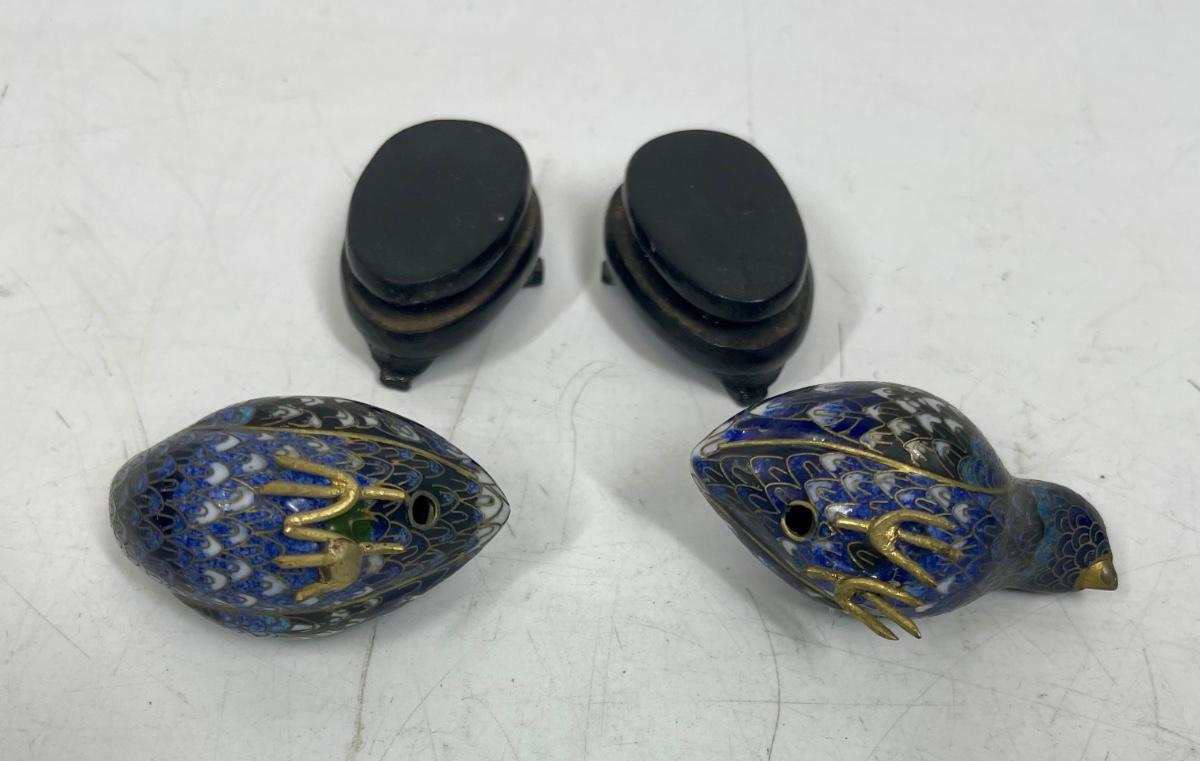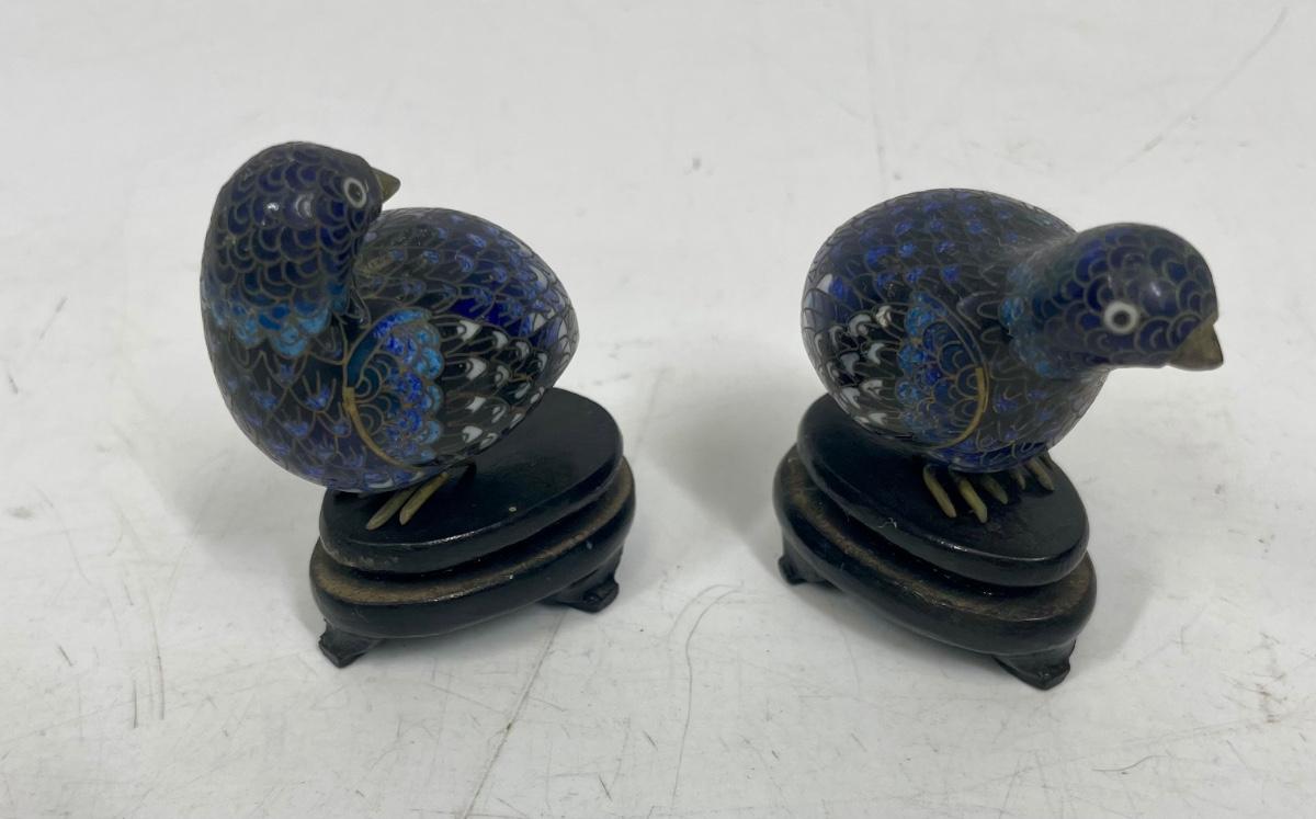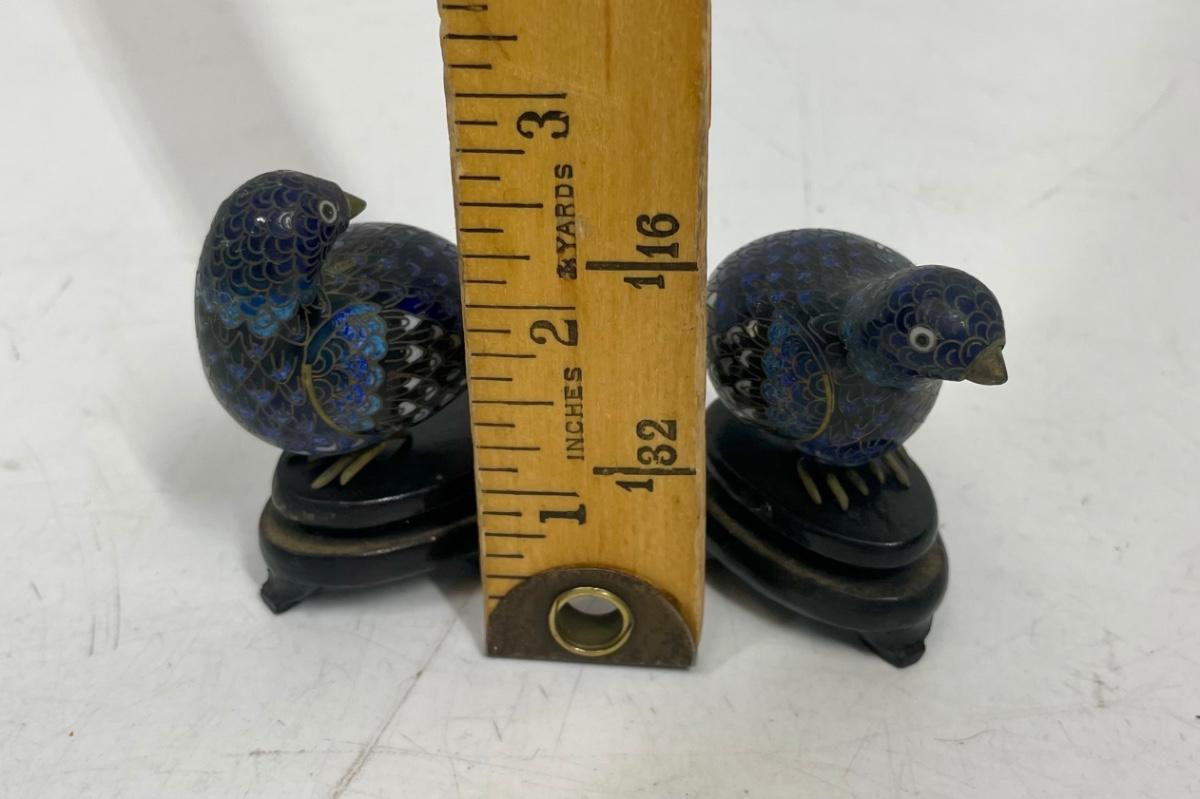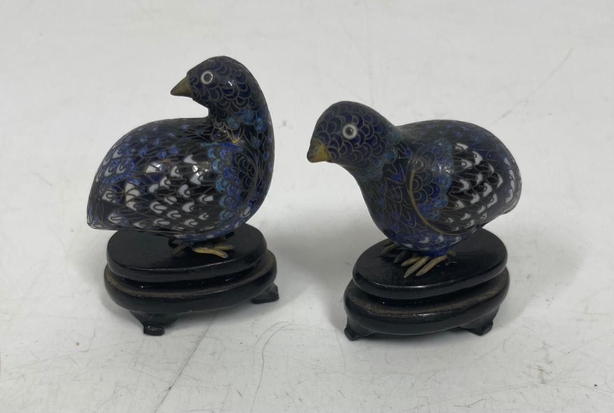 Most likely Chinese origin. Blue, black and white plumage. With wood stands.