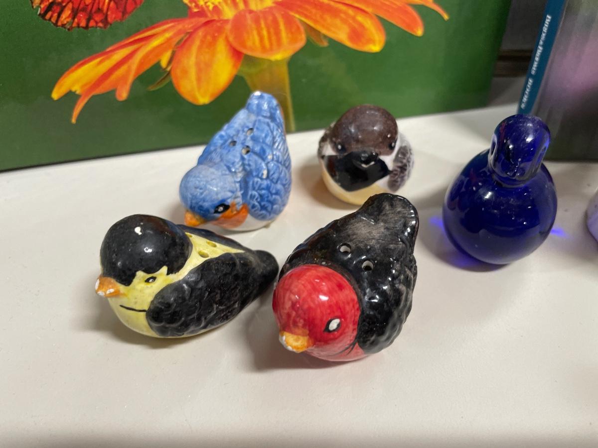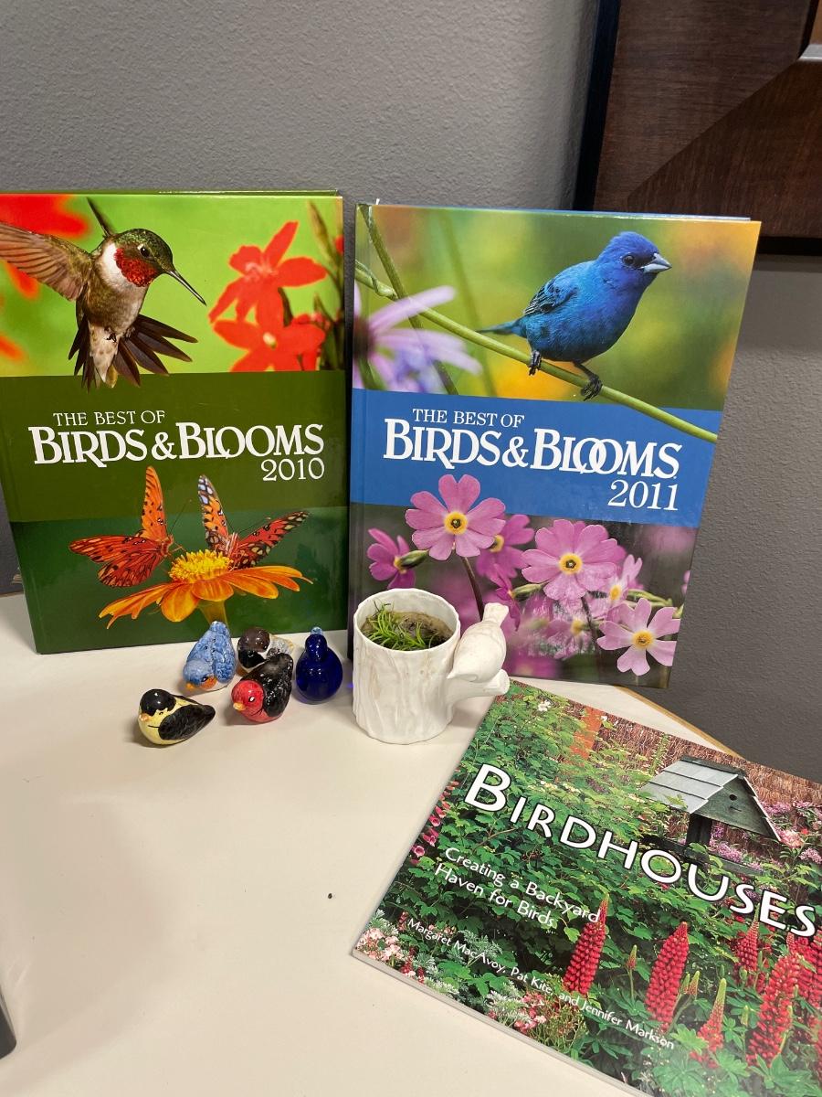 Birds and blooms books and small bird pepper shakers with cobalt bluebird
