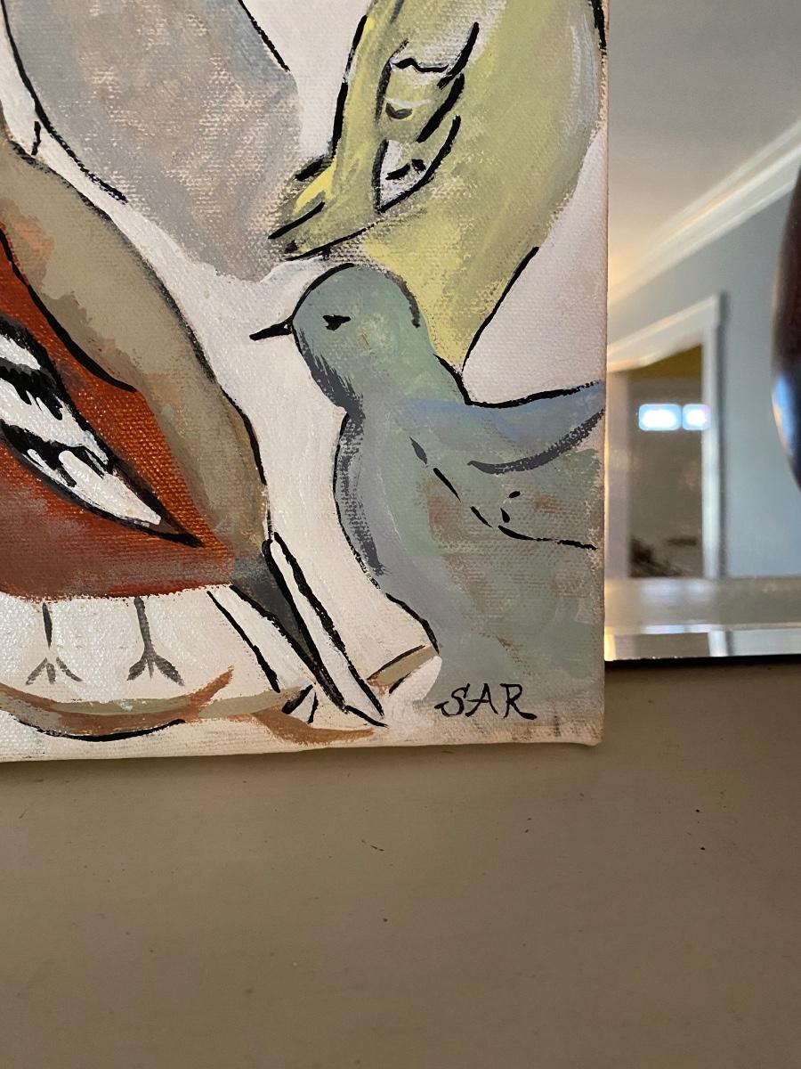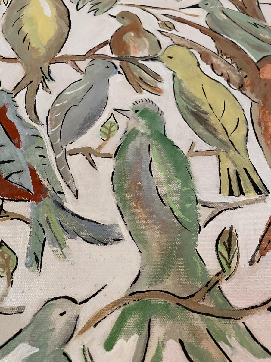 24x18 unframed painting on canvas of a variety of birds at rest. Playful yet restful depiction.
