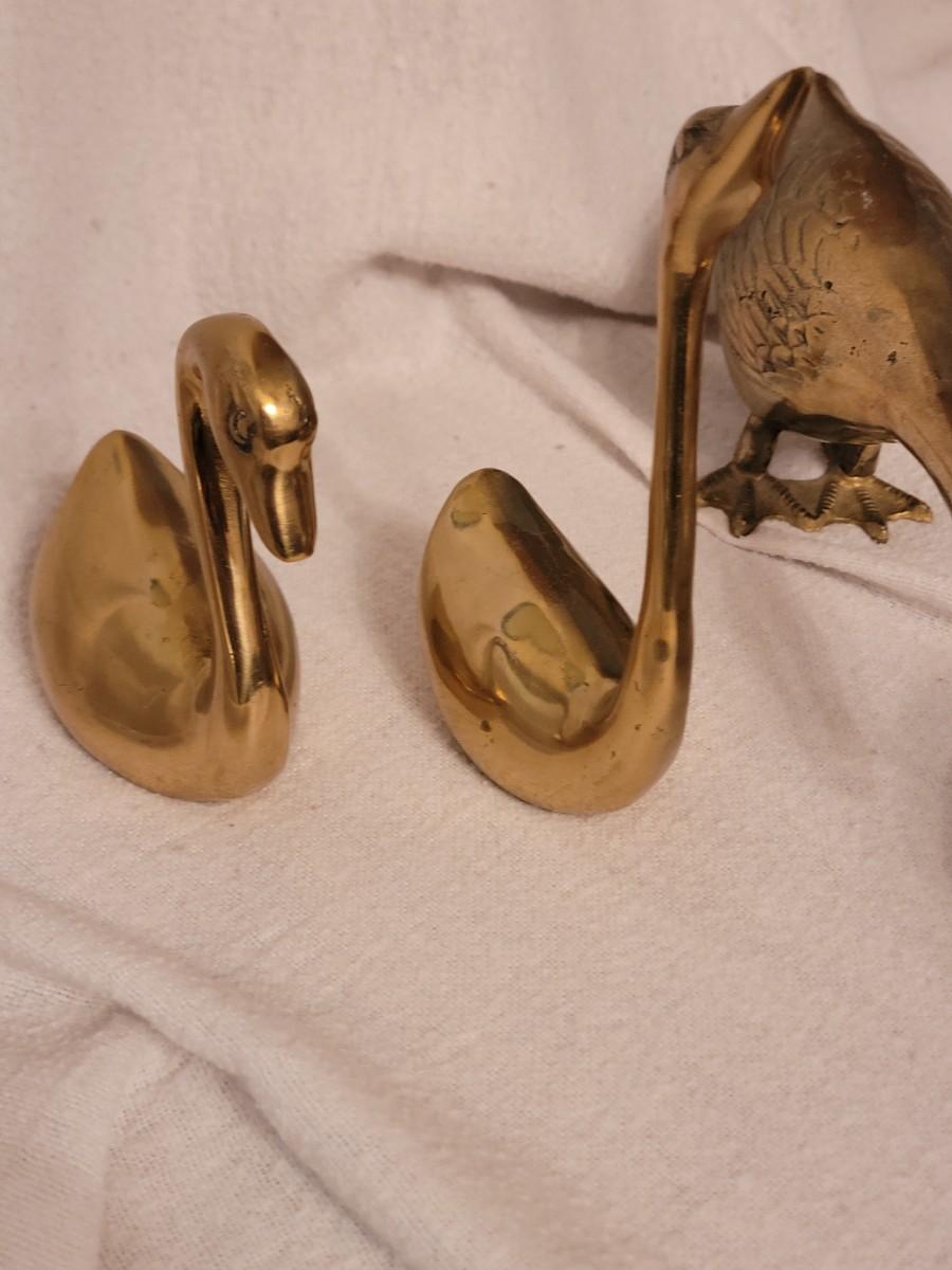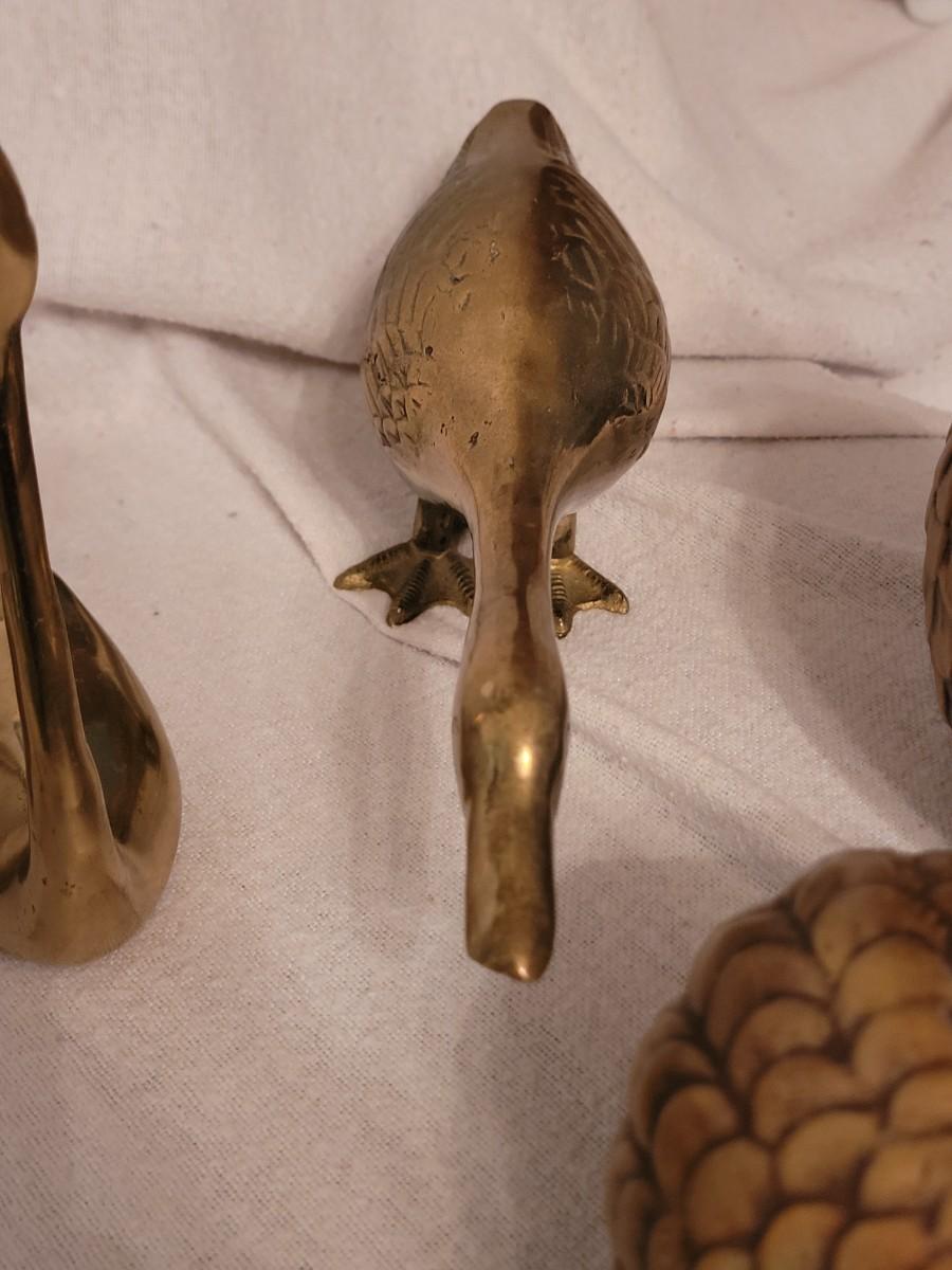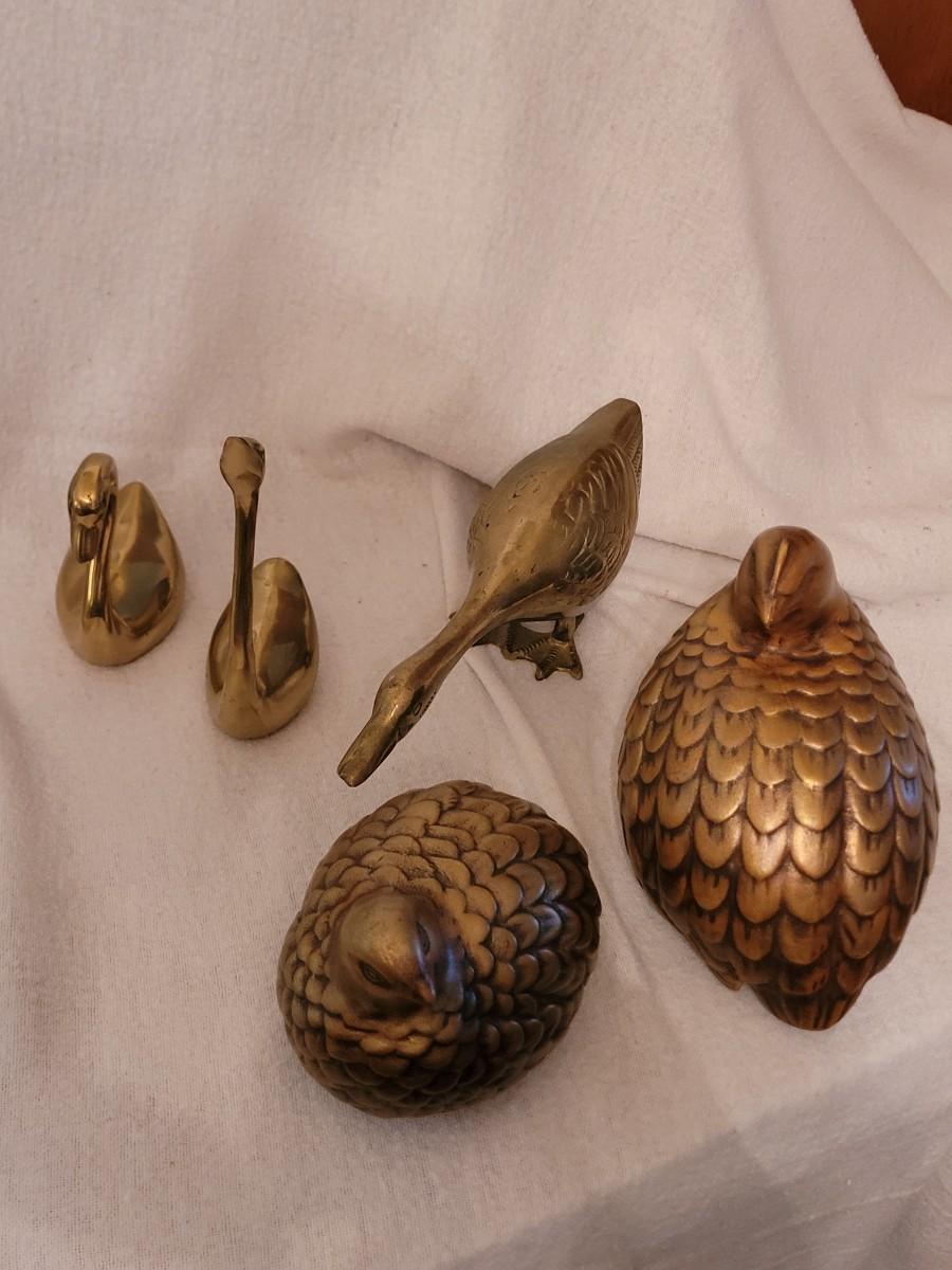 2 brass swans, 1 brass goose, and 2 ceramic sage hens