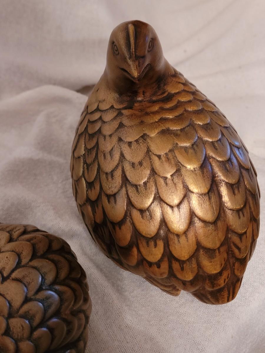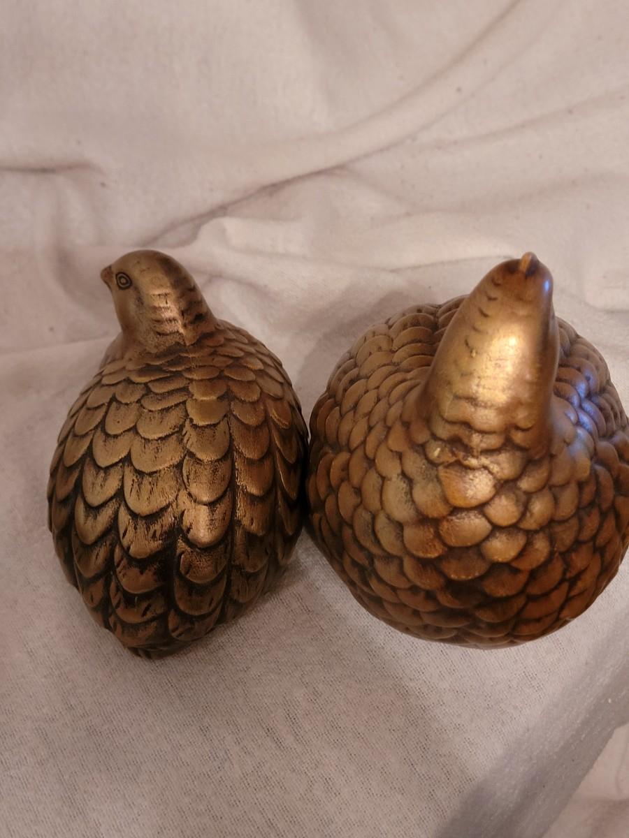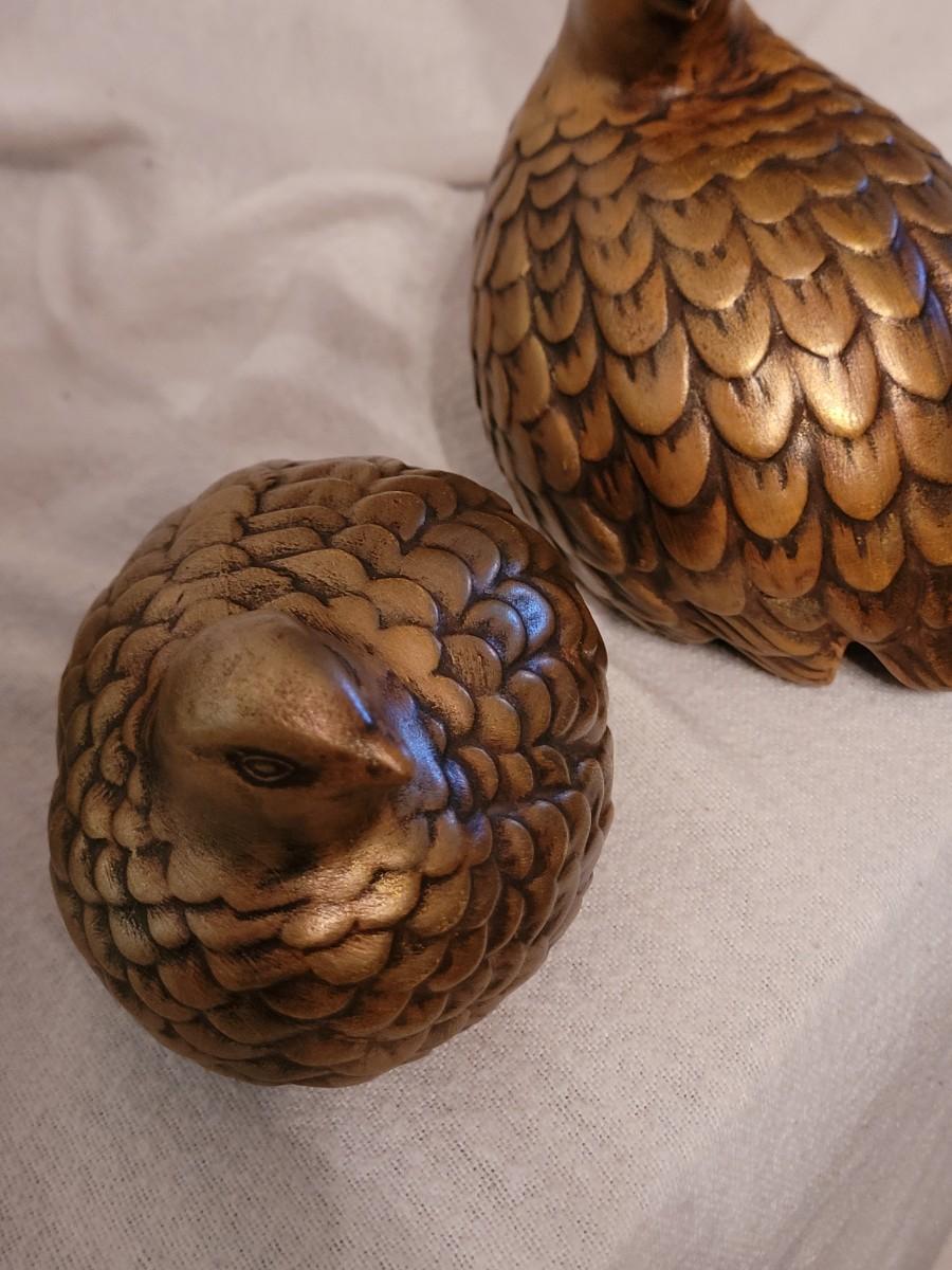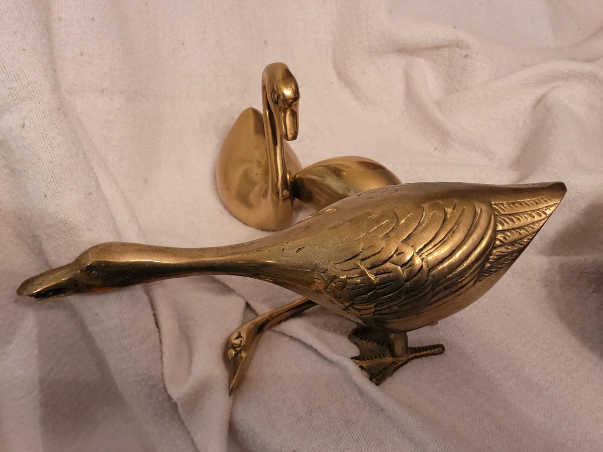 2 brass swans, 1 brass goose, and 2 ceramic sage hens