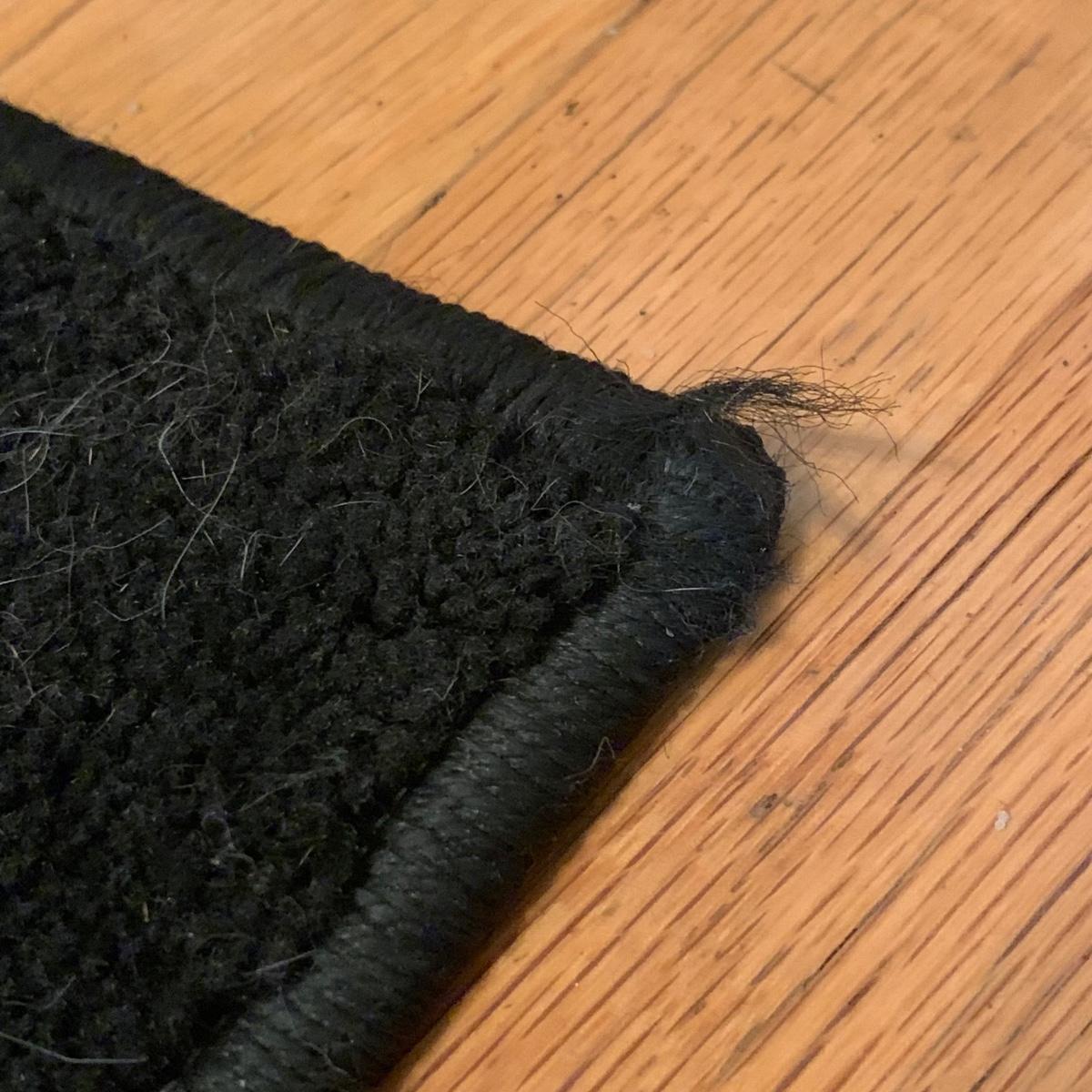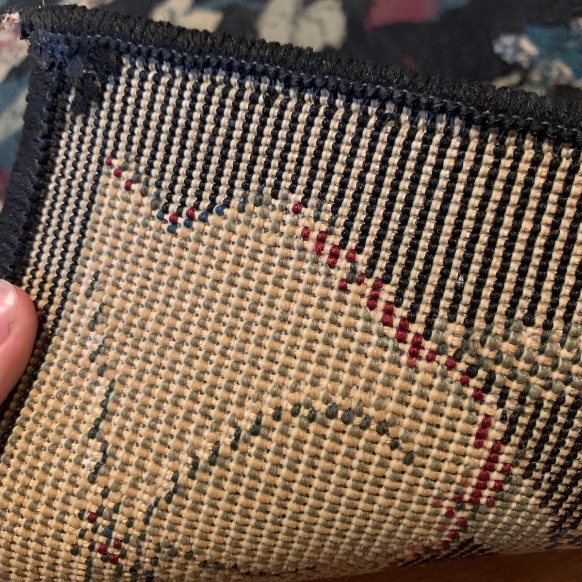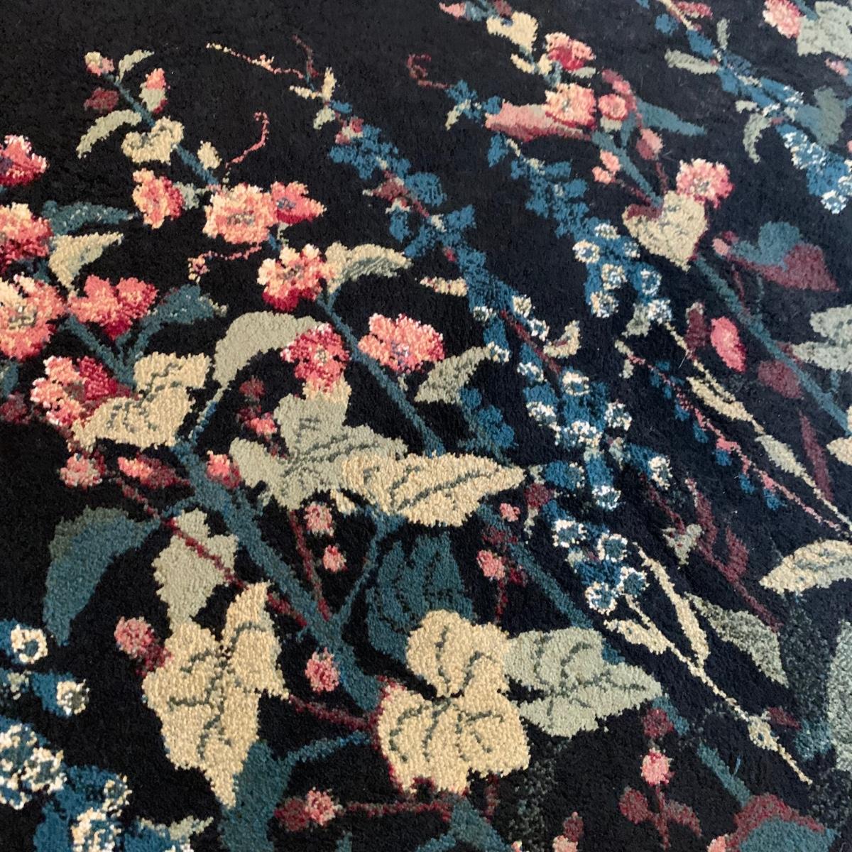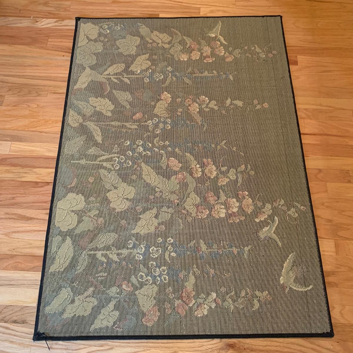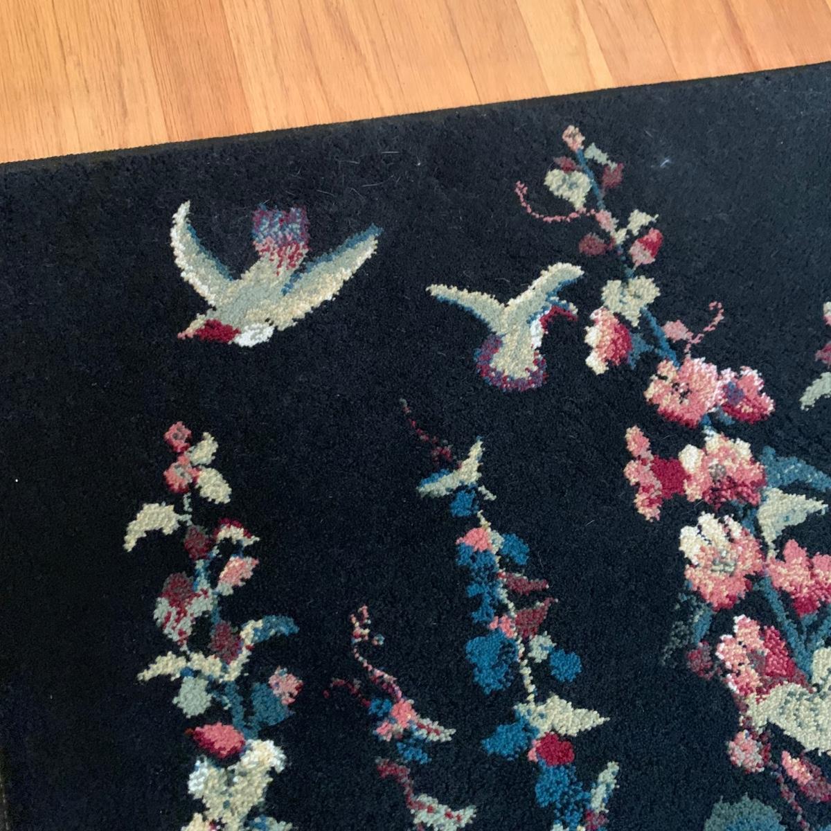Area rug with black background featuring flowers and birds. Rug measures 56” x 39” (approximately 4.5’ x 3.25’). There is no tag stating the manufacturer or the fiber content. There is some pet hair on the surface that is cleanable. There is slight fraying on one corner.