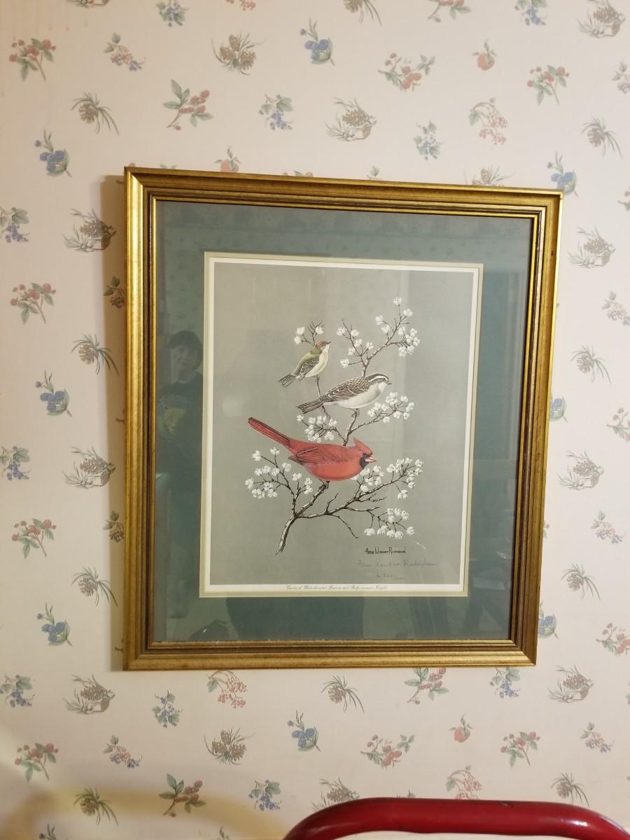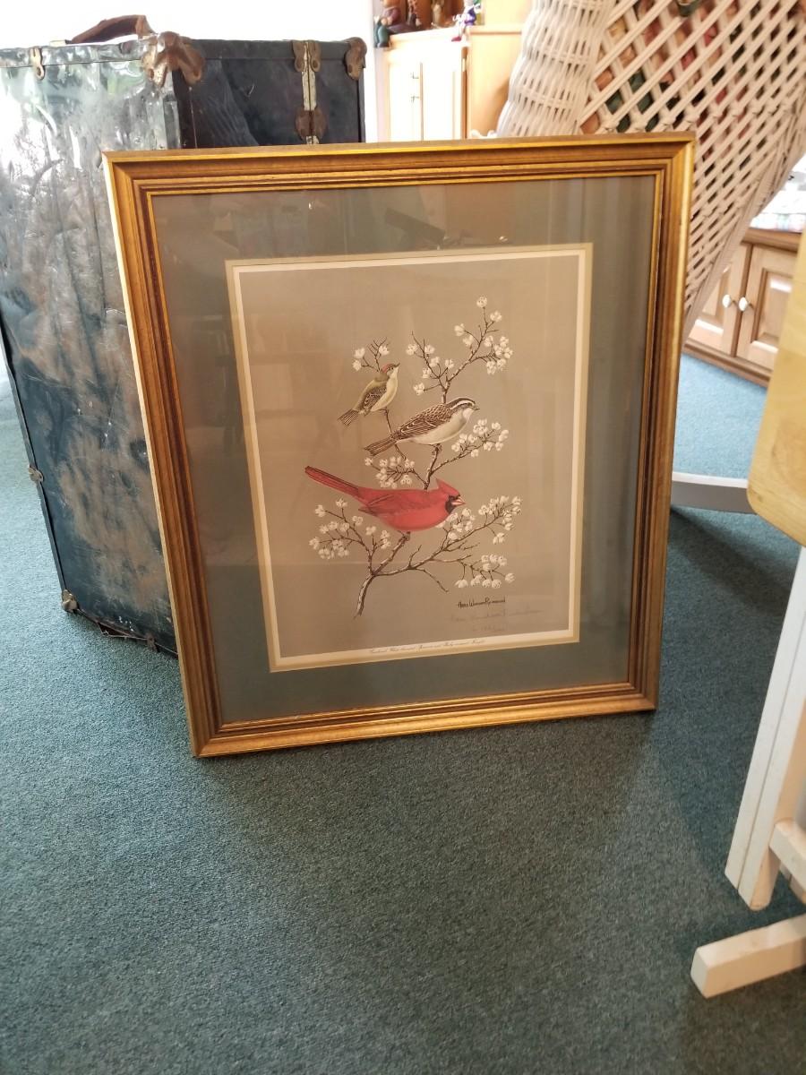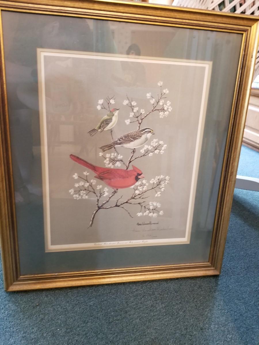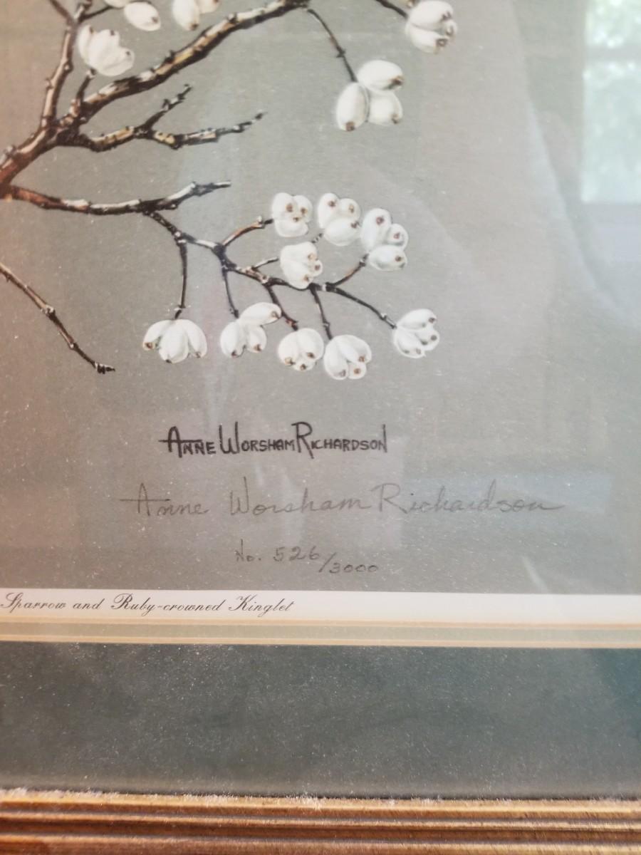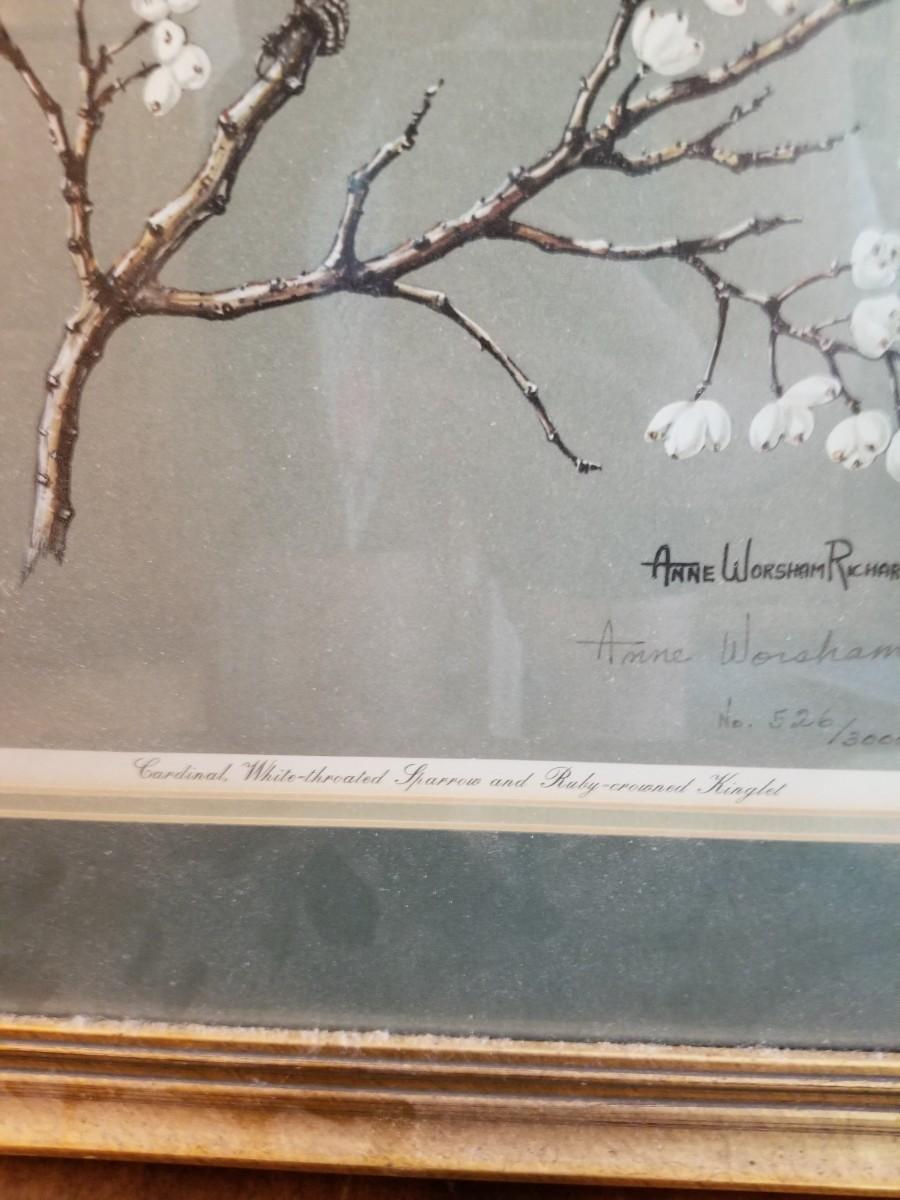 Cardinal, white throated sparrow and ruby crowned kinglet signed Anne Worsham Richardson #526/3000, 23"x27"
