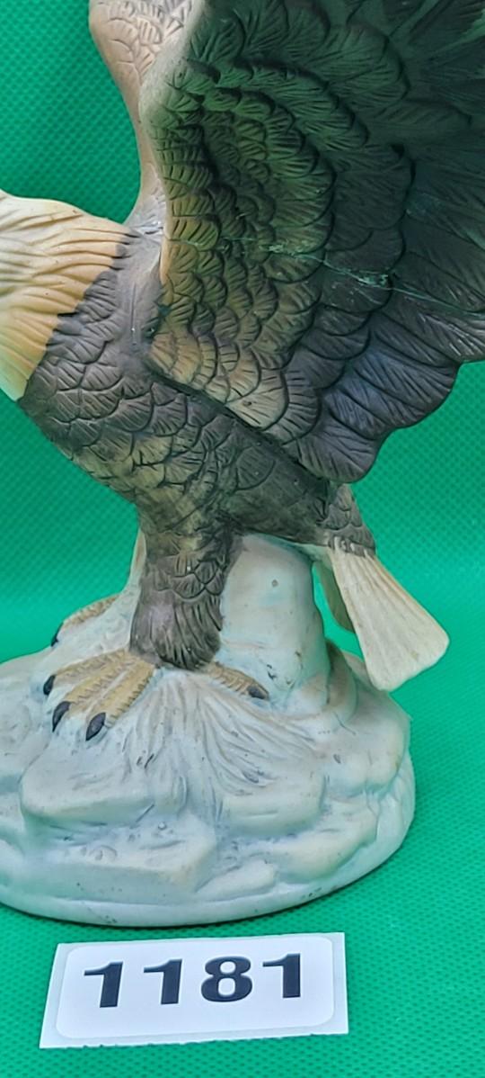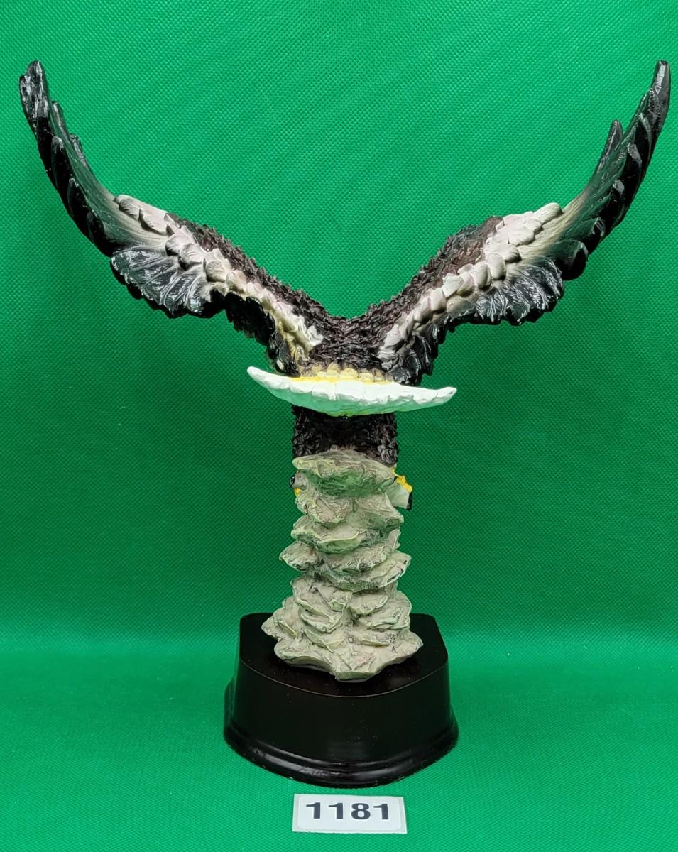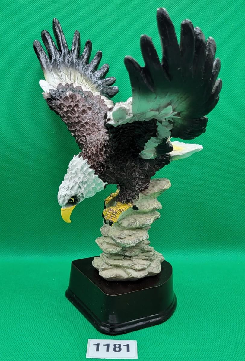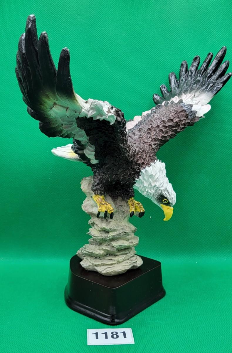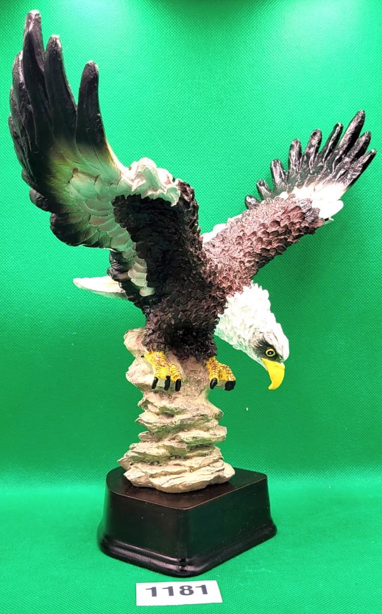 Eagle is in great condition and is larger. We had taken the photos inside of our 16"x16" light box and the eagle about reached the top of it. We didn't get actual measurements on it. It will come in its own styrofoam box.