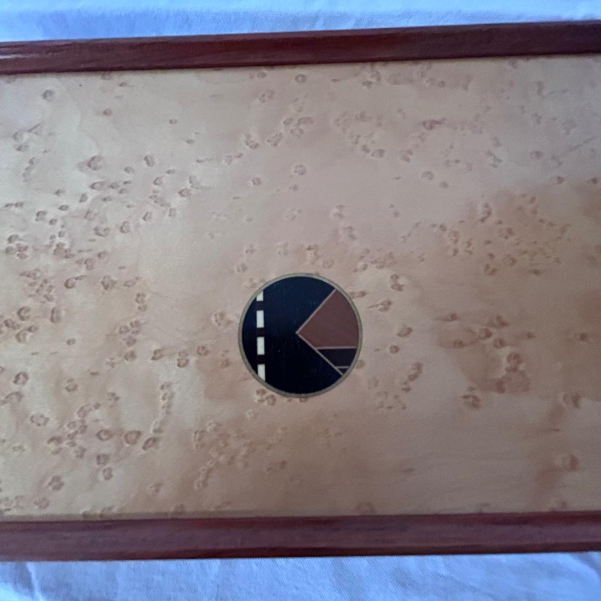 This beautiful jewelry box appears to be hand made but no marking. The birdseye maple top with intricate inlay work and dove tailed corners makes this a wonderful statement piece measuring 13” x 6.5” x 3”H. The gray cushioned felt lining and ring pocket along the back are perfect for those special jewelry pieces. Shipping available.