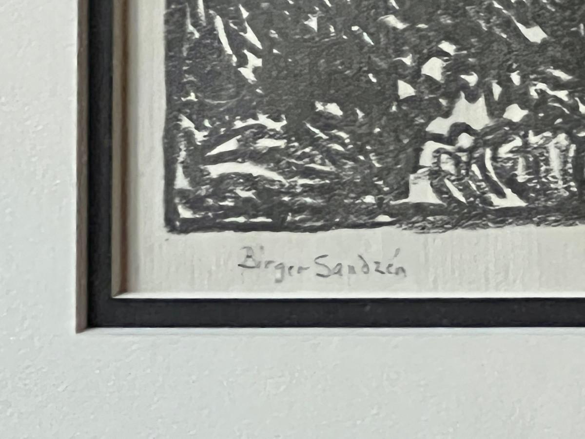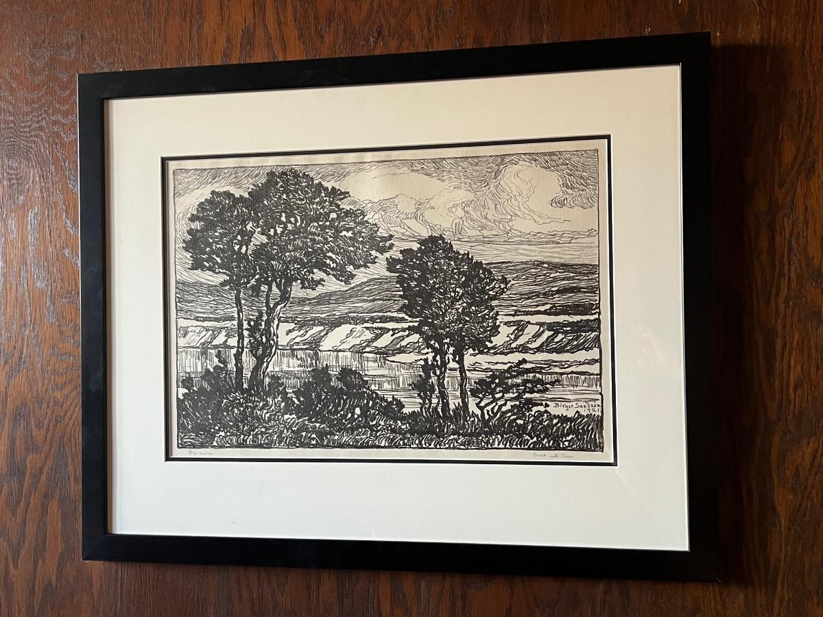 DESCRIPTION: The subject item is a large, original, signed fine art print by noted and listed Swedish American artist, Birger Sandzen. The artist has rendered a vertical landscape with low hills at the horizon. A cutaway bank frames the elongated section of creek with reflecting waters. Closer to the viewer are a few small Cottonwood trees.