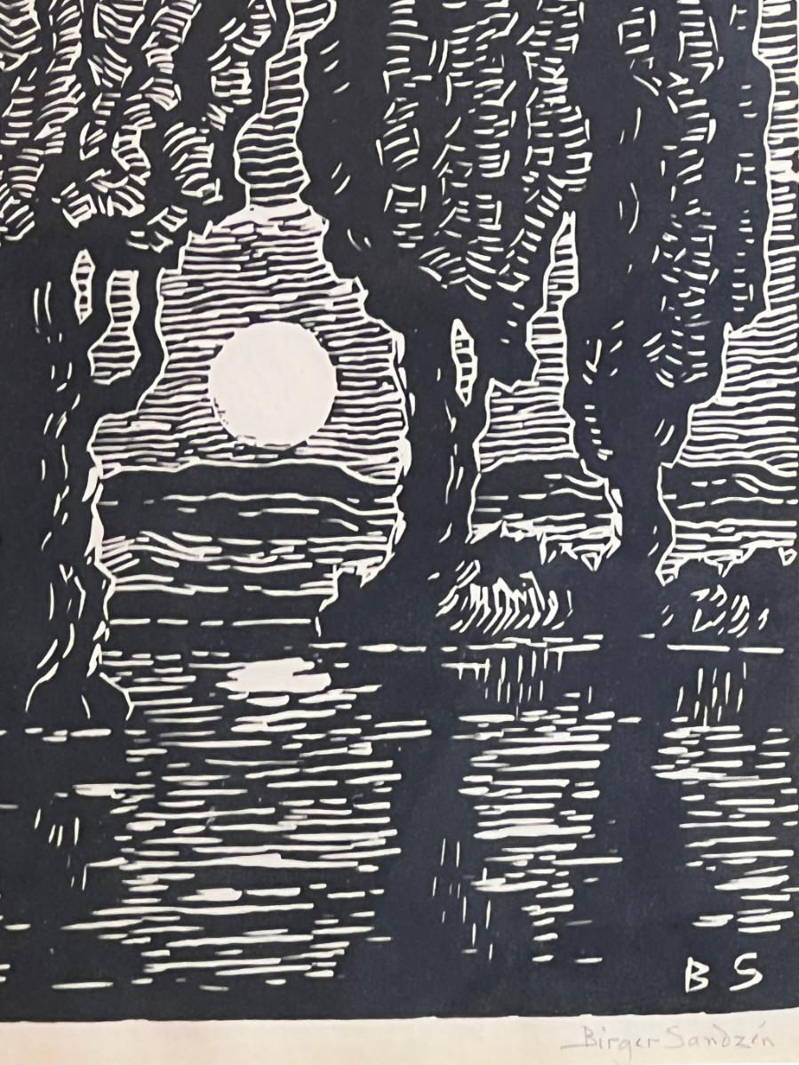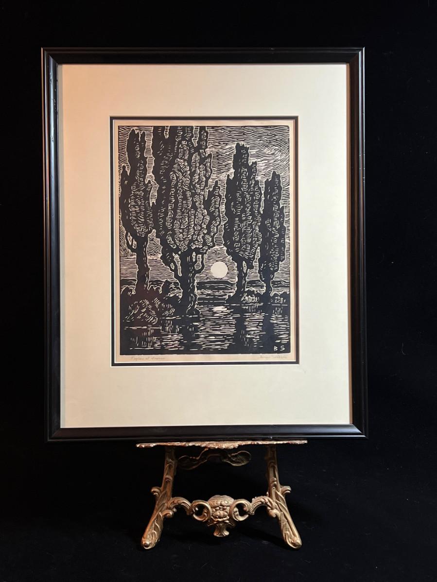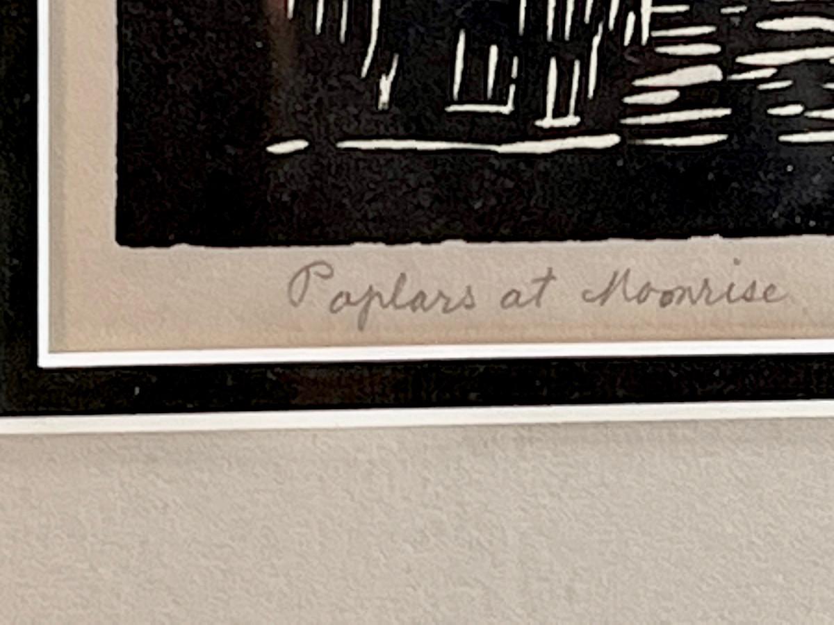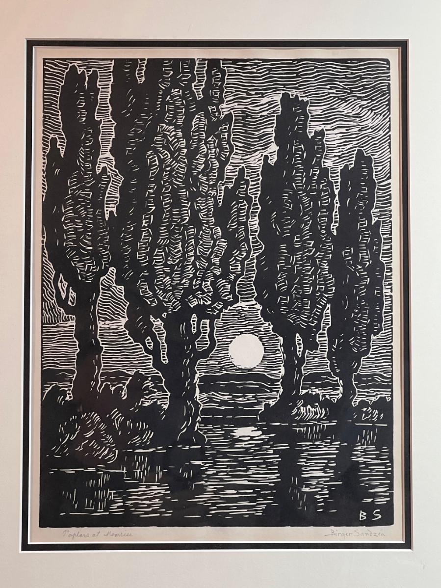 DESCRIPTION: The subject item is an original, signed fine art linoleum print by noted and listed Swedish-American artist, Birger Sandzen. The artist has rendered a stand of four tall poplar trees bathed in the soft light of a rising moon on the horizon.