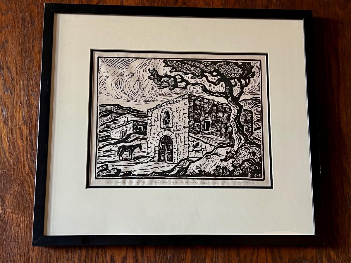 DESCRIPTION: The subject item is an original, signed, fine art print by noted and listed Swedish American artist, Birger Sandzen. The artist has rendered a square, stone block structure with arched window and door frames. An old horse is posed out front.