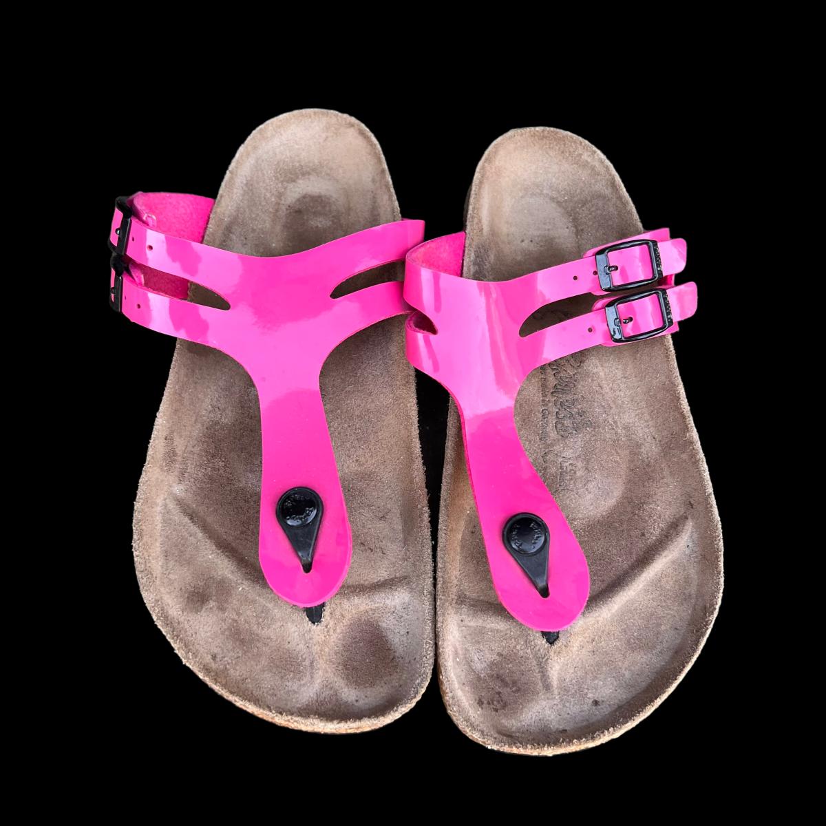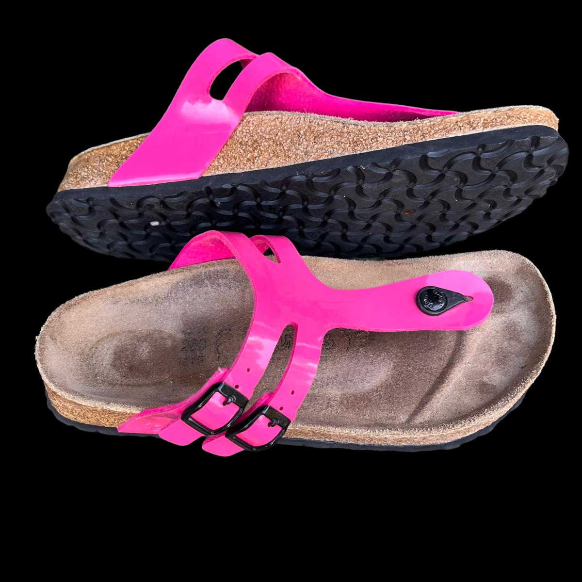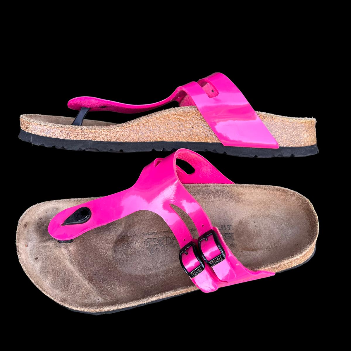 The Gizeh - a modern thong sandal from BIRKENSTOCK. The Gizeh is a proven classic with signature support and a refined, minimalist style.  Anatomically shaped cork-latex footbed.  Upper: patent leather.  Footbed lining: suede.  Sole: EVA Details: thong with an individually adjustable metal tongue buckle.  Seem to be in good worn condition.  Please look at all the pictures closely to make your own assessment.