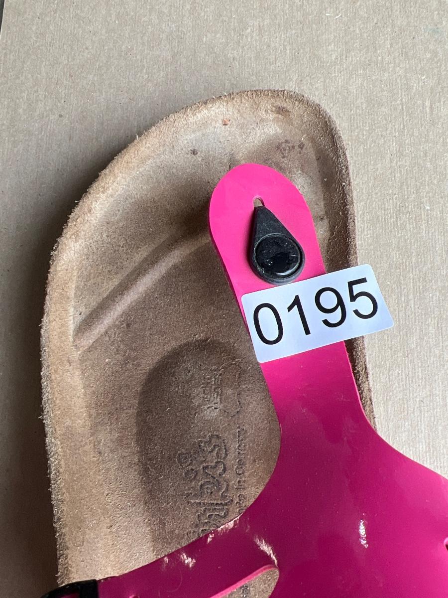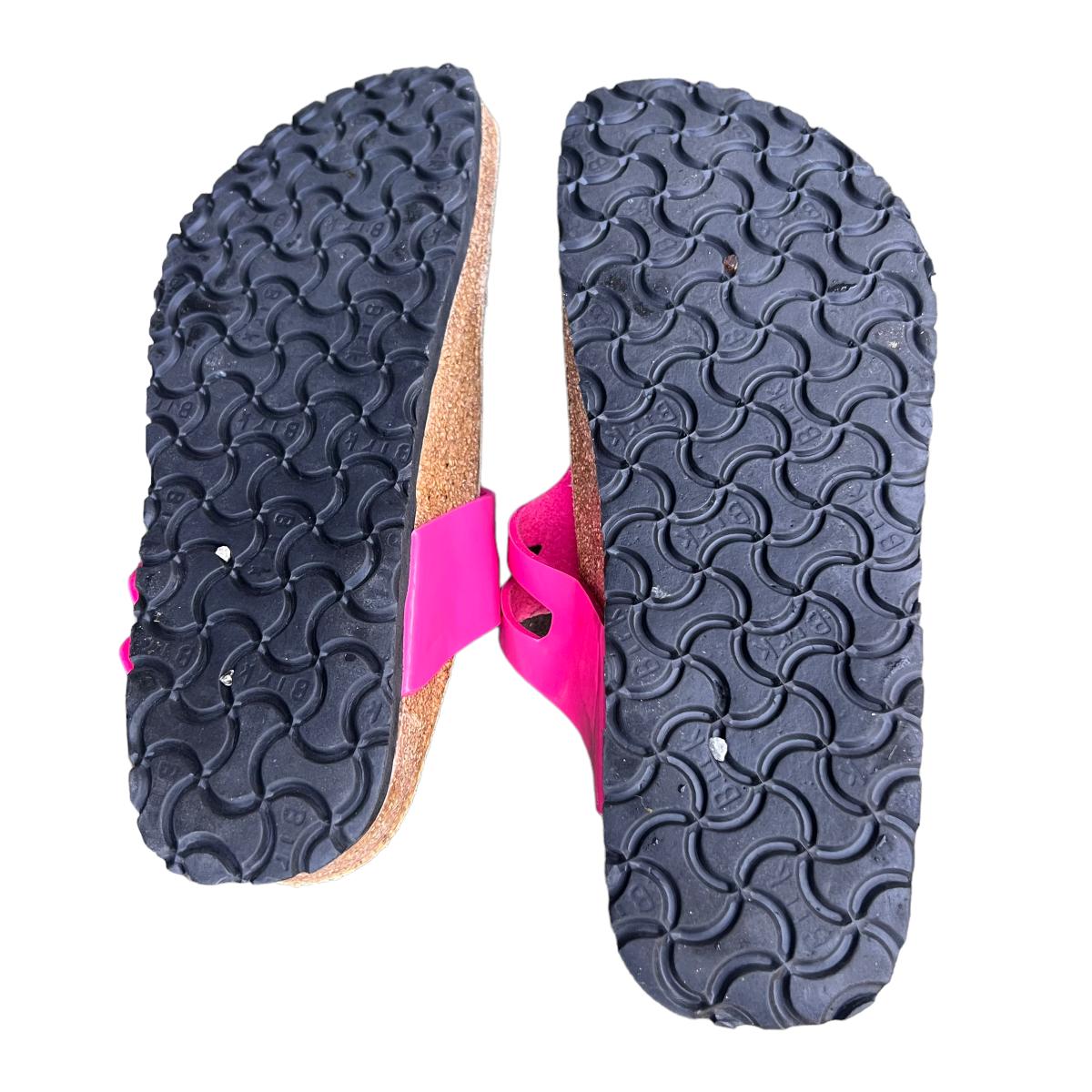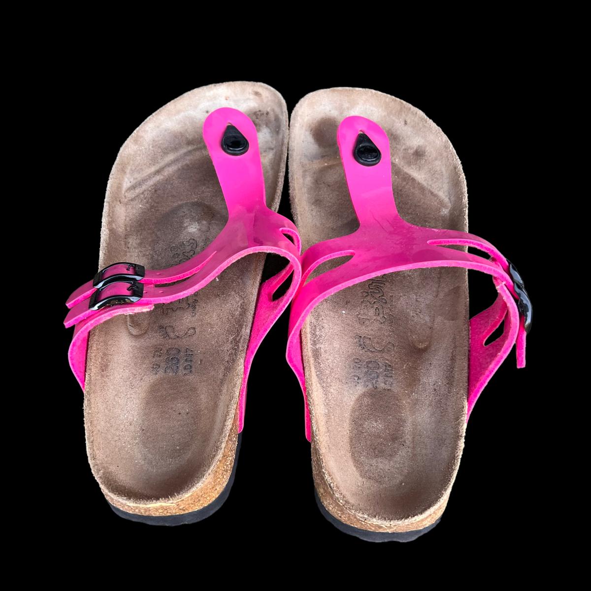 The Gizeh - a modern thong sandal from BIRKENSTOCK. The Gizeh is a proven classic with signature support and a refined, minimalist style.  Anatomically shaped cork-latex footbed.  Upper: patent leather.  Footbed lining: suede.  Sole: EVA Details: thong with an individually adjustable metal tongue buckle.  Seem to be in good worn condition.  Please look at all the pictures closely to make your own assessment.