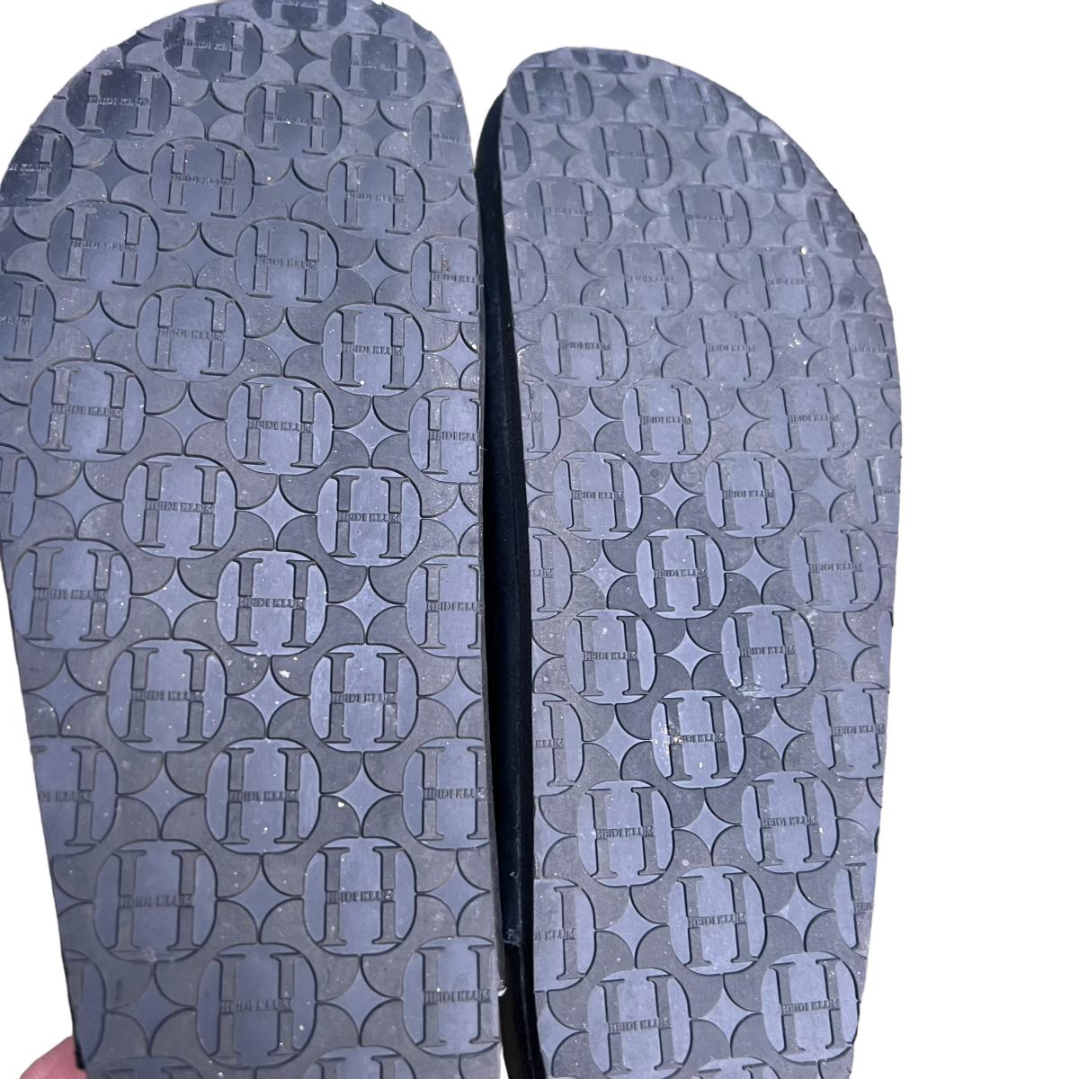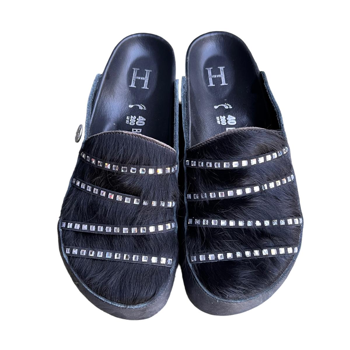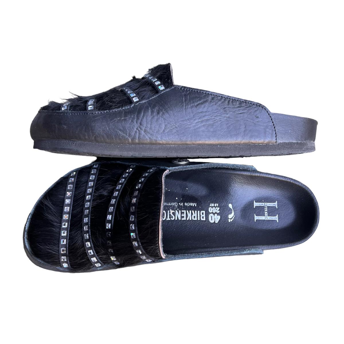 Leather, rhinestones and calf hair Birkenstocks from the Heidi Klum Collection. Not sure if they've been worn or not. In very good condition. Please look at all the pictures closely to make your own assessment.