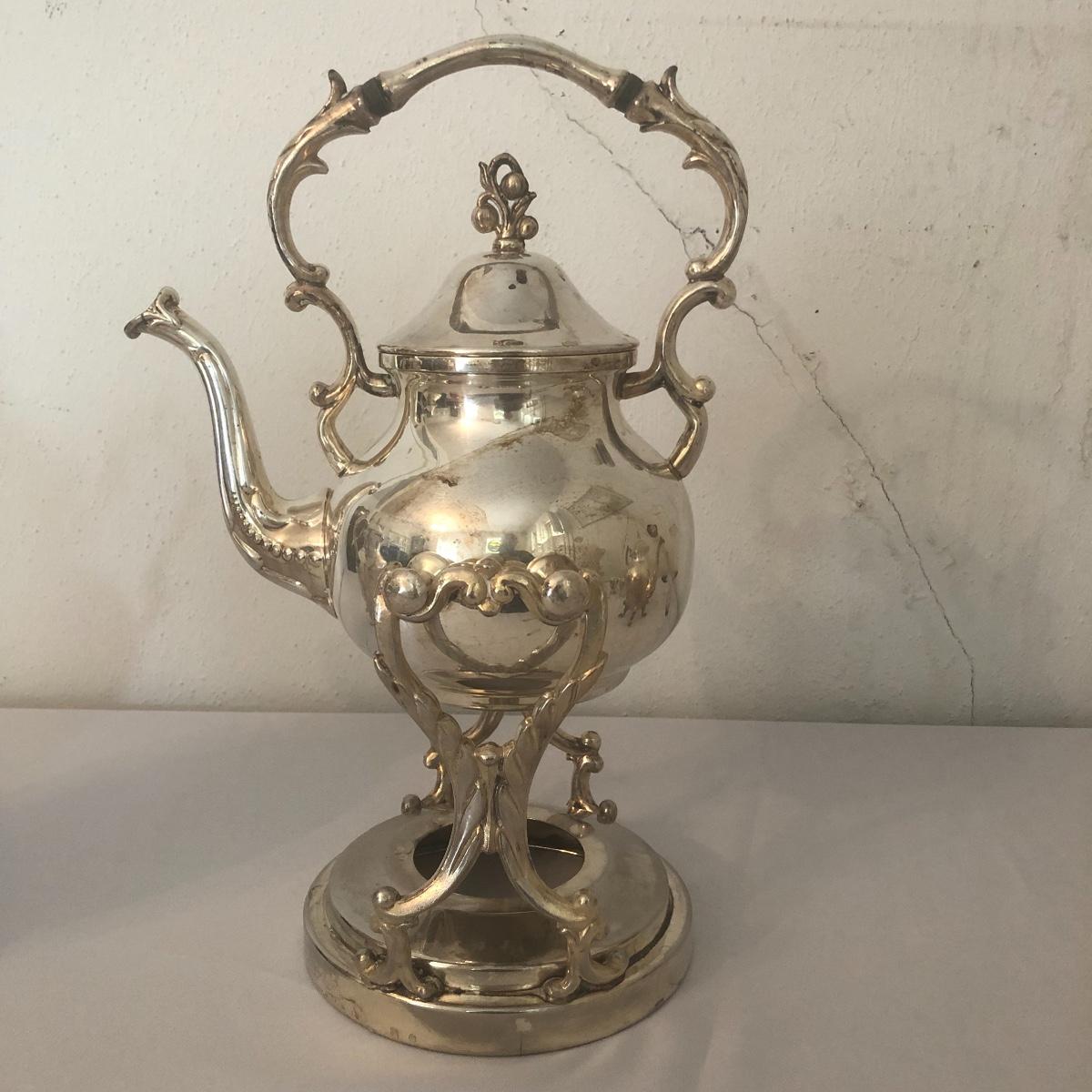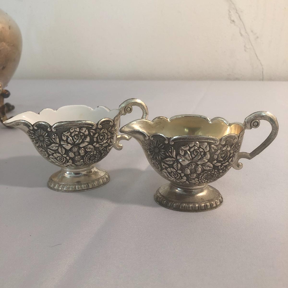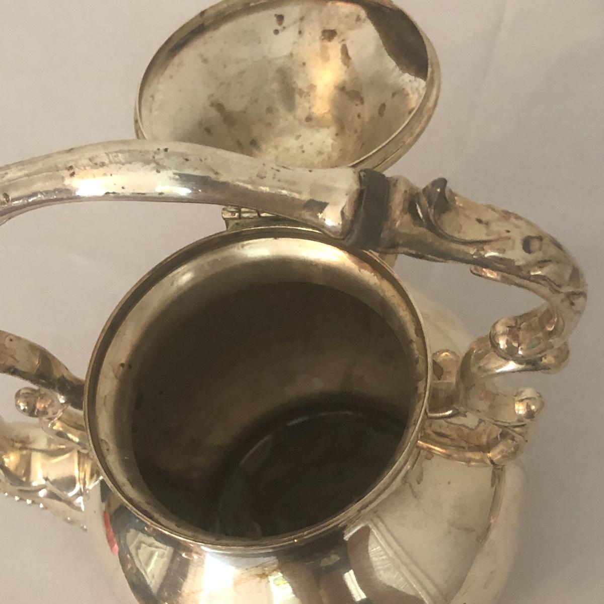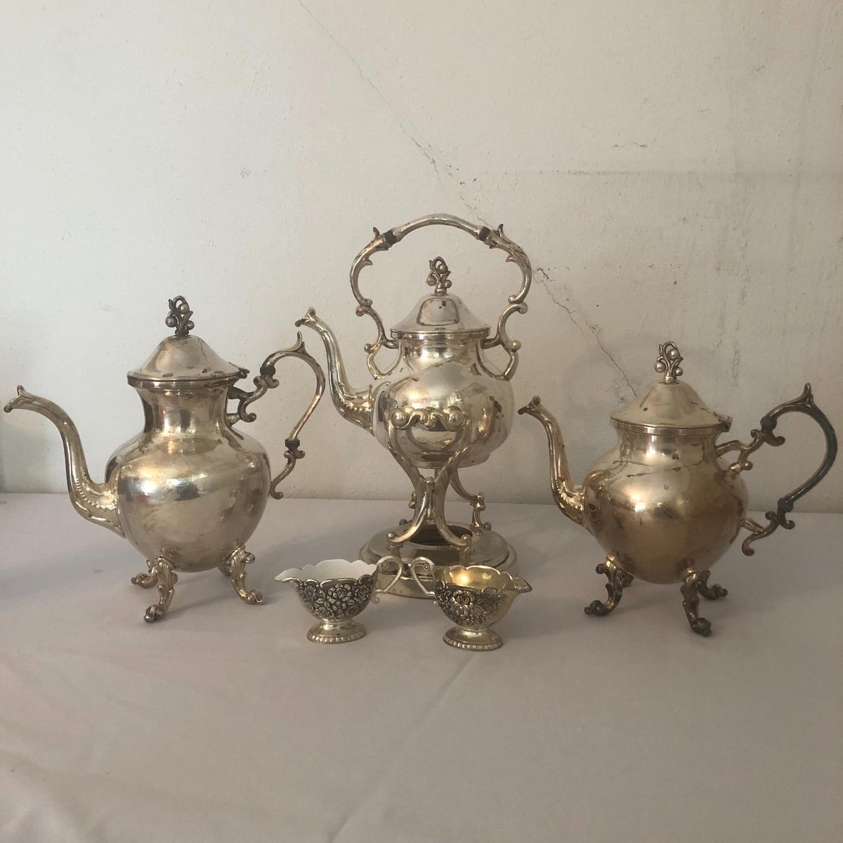 Three teapots by Birmingham Silver Co. that all have silver on copper stamps. Note the warming apparatus on the one is missing. Also included are two small pitchers, no marks found on these.