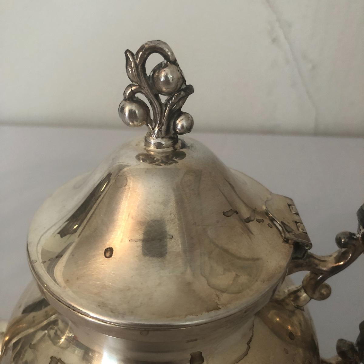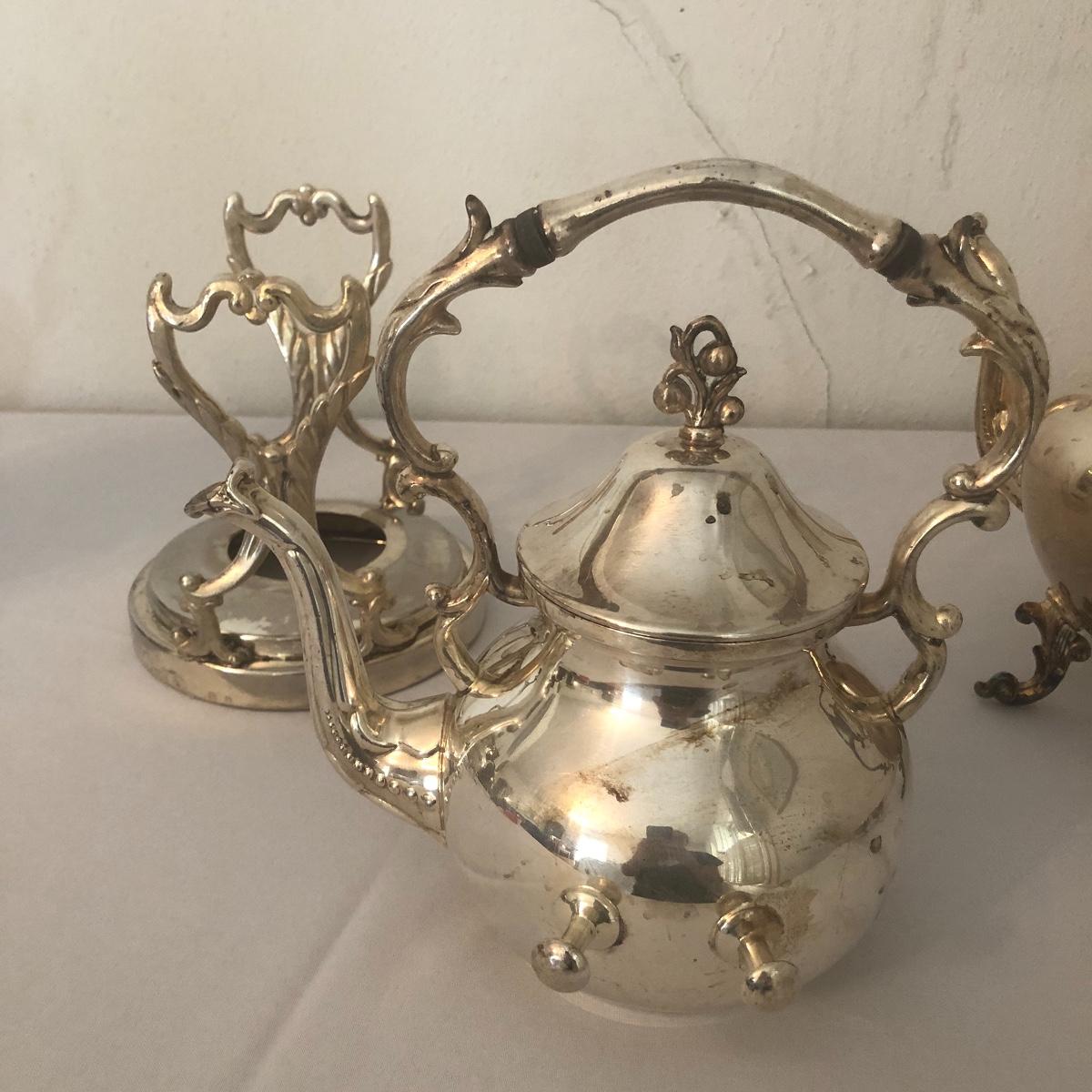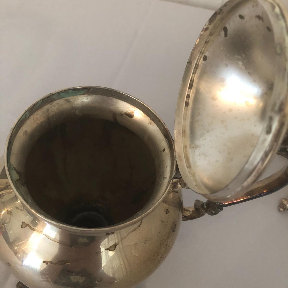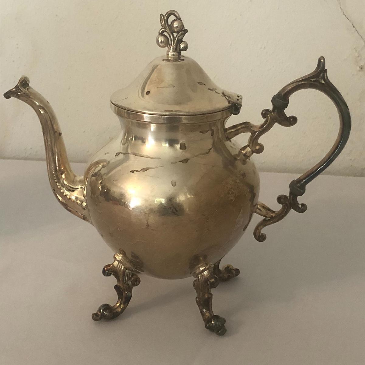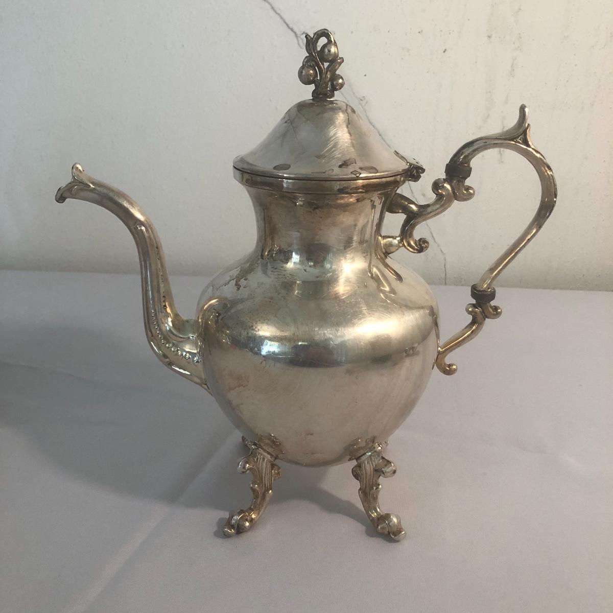 Three teapots by Birmingham Silver Co. that all have silver on copper stamps. Note the warming apparatus on the one is missing. Also included are two small pitchers, no marks found on these.