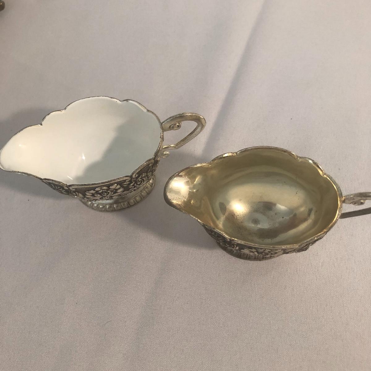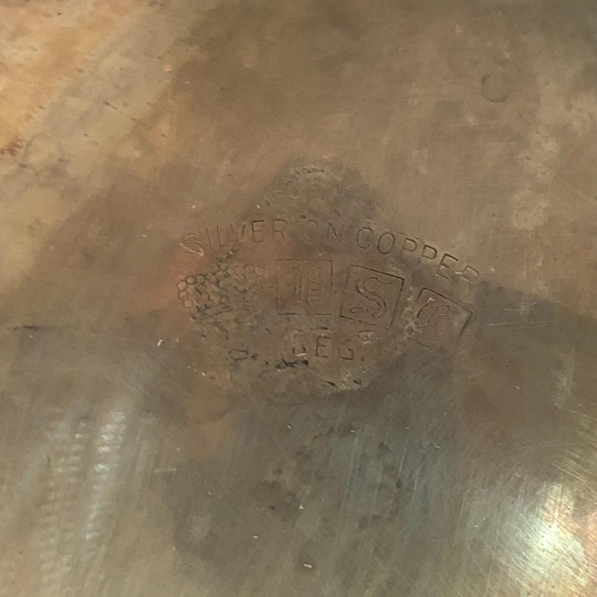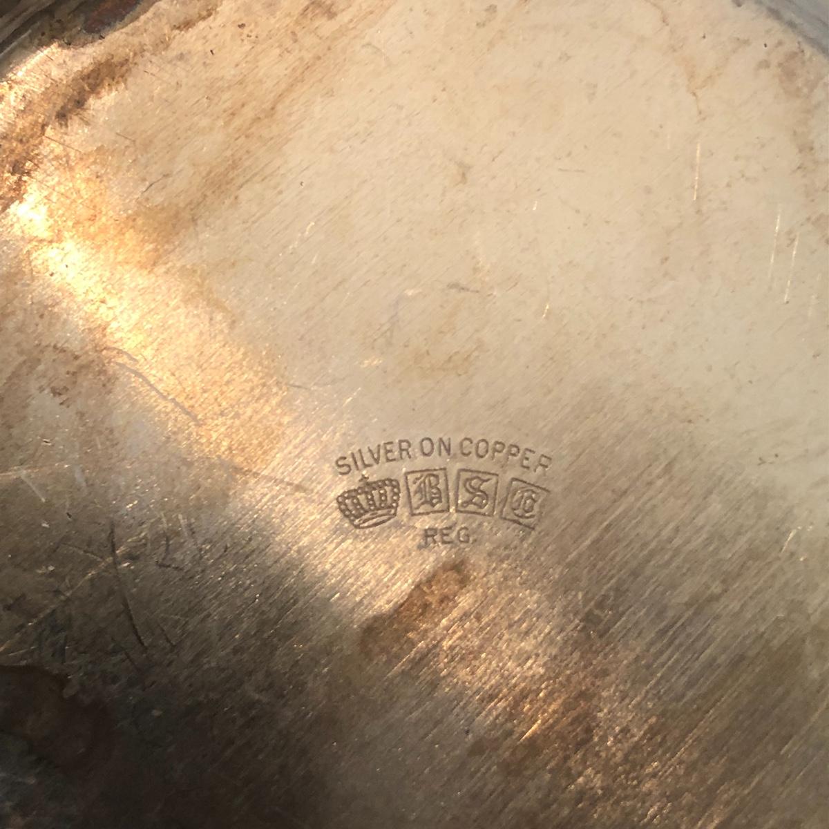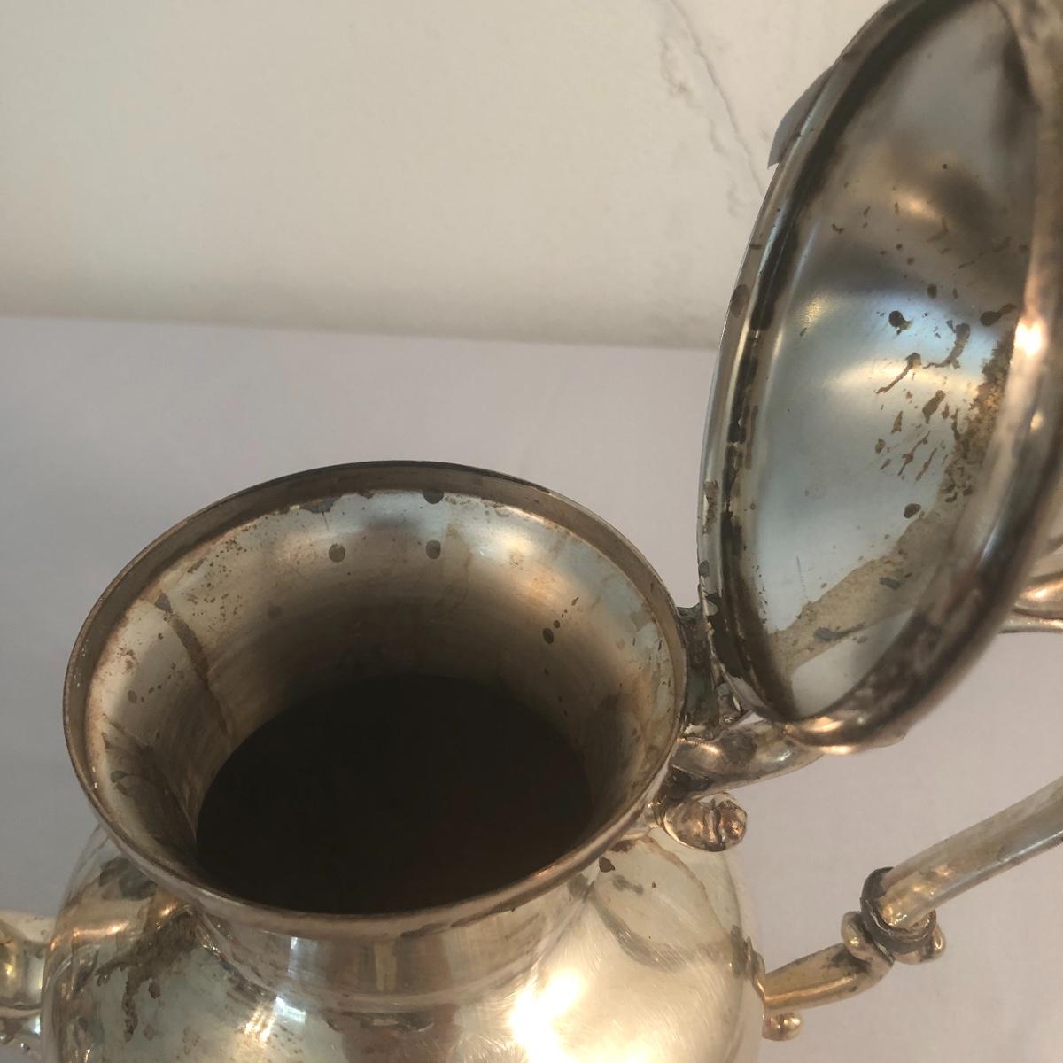 Three teapots by Birmingham Silver Co. that all have silver on copper stamps. Note the warming apparatus on the one is missing. Also included are two small pitchers, no marks found on these.