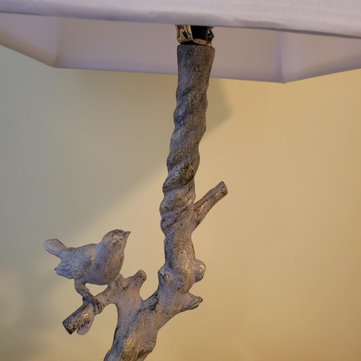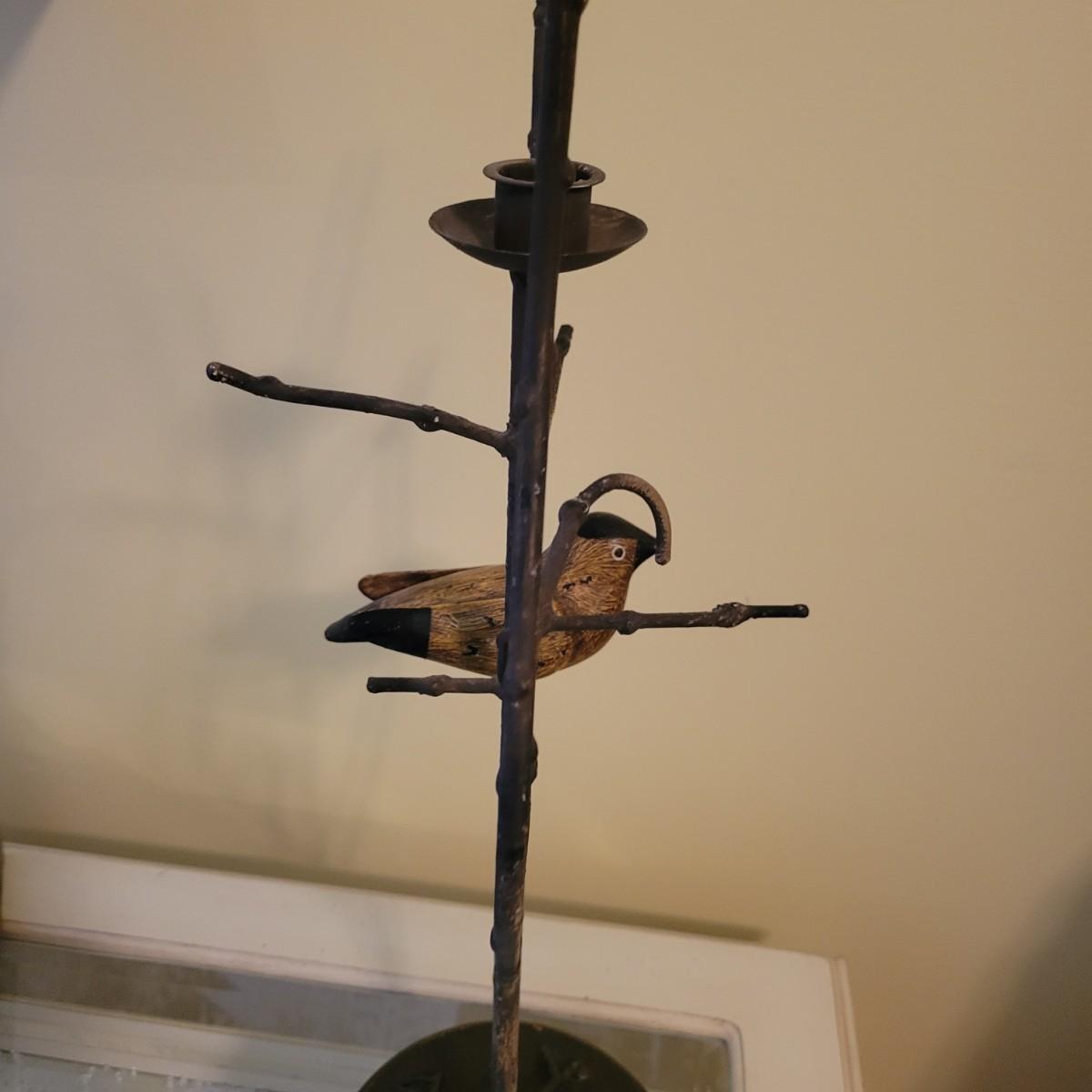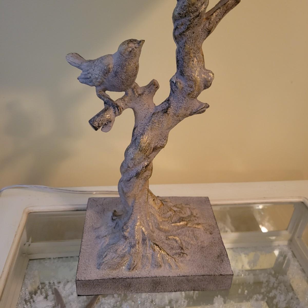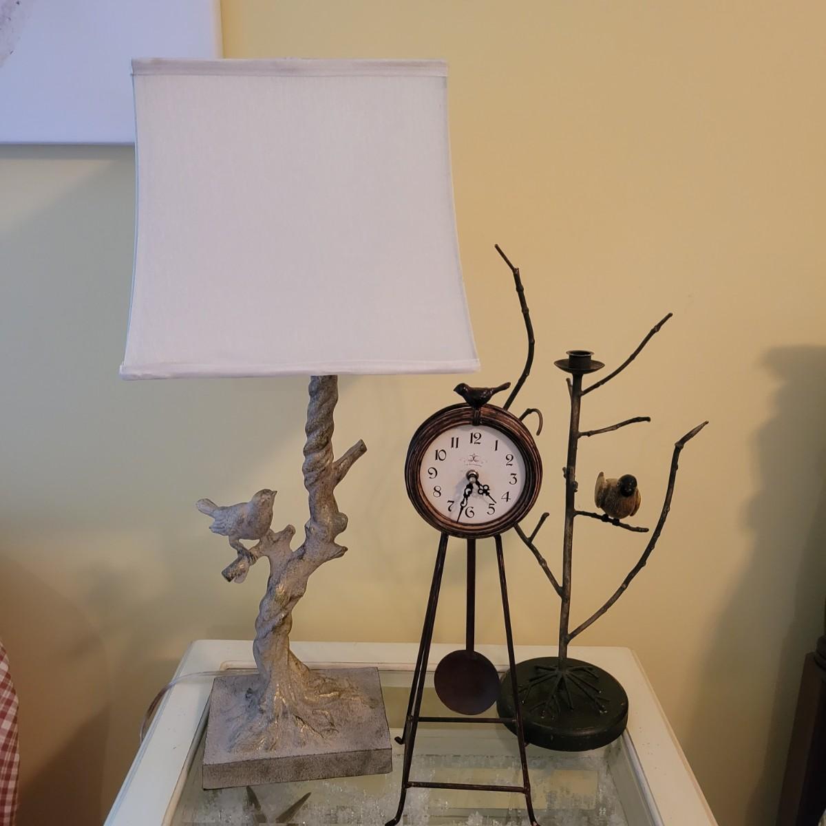 An assortment of bird inspired decor. Included is a resin cast lamp in the shape of a tree with a taupe finish with gold accents. It has a two way switch and measures approximately 8" x 6" x 29"H. Also included is a metal candle holder and clock that also have a bird motif. The lamp powered on when plugged in and the clock was not tested. Shipping available. Shipping can be costly. We suggest contacting our preferred local shipping provider, Postage Express, with dimensions and getting an estimate before bidding: (828) 670-5501 or postageexpress@yahoo.com.