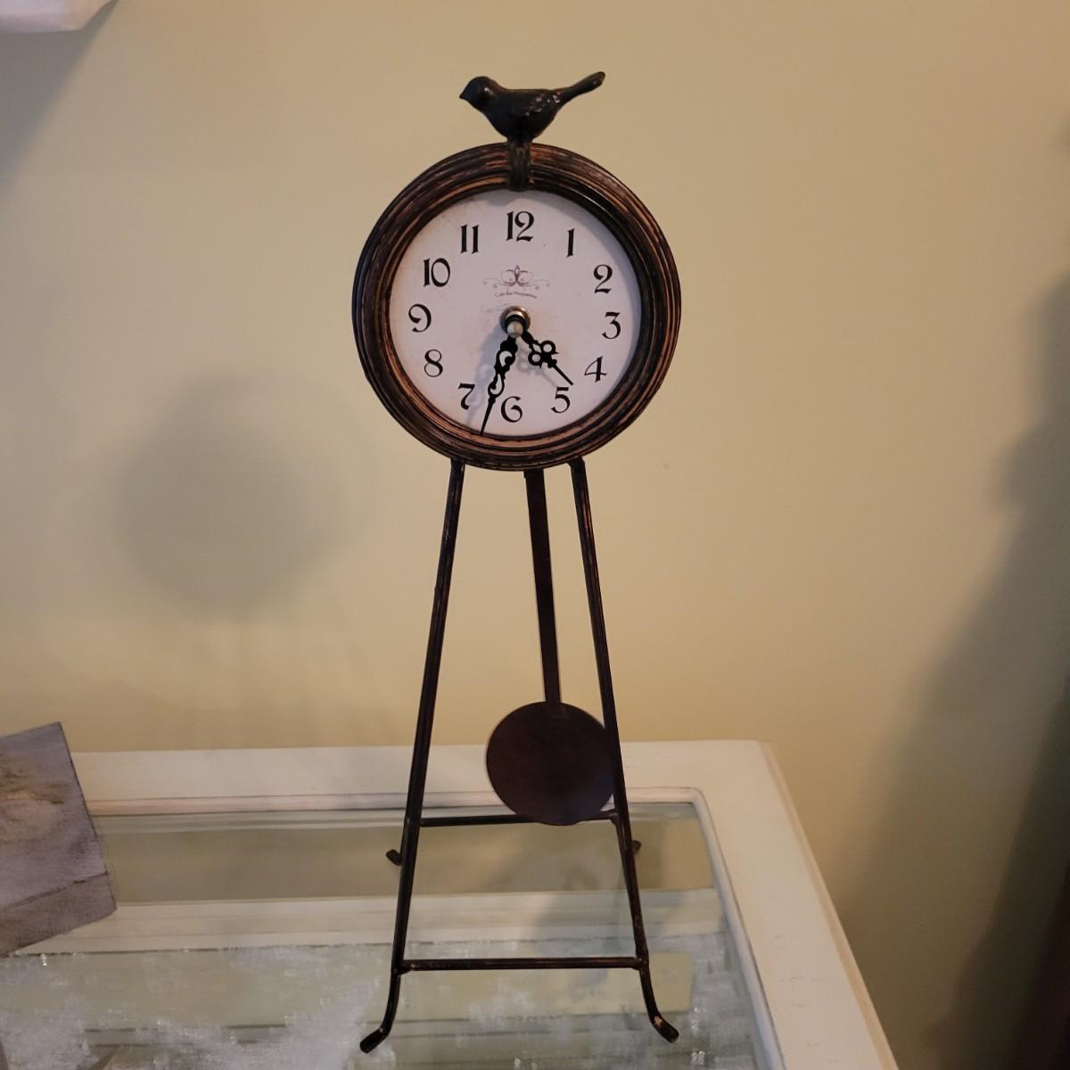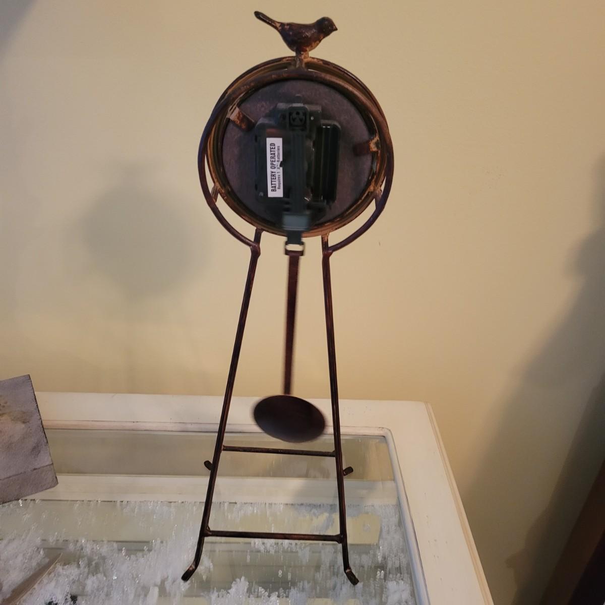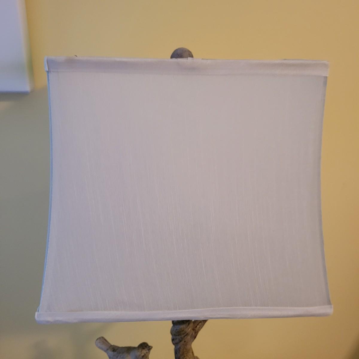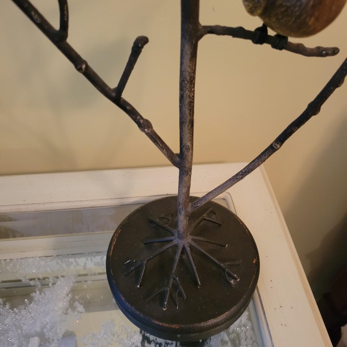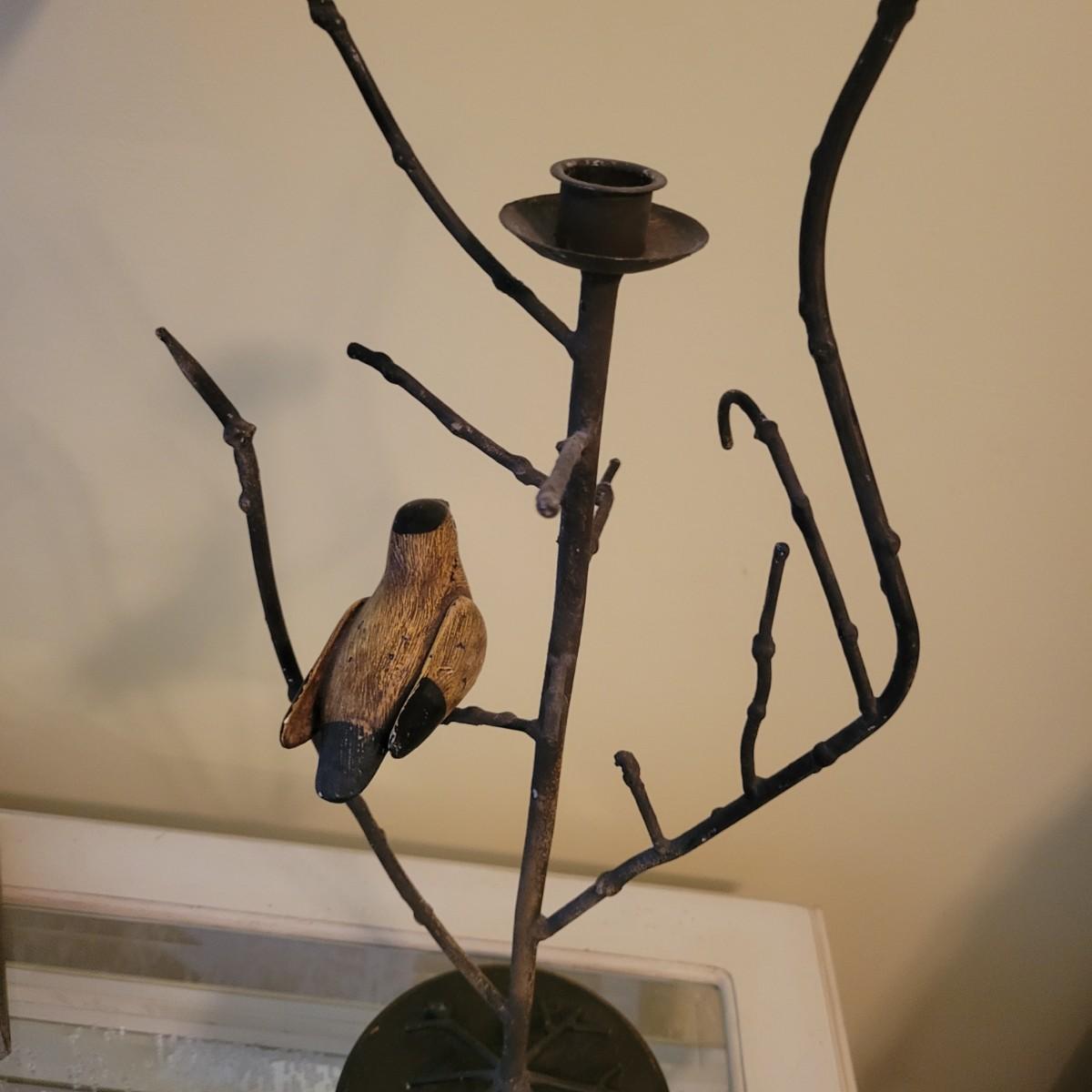An assortment of bird inspired decor. Included is a resin cast lamp in the shape of a tree with a taupe finish with gold accents. It has a two way switch and measures approximately 8" x 6" x 29"H. Also included is a metal candle holder and clock that also have a bird motif. The lamp powered on when plugged in and the clock was not tested. Shipping available. Shipping can be costly. We suggest contacting our preferred local shipping provider, Postage Express, with dimensions and getting an estimate before bidding: (828) 670-5501 or postageexpress@yahoo.com.