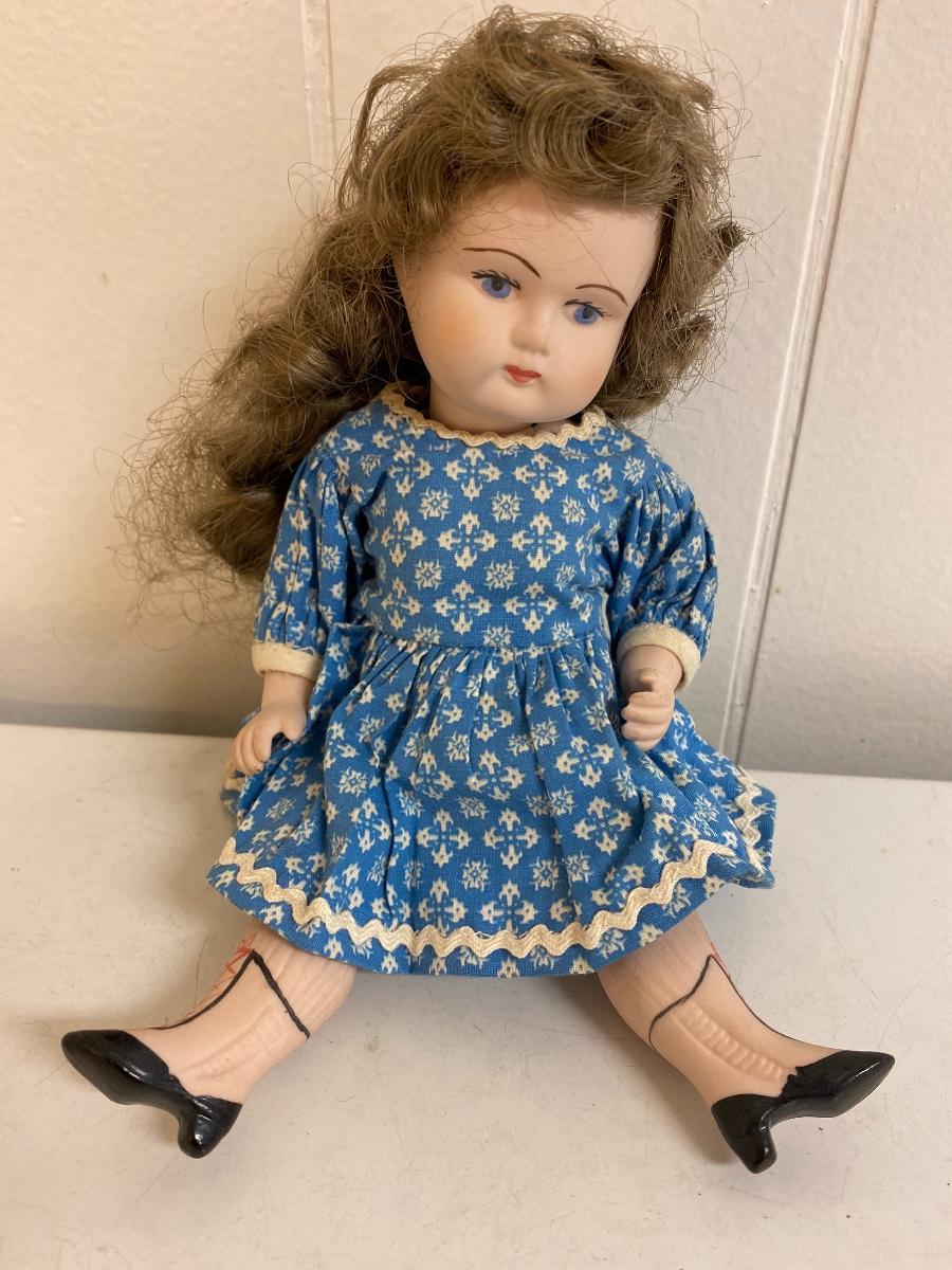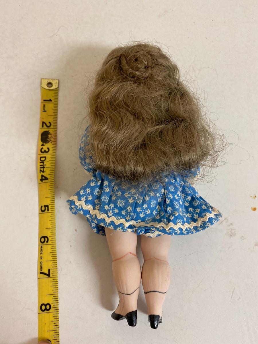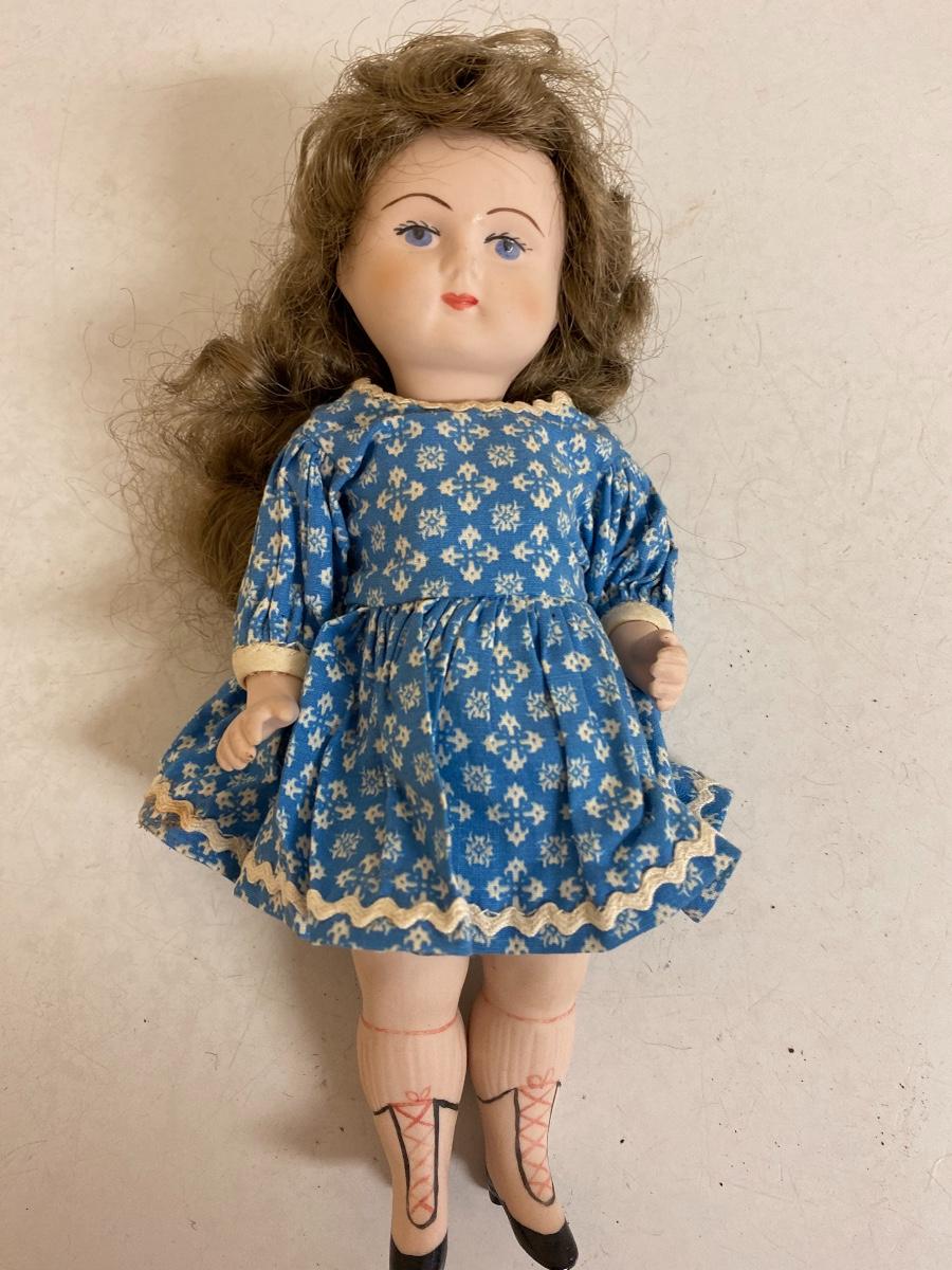 Vintage Mark Farmer china doll with catalog, 9”, original outfit, jointed head, hips & shoulders. Includes 1971-72 Mark Farmer catalog. Very good condition.