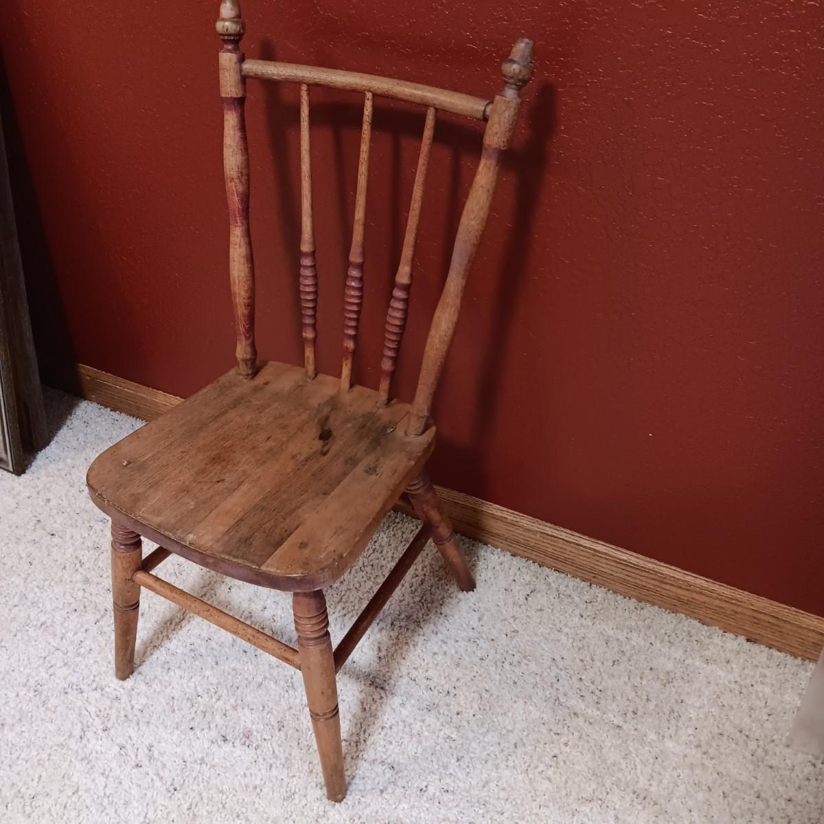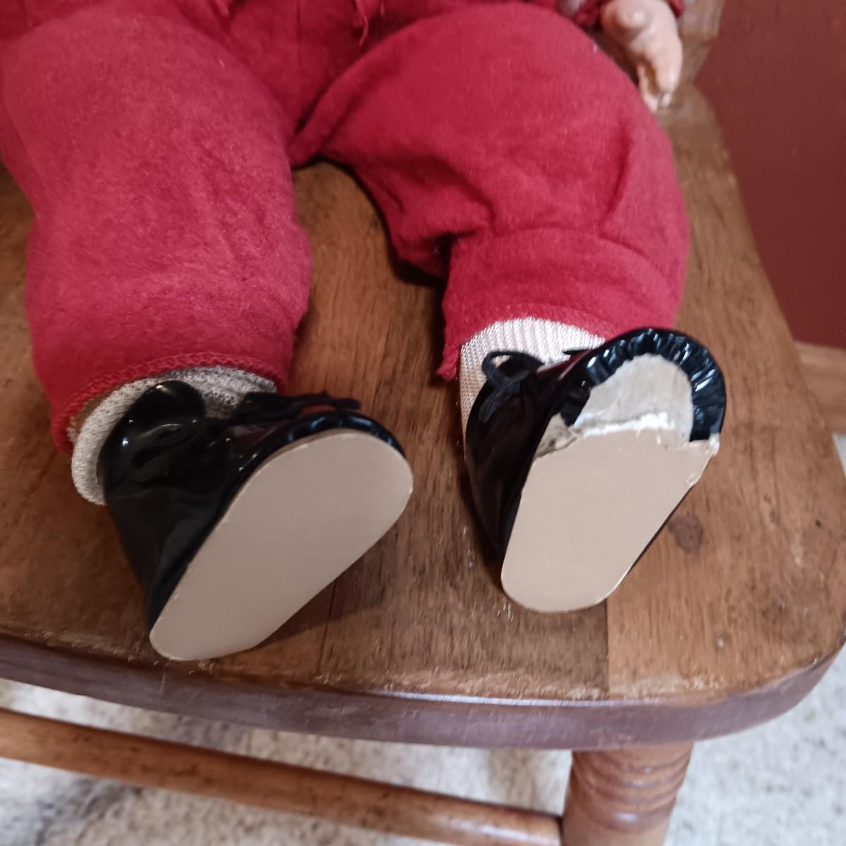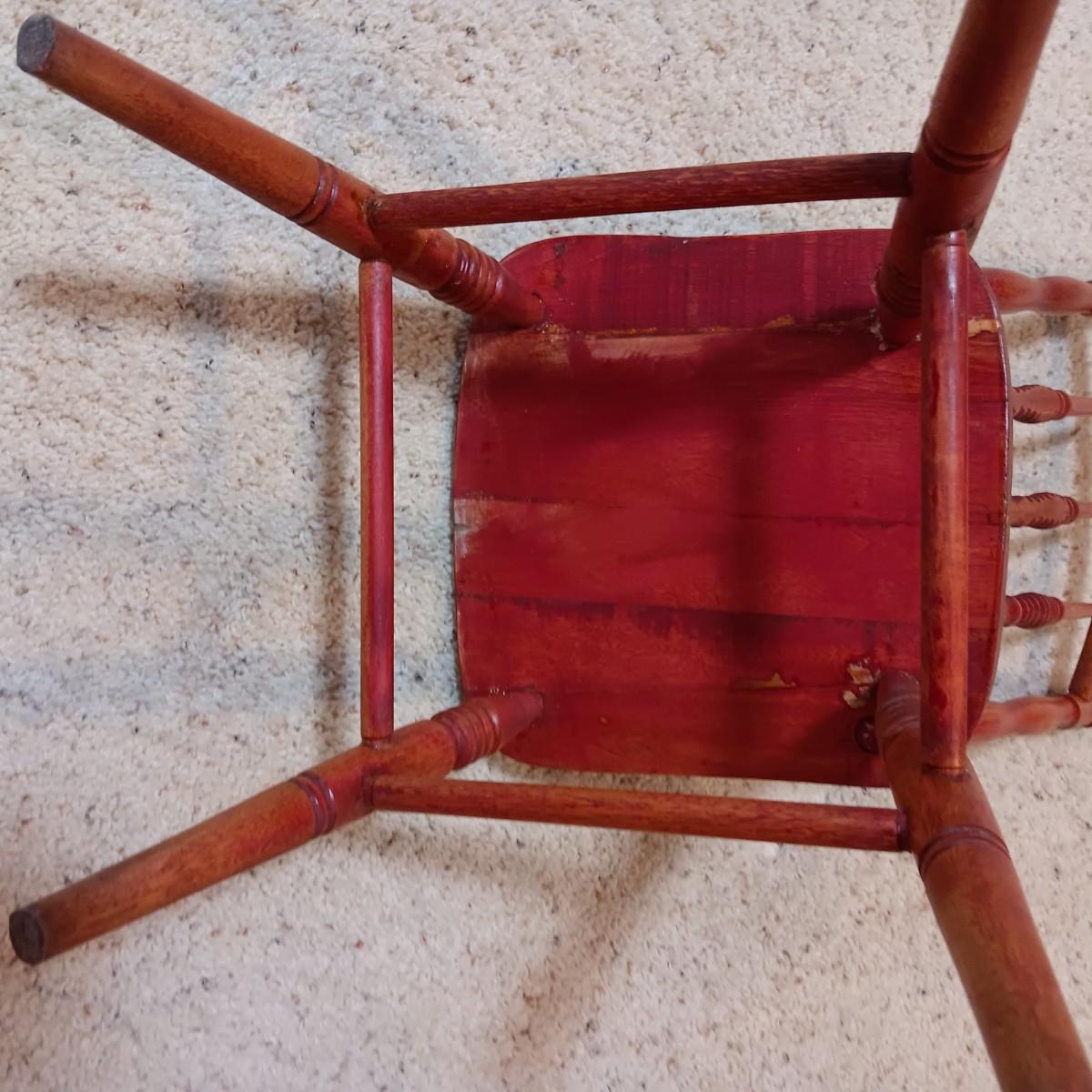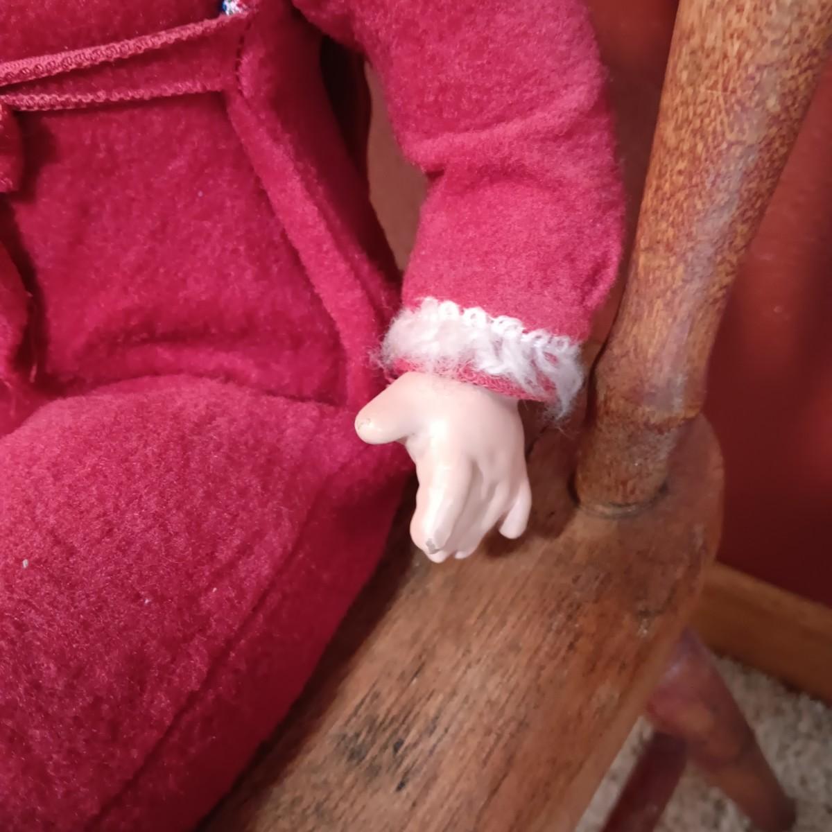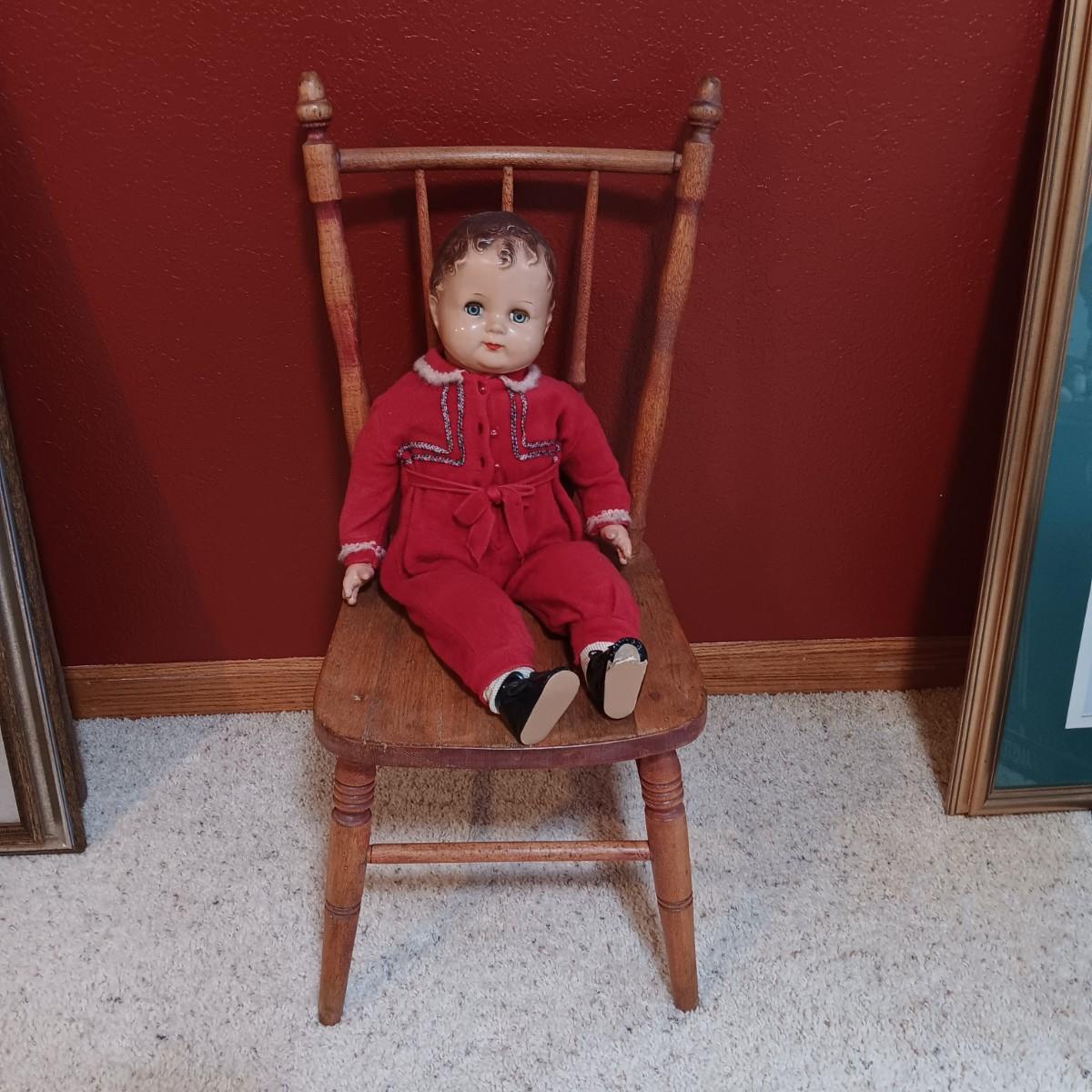 BISQUE HEAD, HANDS AND FEET ANTIQUE DOLL WITH A STURDY CHILD'S CHAIR