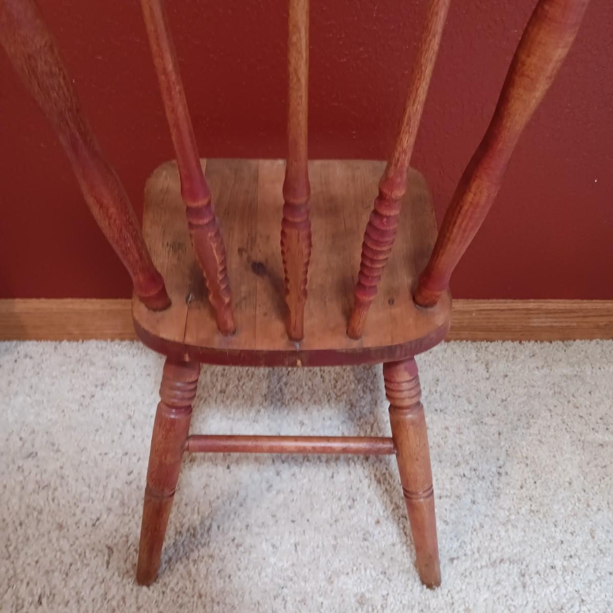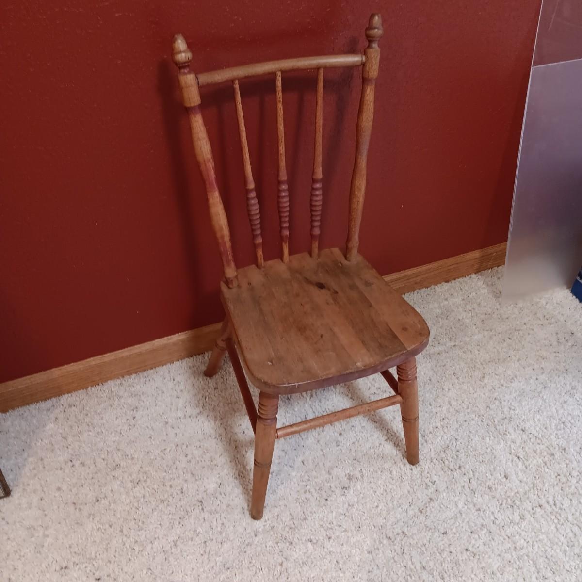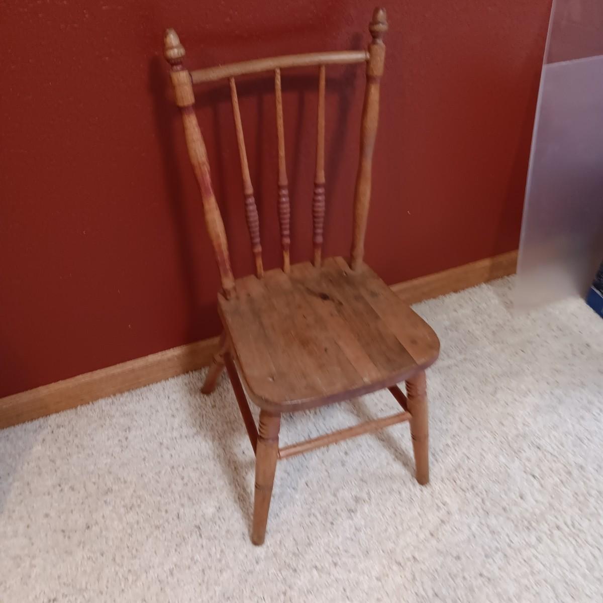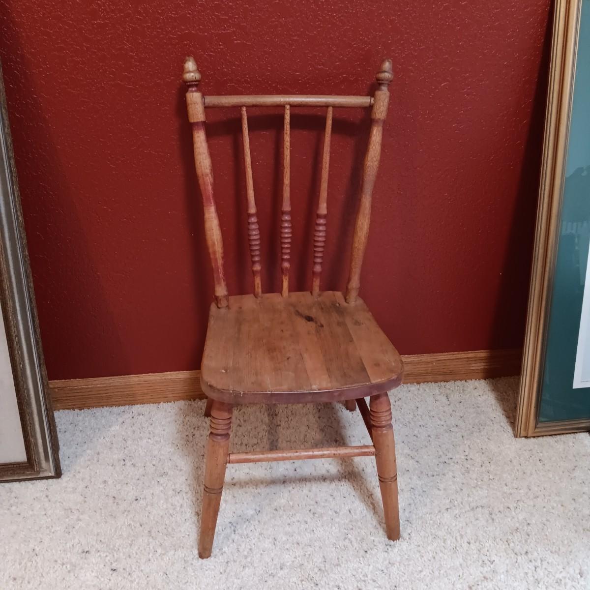 BISQUE HEAD, HANDS AND FEET ANTIQUE DOLL WITH A STURDY CHILD'S CHAIR