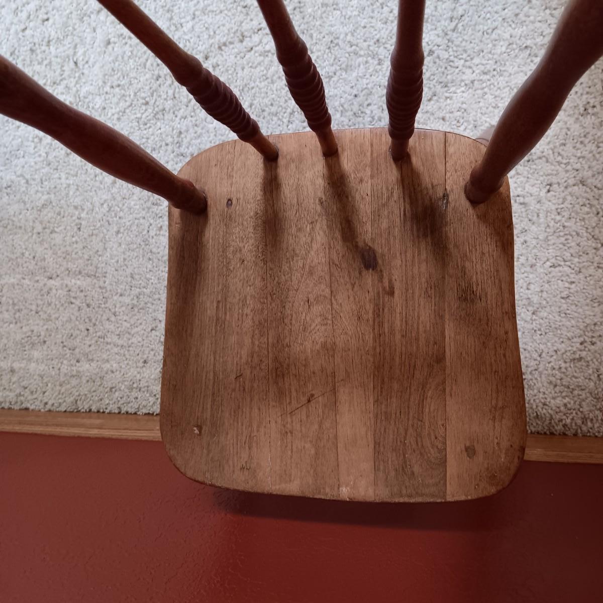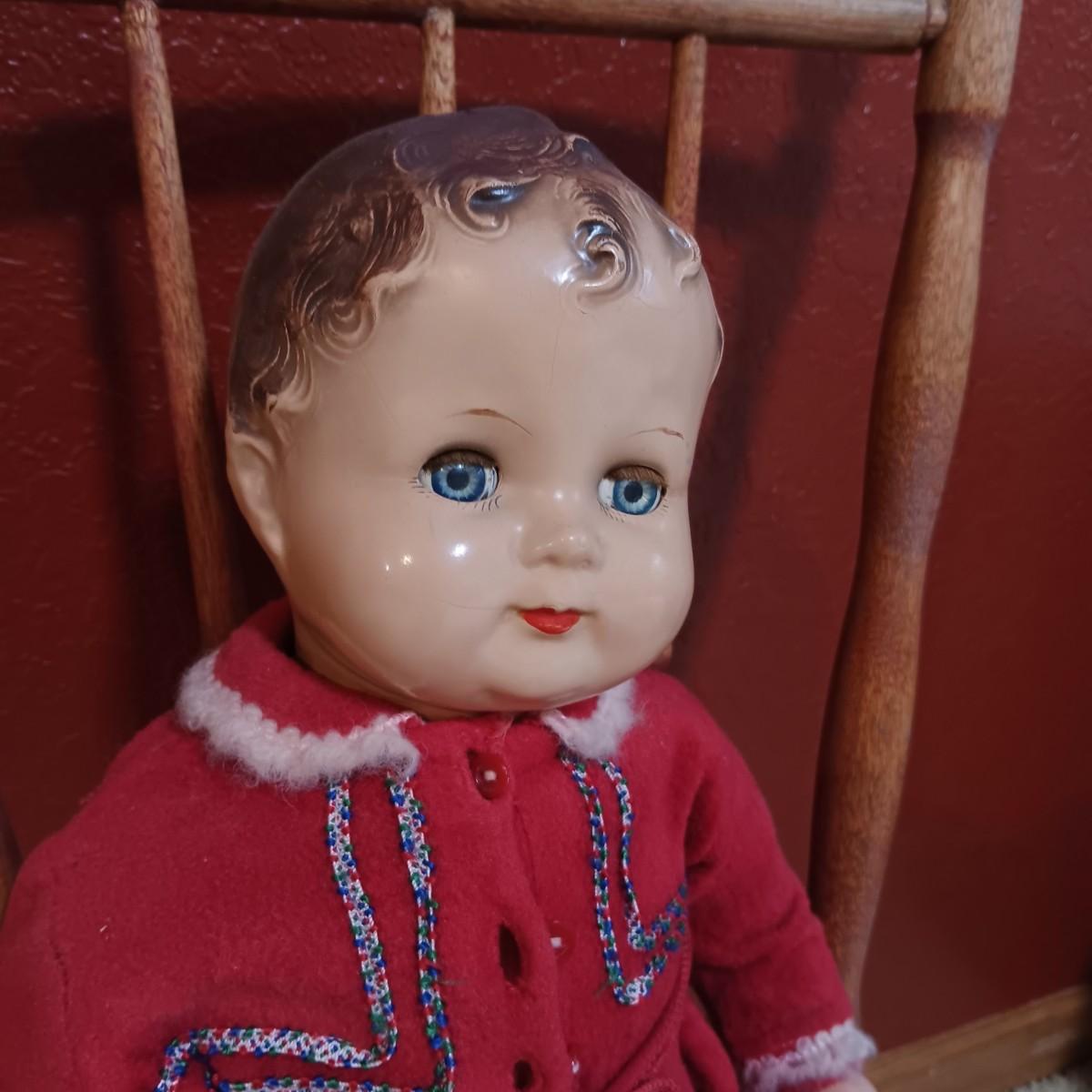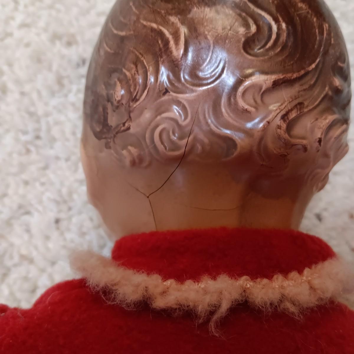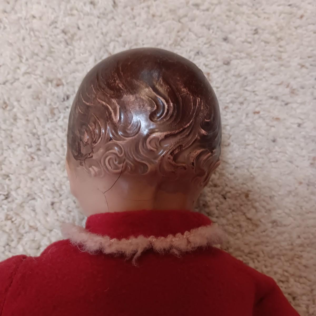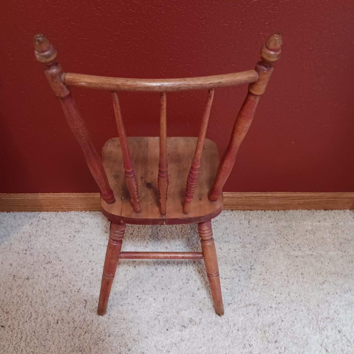 BISQUE HEAD, HANDS AND FEET ANTIQUE DOLL WITH A STURDY CHILD'S CHAIR