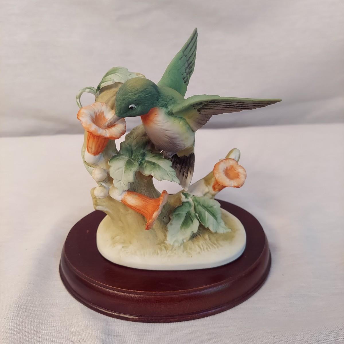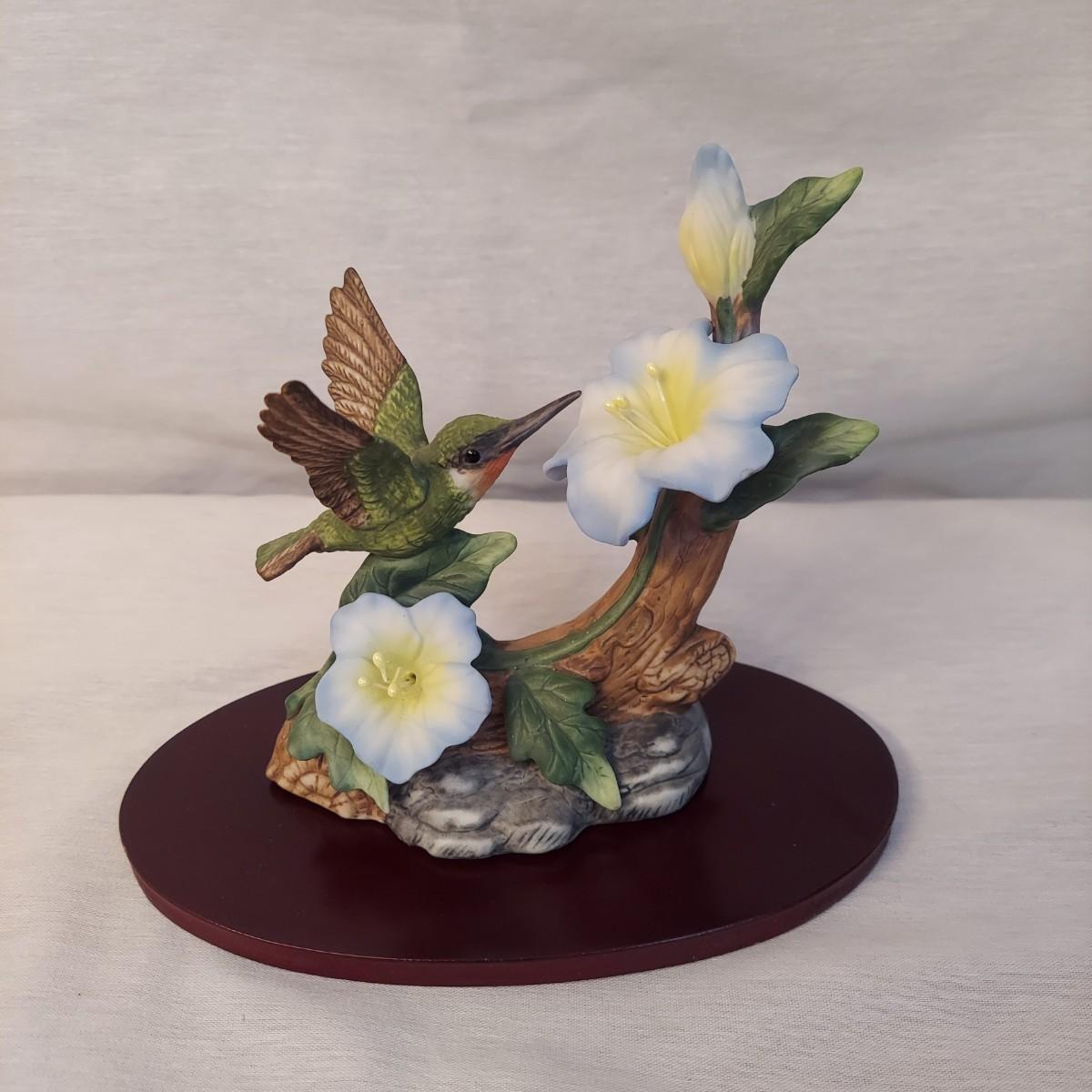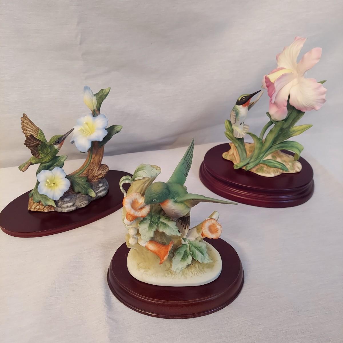 Three porcelain hummingbird figures with removable wood bases. Two hummingbird embroidered tea towels are also included. The smallest bird with the orange trumpet vine flowers is 4" x 2" x 5"H. The Heritage House bird on blue morning glories is 5.5" x 2.5" x 5"H. The Home Co bird on the pink lily is 4.5" x 3" x 6.5"H. Shipping available.