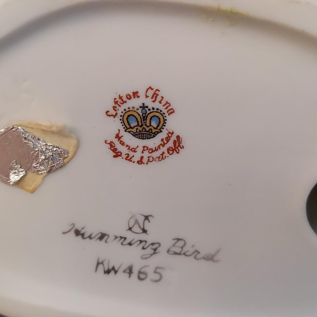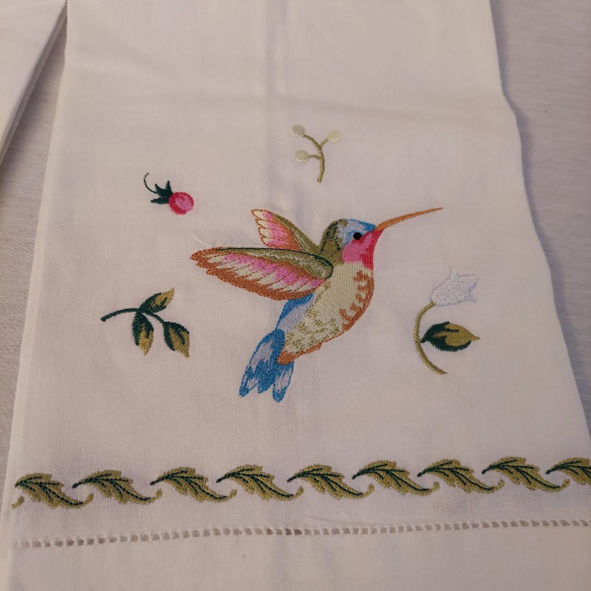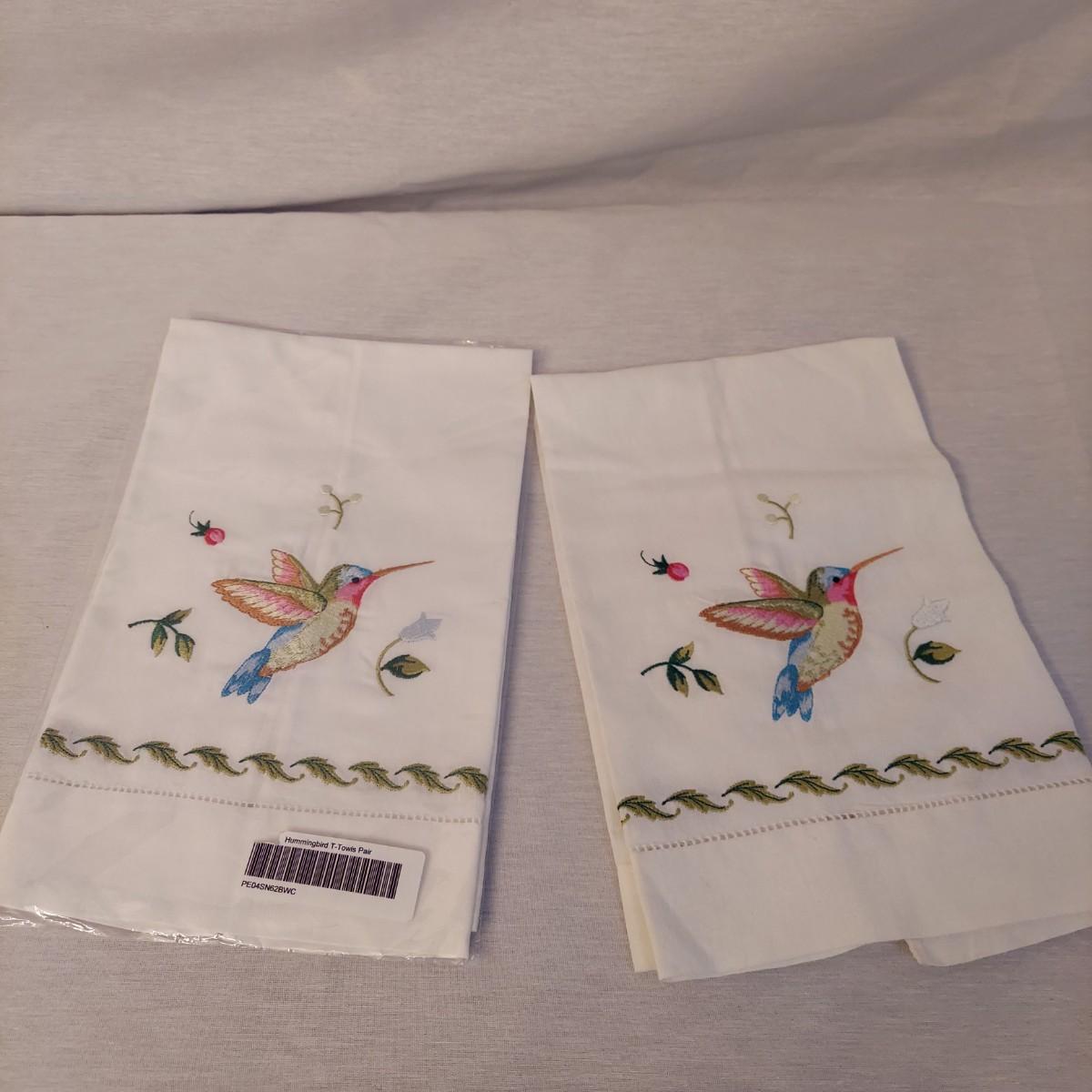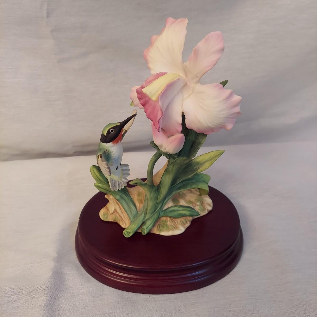 Three porcelain hummingbird figures with removable wood bases. Two hummingbird embroidered tea towels are also included. The smallest bird with the orange trumpet vine flowers is 4" x 2" x 5"H. The Heritage House bird on blue morning glories is 5.5" x 2.5" x 5"H. The Home Co bird on the pink lily is 4.5" x 3" x 6.5"H. Shipping available.