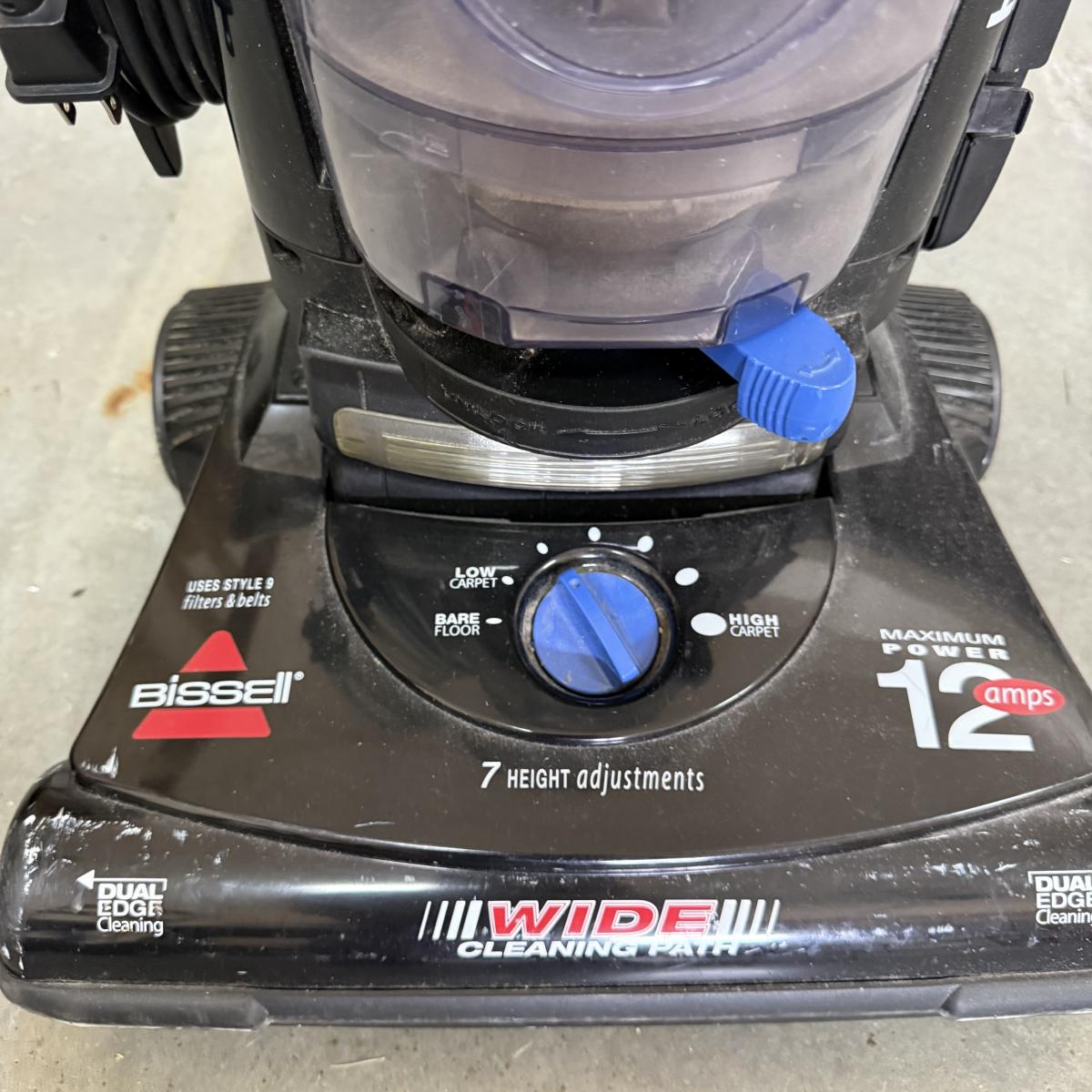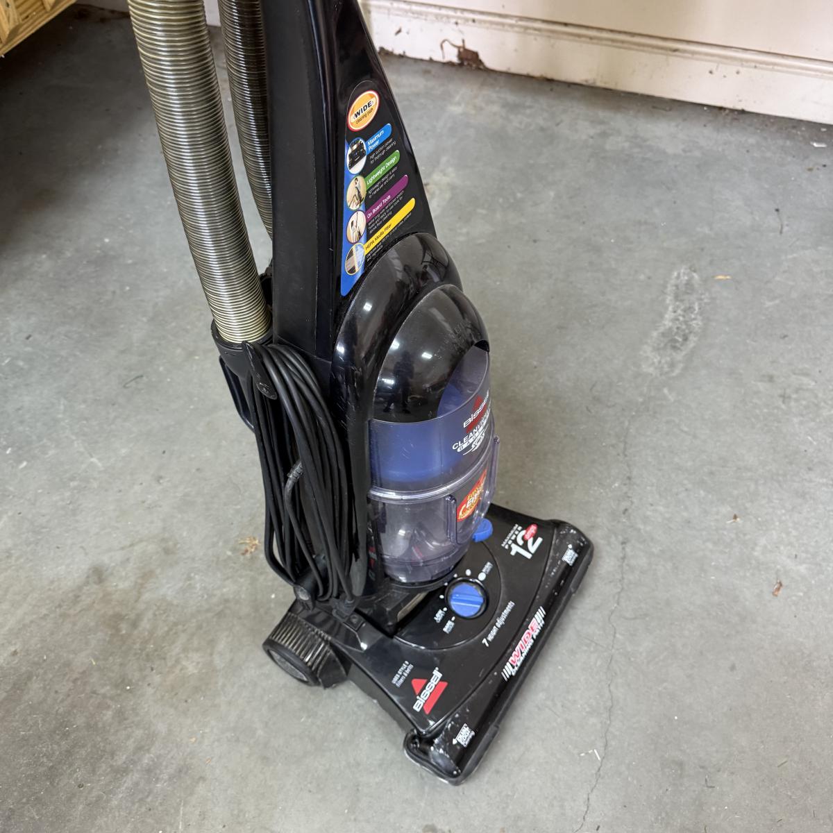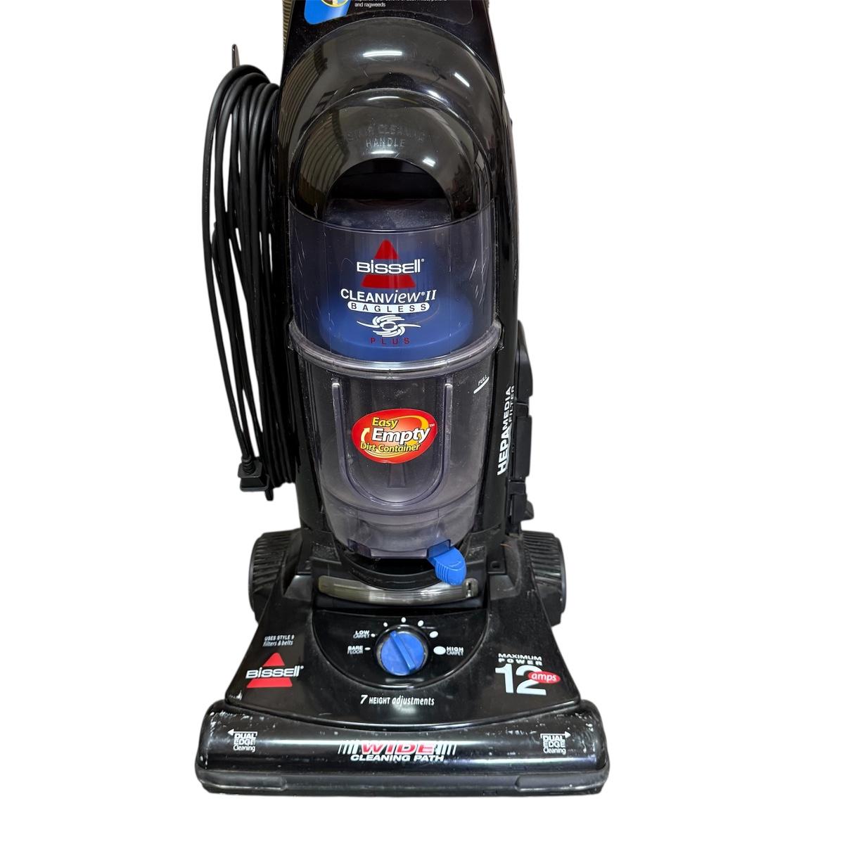 This lot contains a Bissell Cleanview II Bagless Plus vacuum. This upright vacuum has a canister you empty and seven height adjustments. Item powers on when plugged in and measures 14” x 12” x 42”H. This item also comes an extender wand and an attachment. Local pick up only.