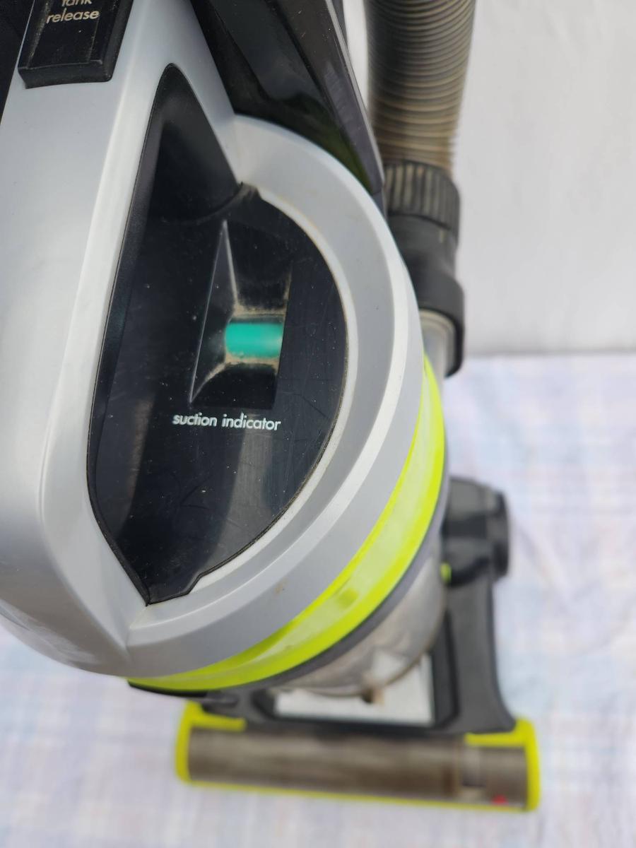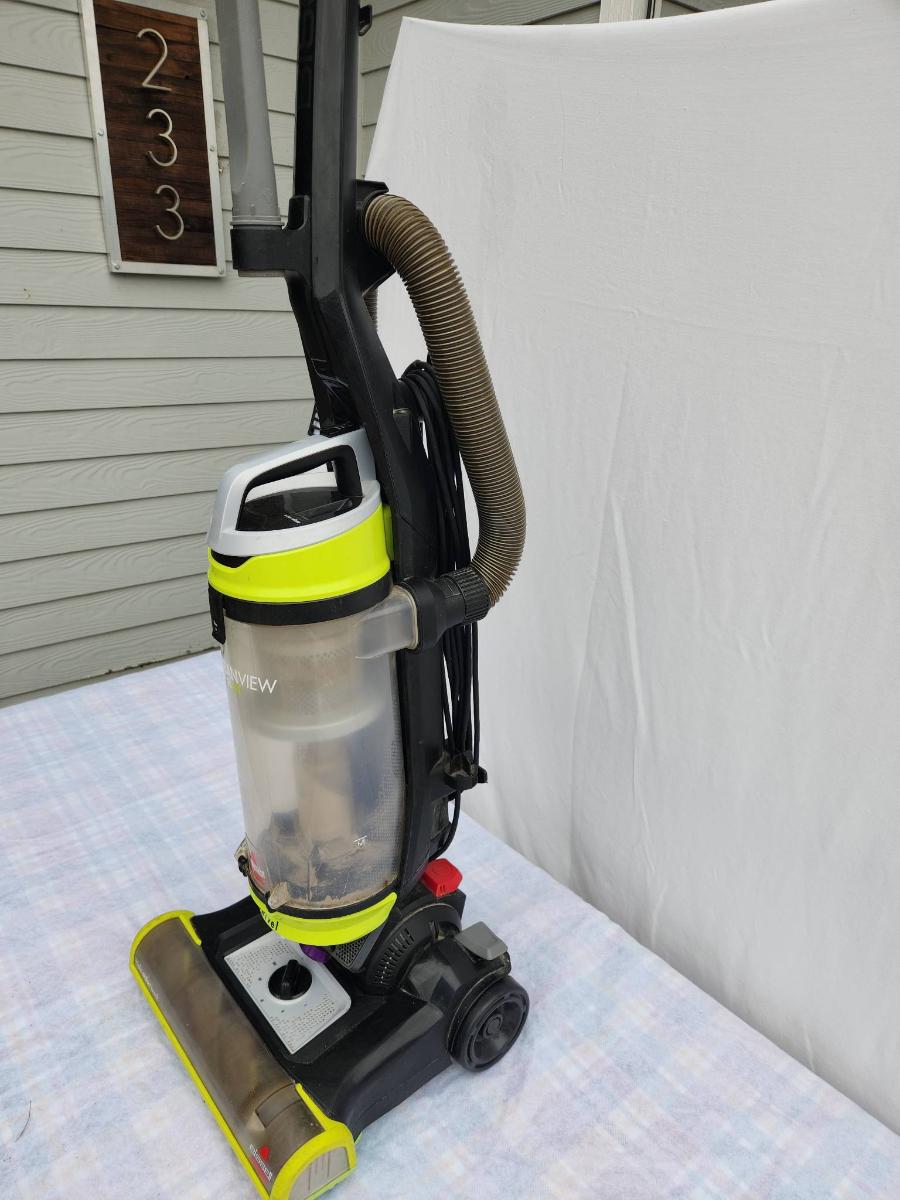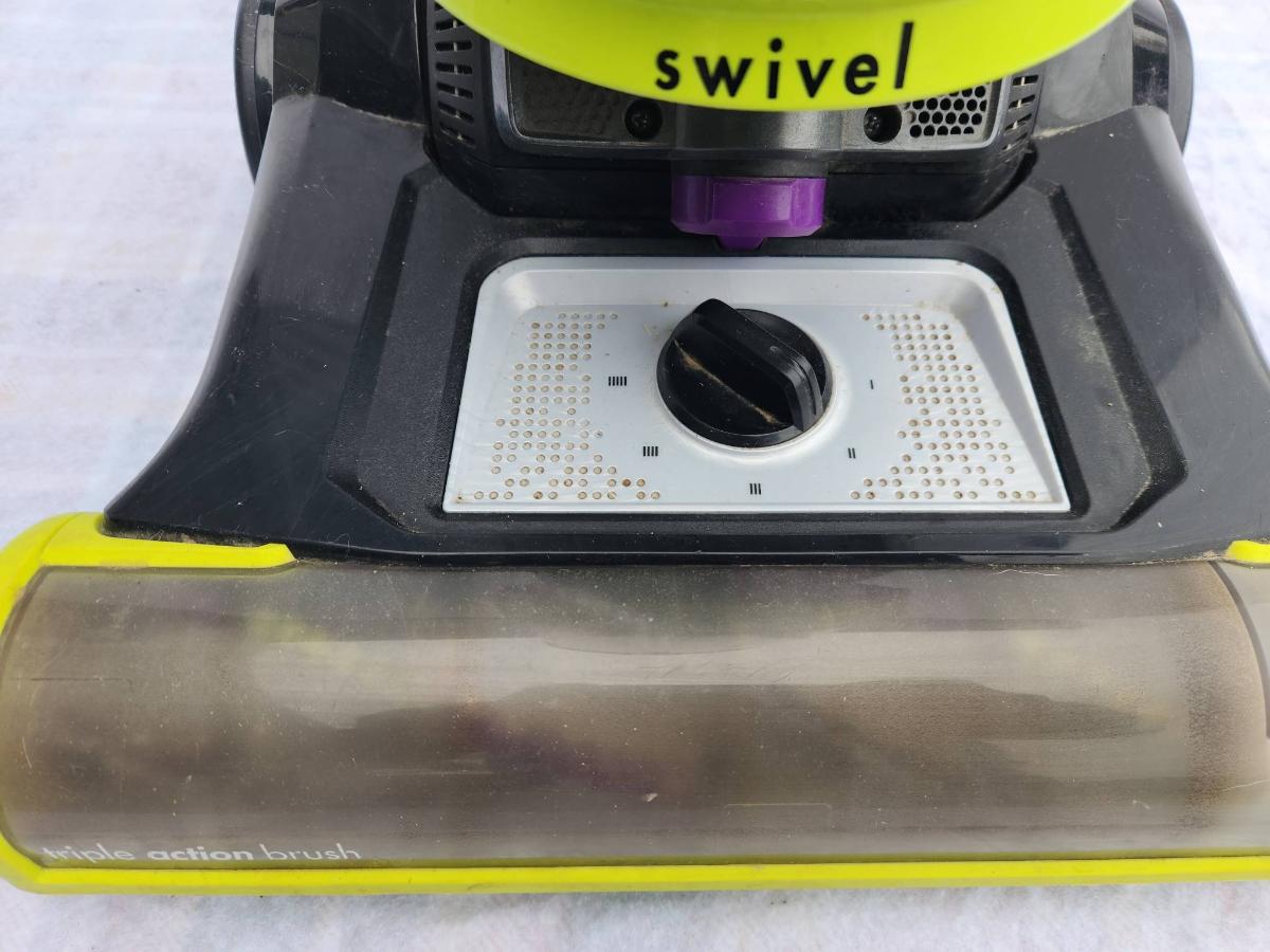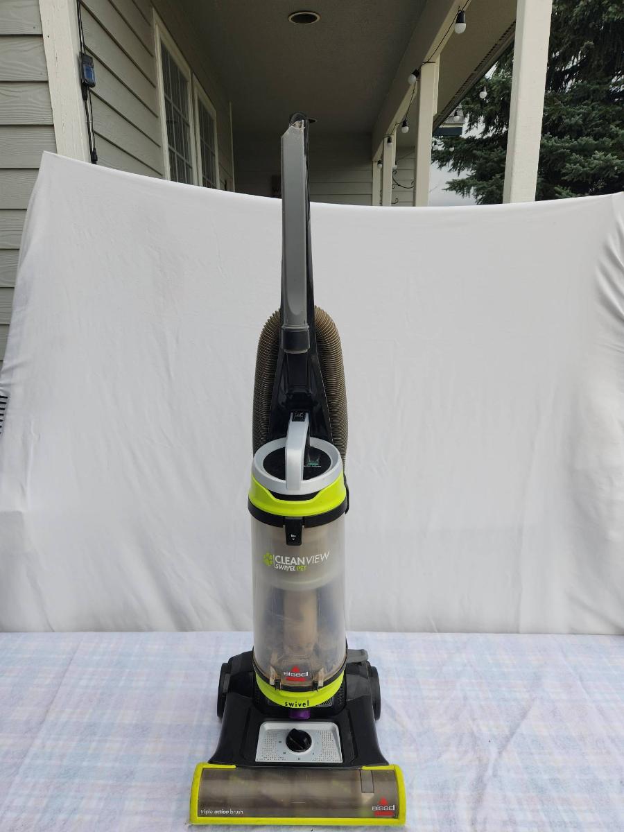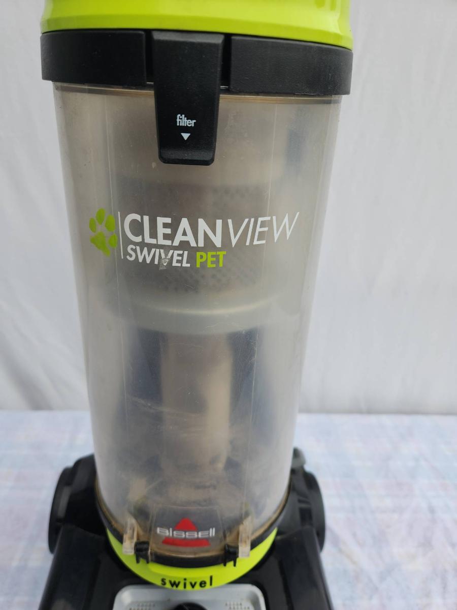 Bissell CleanView Swivel Pet Upright Vacuum Cleaner designed for pet owners. Features a swivel steering mechanism for easy maneuverability, a large dirt cup, a multi-cyclonic suction system, and a specialized pet hair tool. Includes a washable filter and a multi-level filtration system. Appears used with some visible wear on the dirt tank and roller area.
