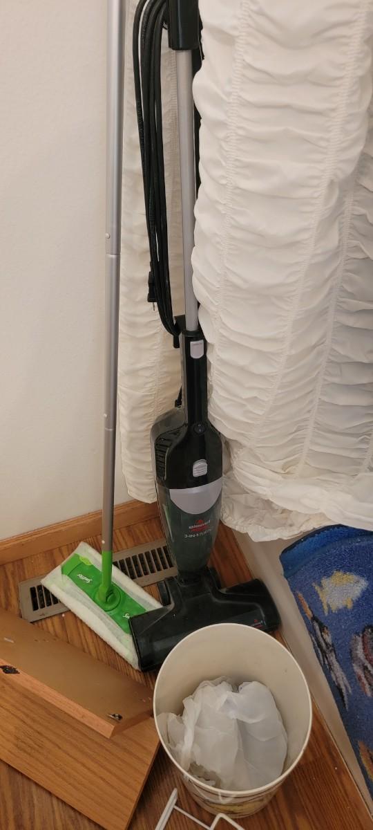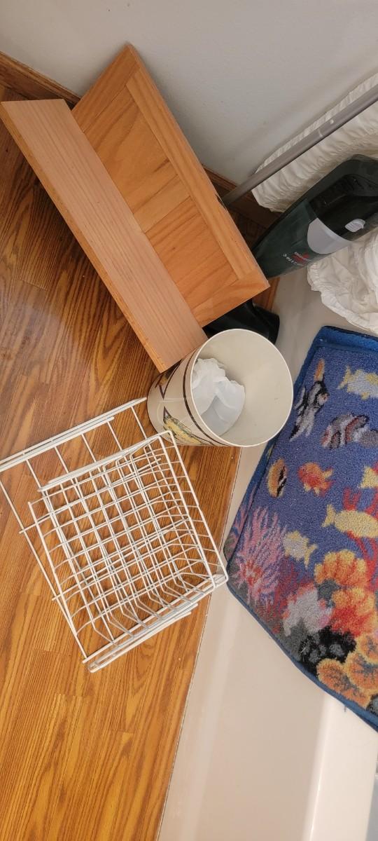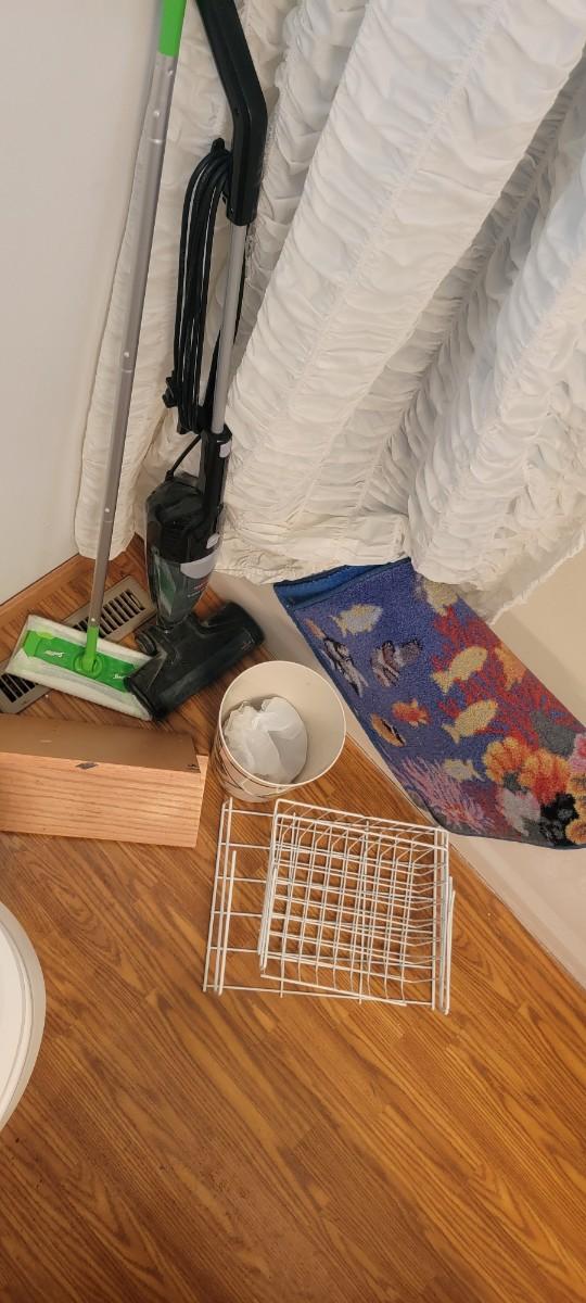 Bissell 3 in 1 turbo, shower curtain, wood shelf, misc