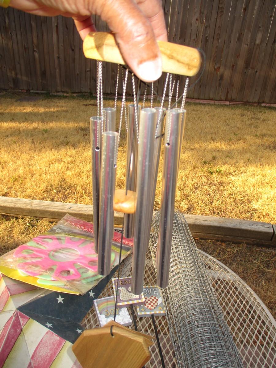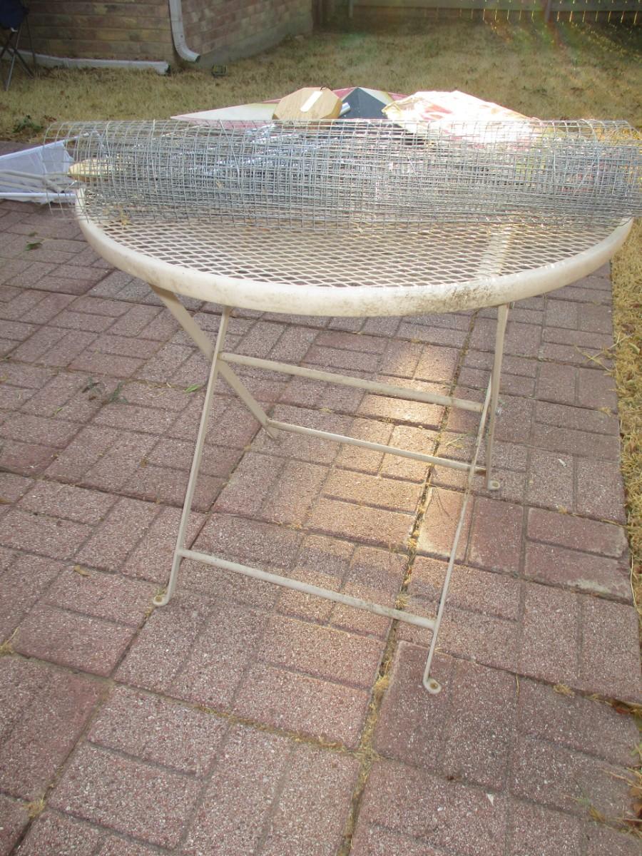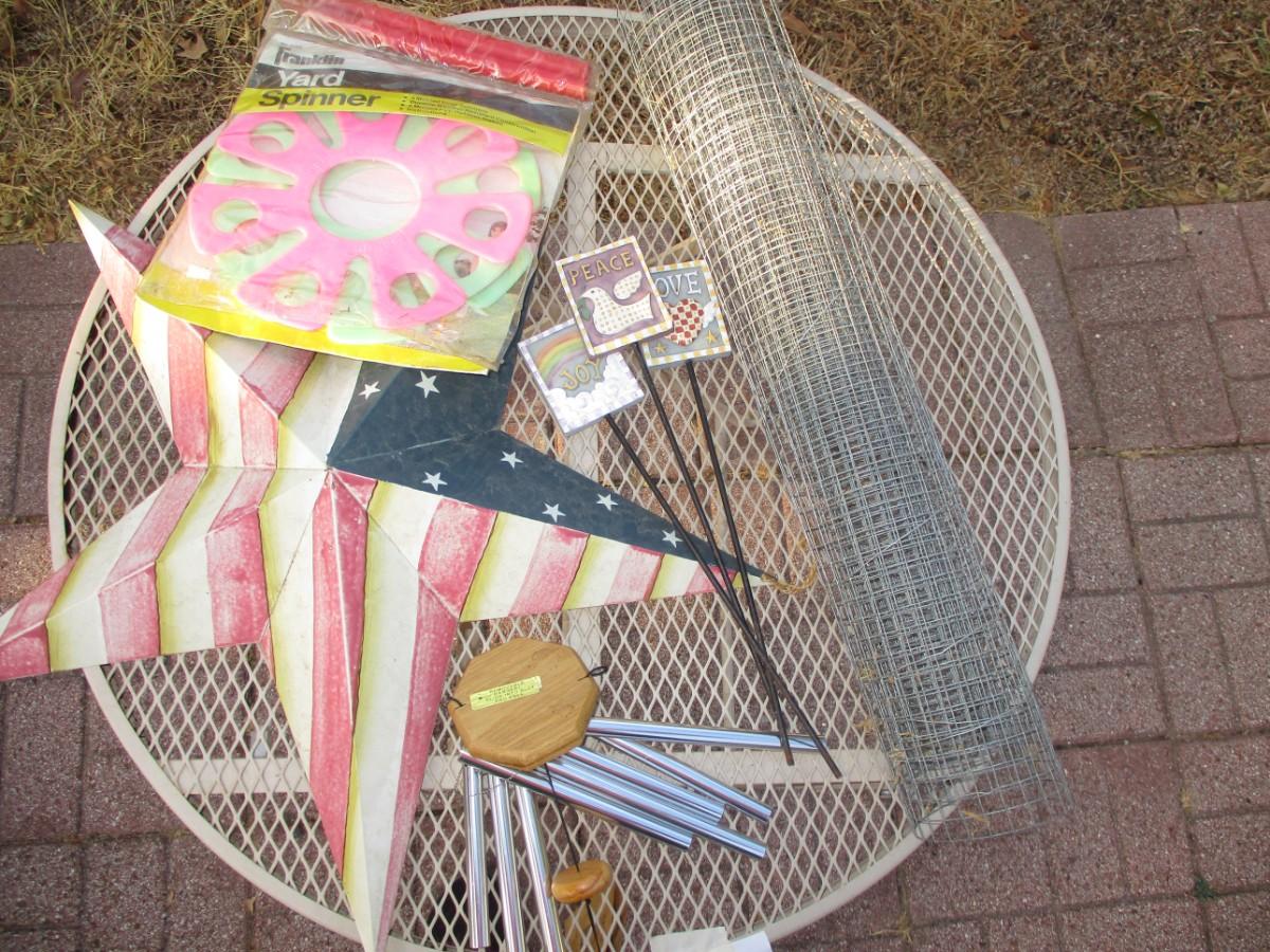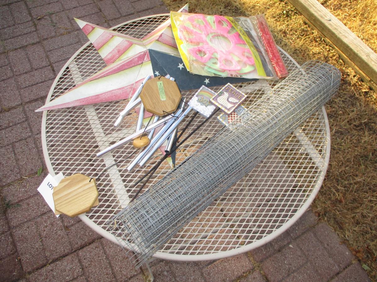 Small mesh wrought iron bistro table. no chairs. Roll of Fencing. Chim. yard Signs. yard Spinners. Metal Texas Star