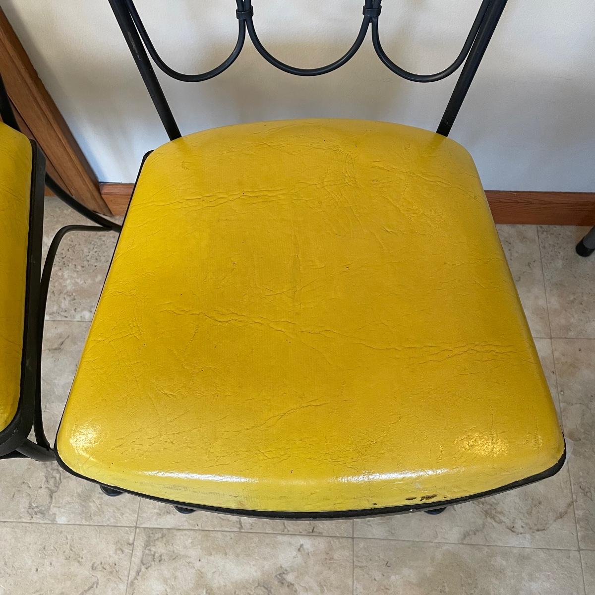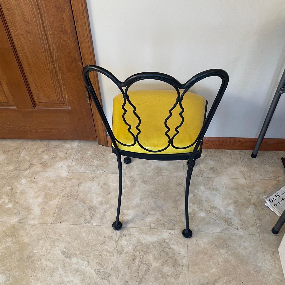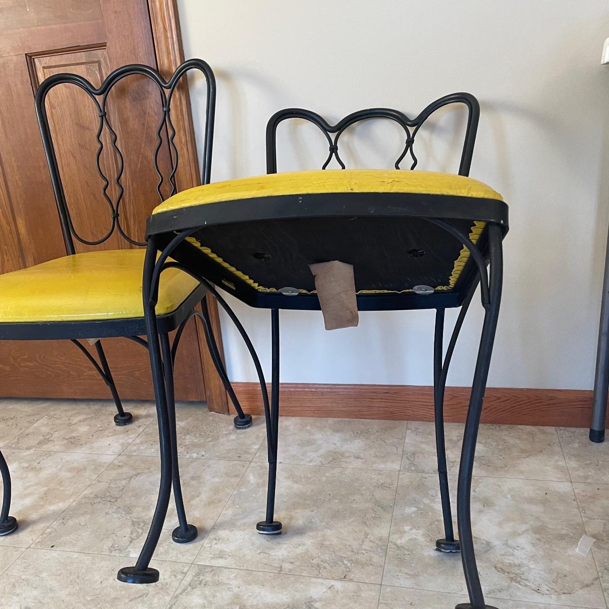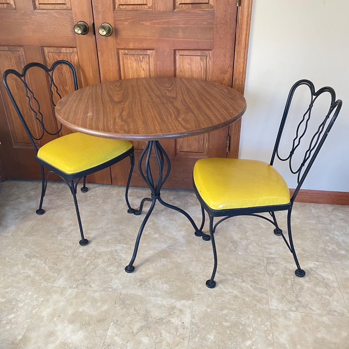 A handy size at 30” d x 29” tall, this table has a black wrought iron base with a pressed wood and laminate top. The two matching chairs have yellow vinyl seats; they measure 13” wide x 16” deep x 31” tall with 16” seat height.