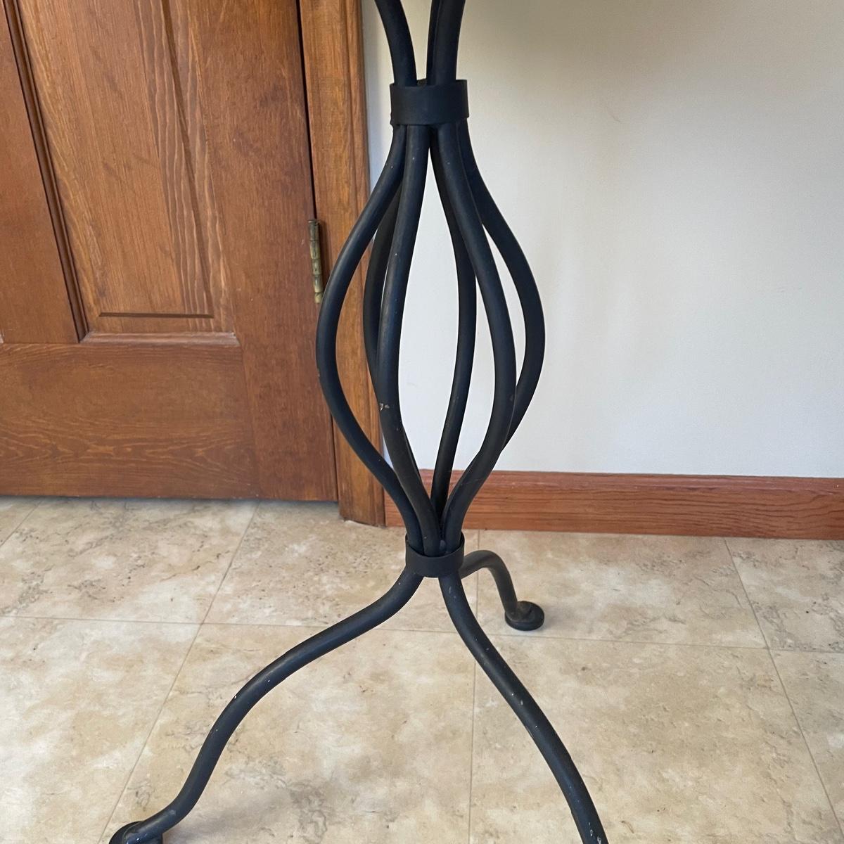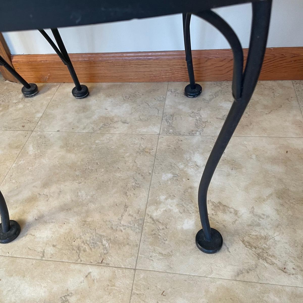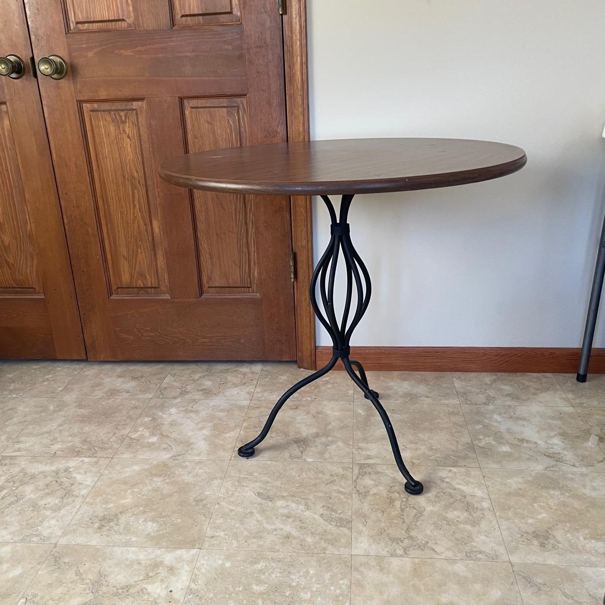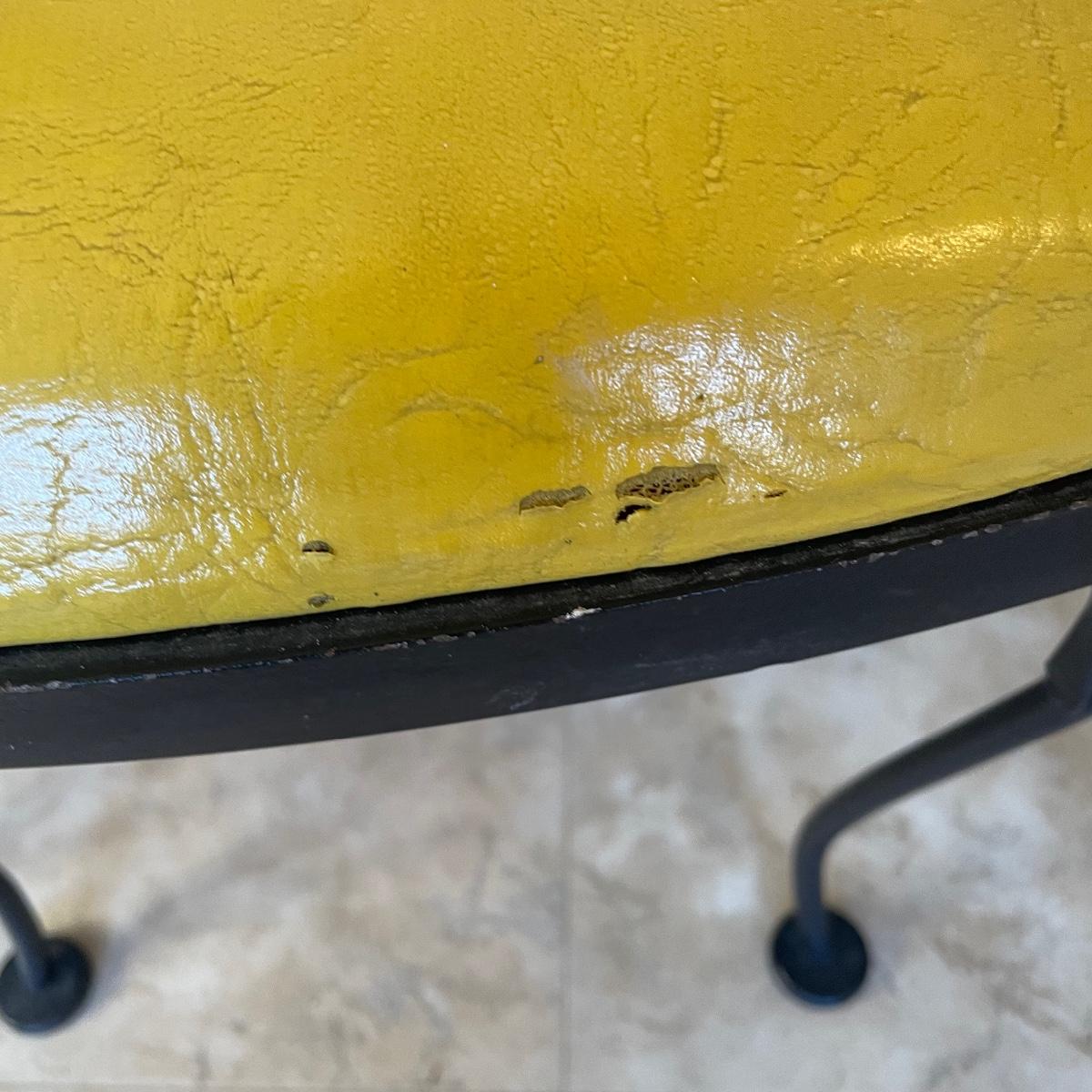 A handy size at 30” d x 29” tall, this table has a black wrought iron base with a pressed wood and laminate top. The two matching chairs have yellow vinyl seats; they measure 13” wide x 16” deep x 31” tall with 16” seat height.