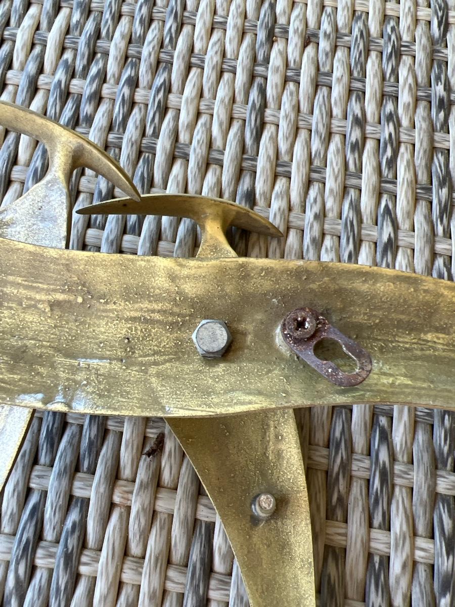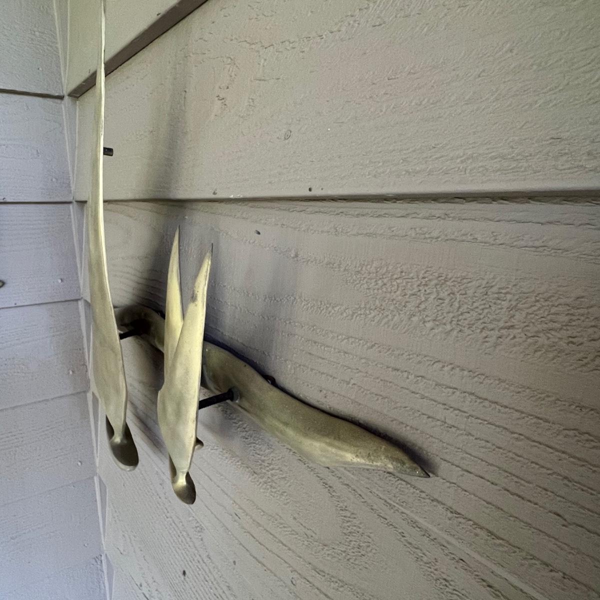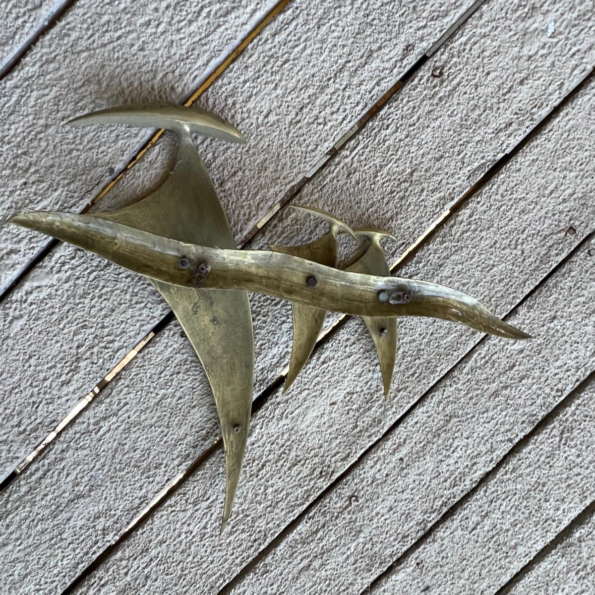 This brass Bitano wall sculpture features three sailboats. It has two hooks to hang and measures 22” x 3.5” x 19” H. Note there are some small green paint marks in one area, see image. There are other matching pieces in this sale.