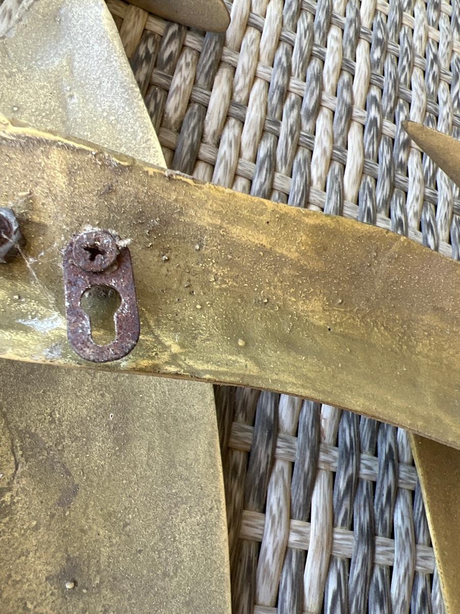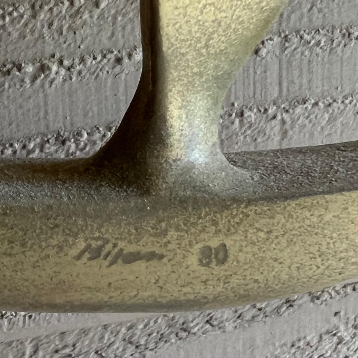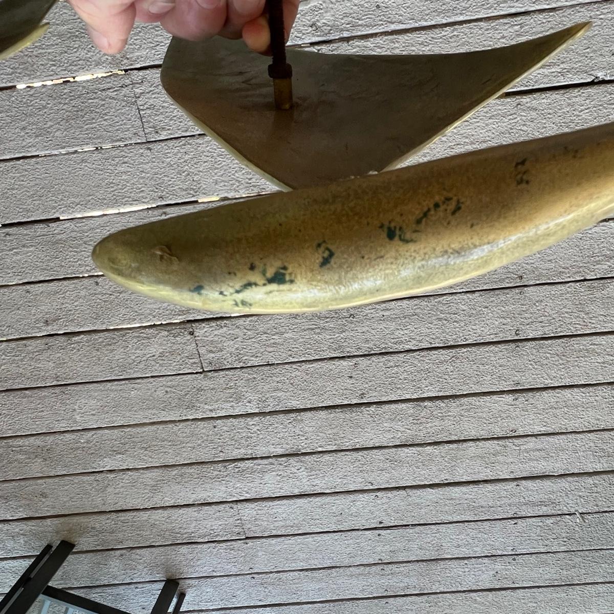 This brass Bitano wall sculpture features three sailboats. It has two hooks to hang and measures 22” x 3.5” x 19” H. Note there are some small green paint marks in one area, see image. There are other matching pieces in this sale.
