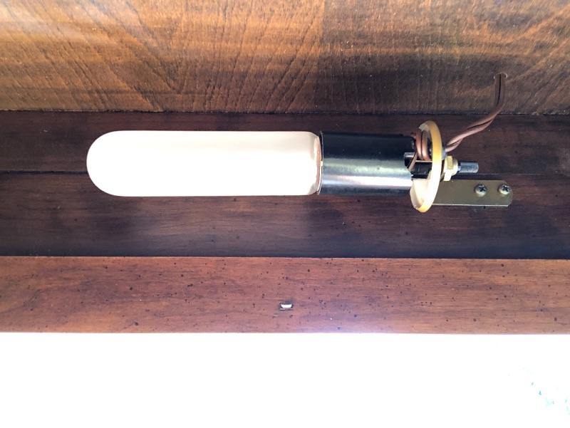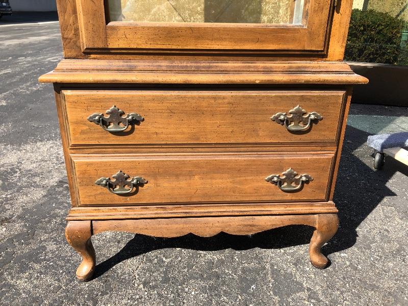Vintage tall wood and glass display cabinet. Three glass shelves with a light inside. Glass door and sides. Bottom drawer. Good vintage condition.