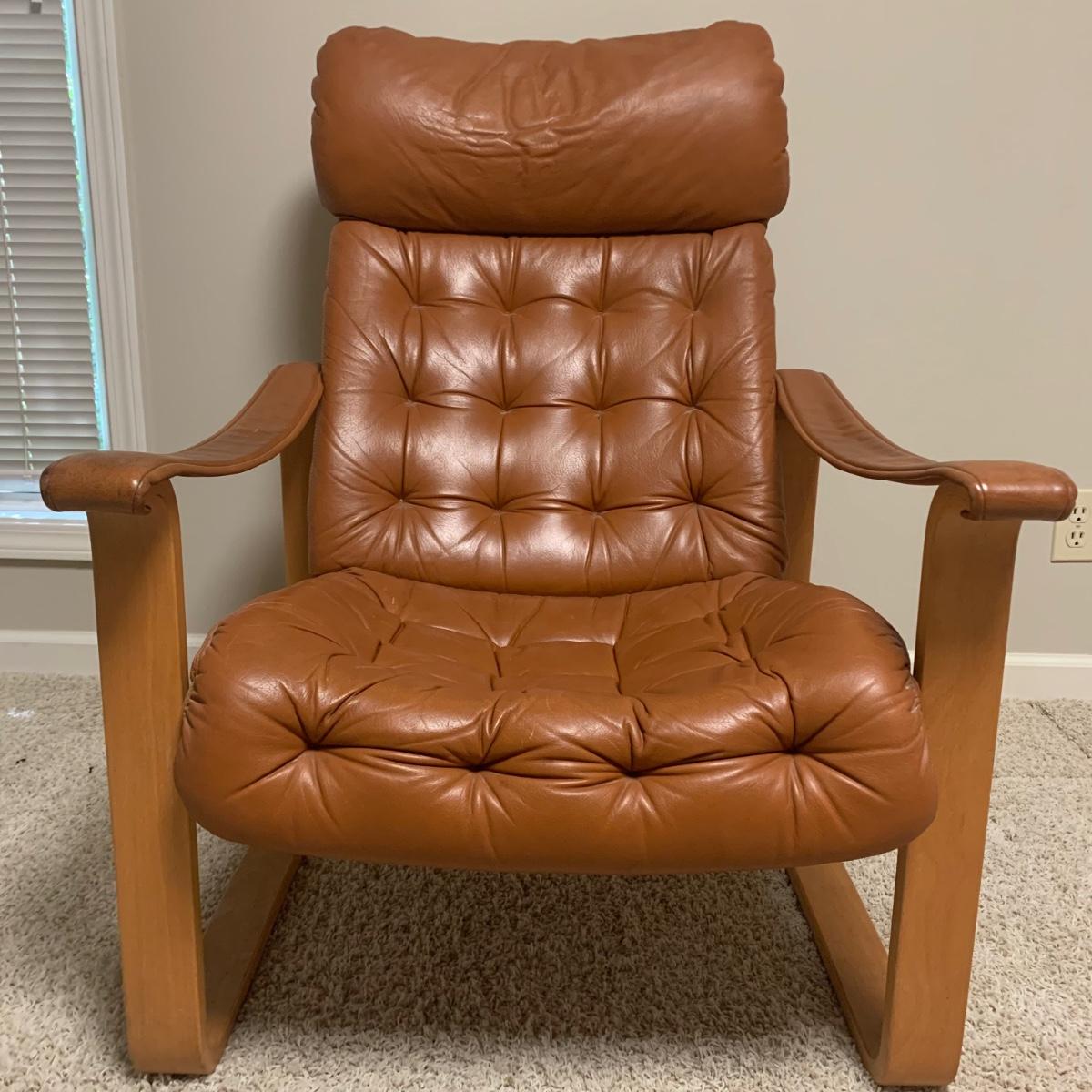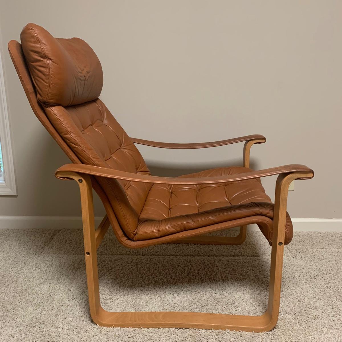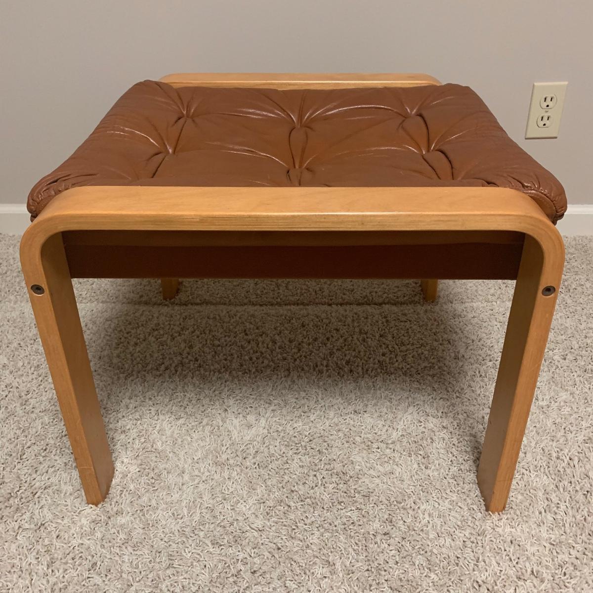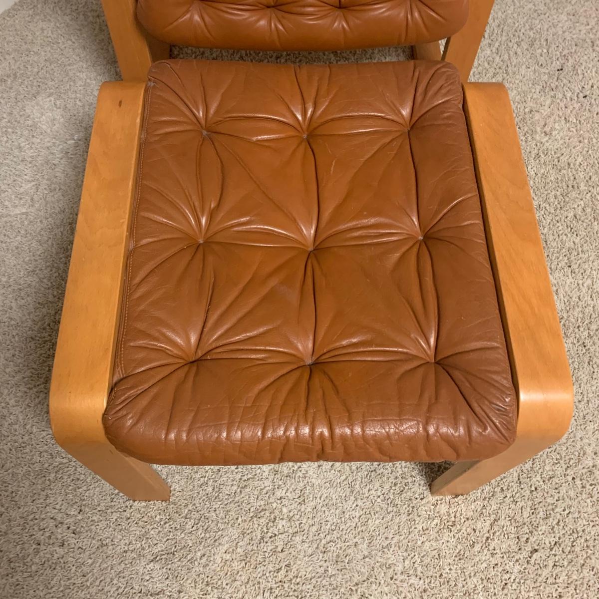 Bjarne Dahlqvist leather bentwood lounge chair in cognac color with matching footstool. Chair measures approximately, 27” x 30” x 37”H with a seat height of 13”H. Stool measures approximately, 22” x 22” x 16”H. Leather armrests could use light cleaning, please see photos for more details.