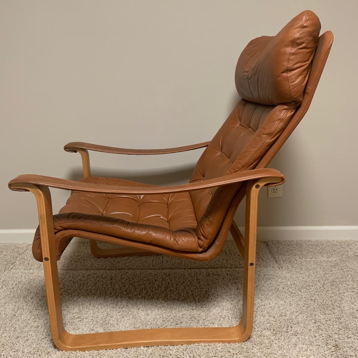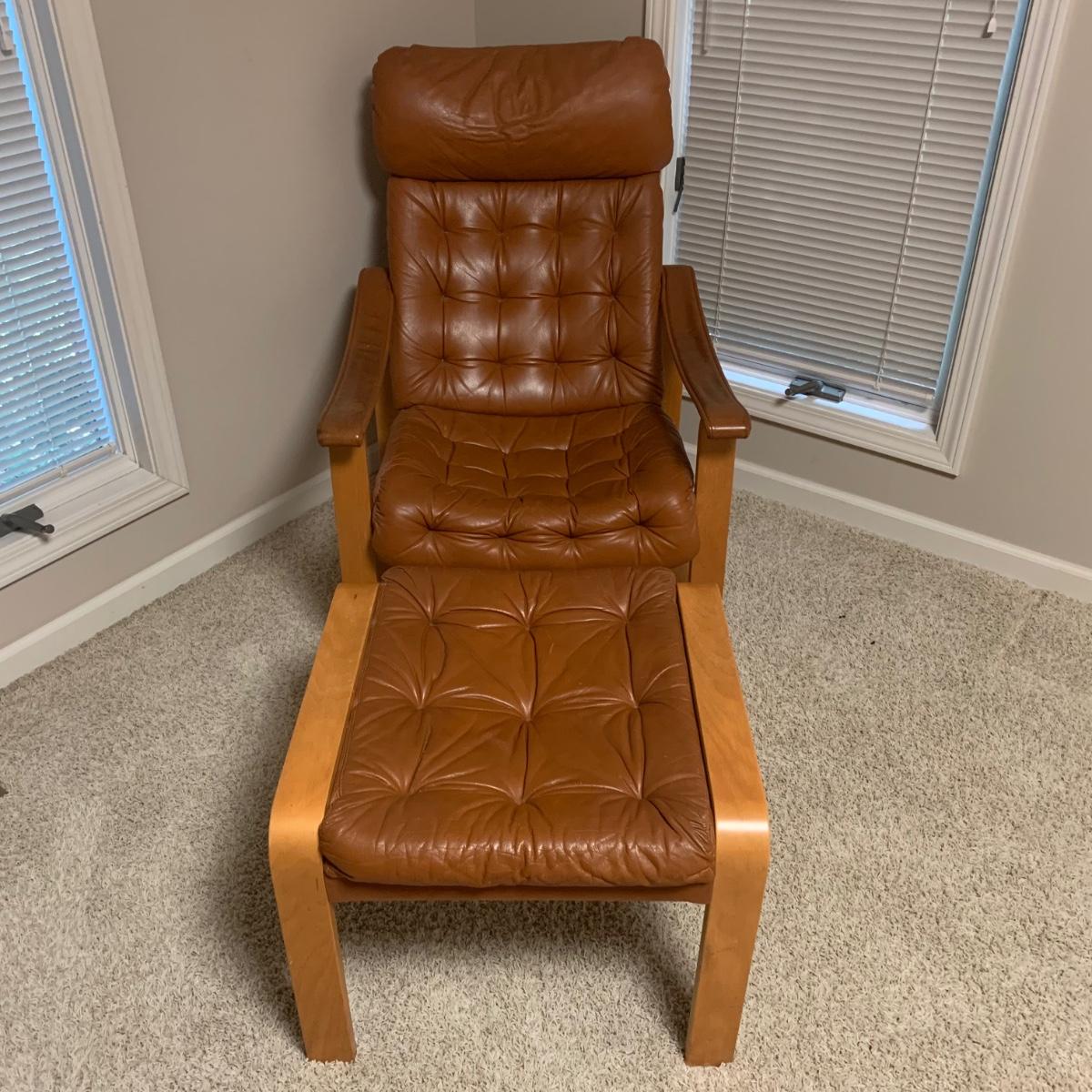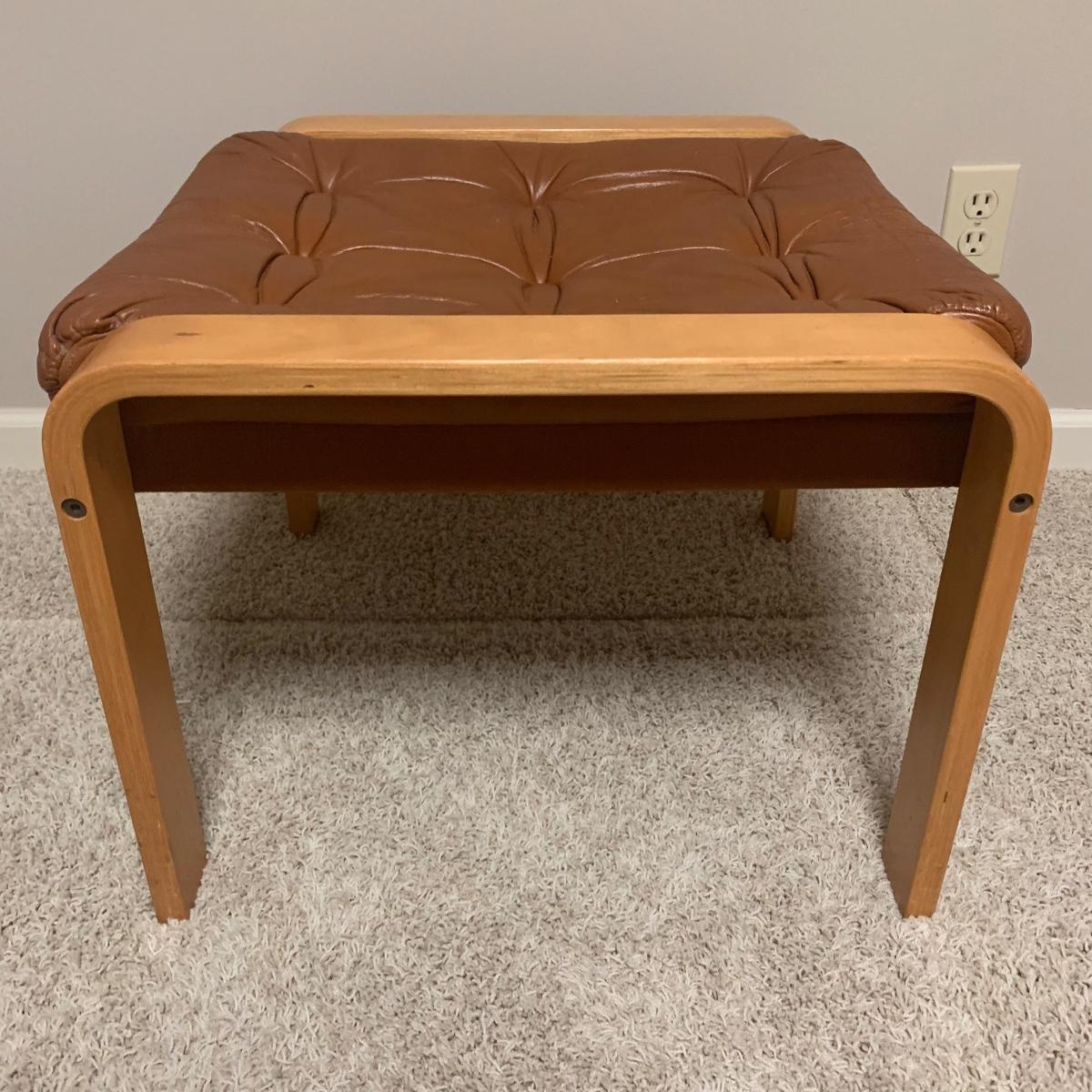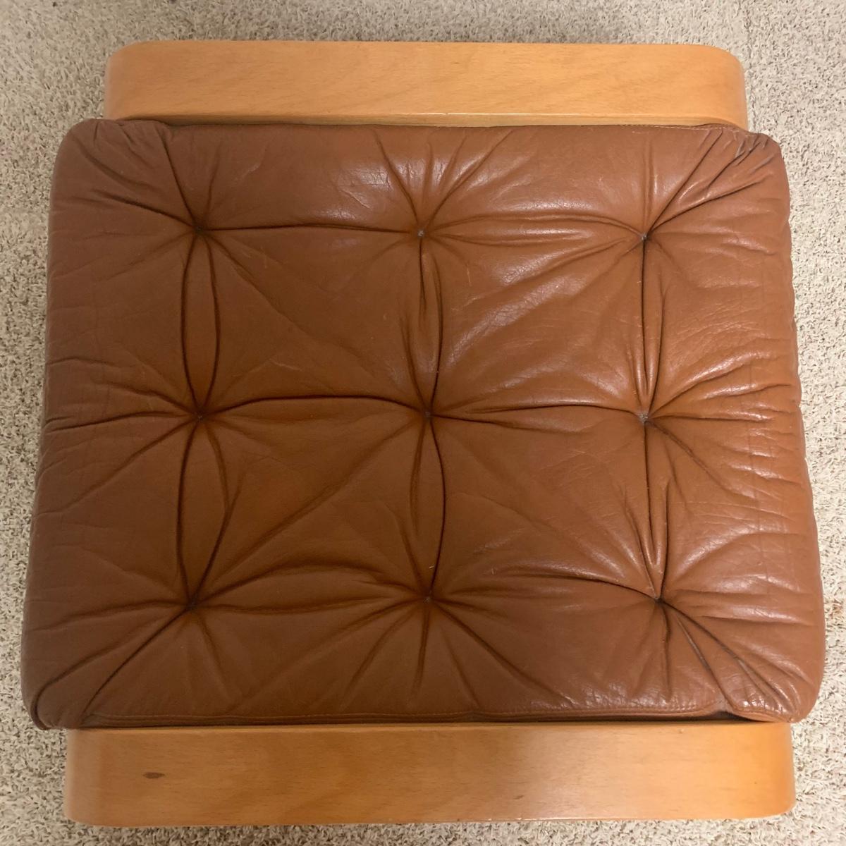Bjarne Dahlqvist leather bentwood lounge chair in cognac color with matching footstool. Chair measures approximately, 27” x 30” x 37”H with a seat height of 13”H. Stool measures approximately, 22” x 22” x 16”H. Leather armrests could use light cleaning, please see photos for more details.