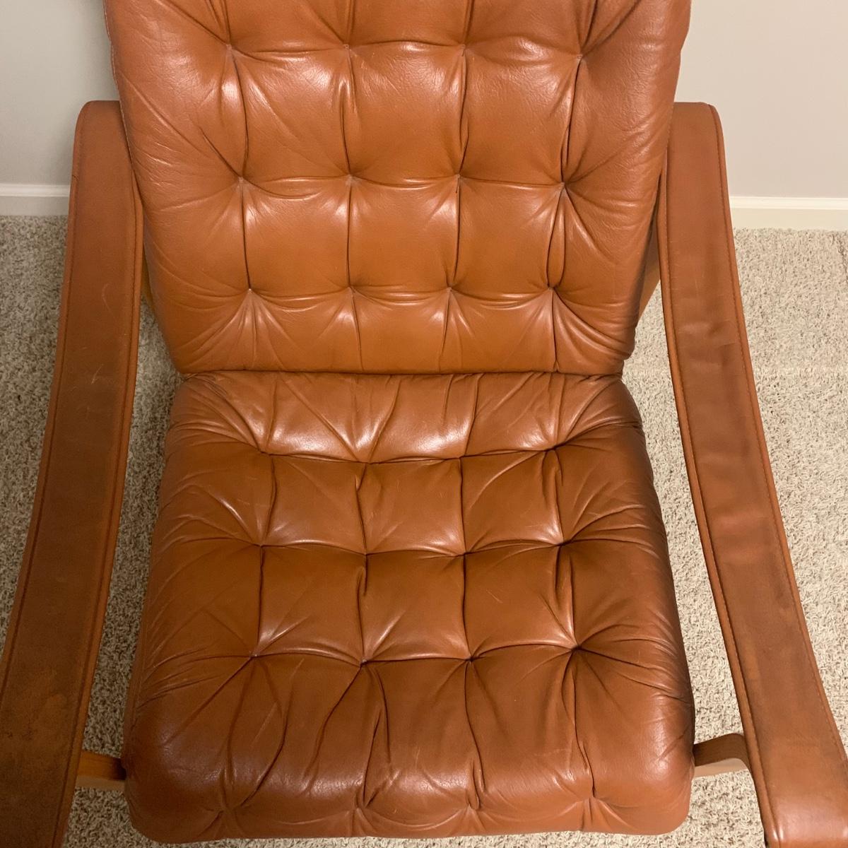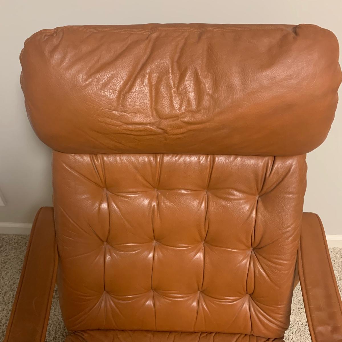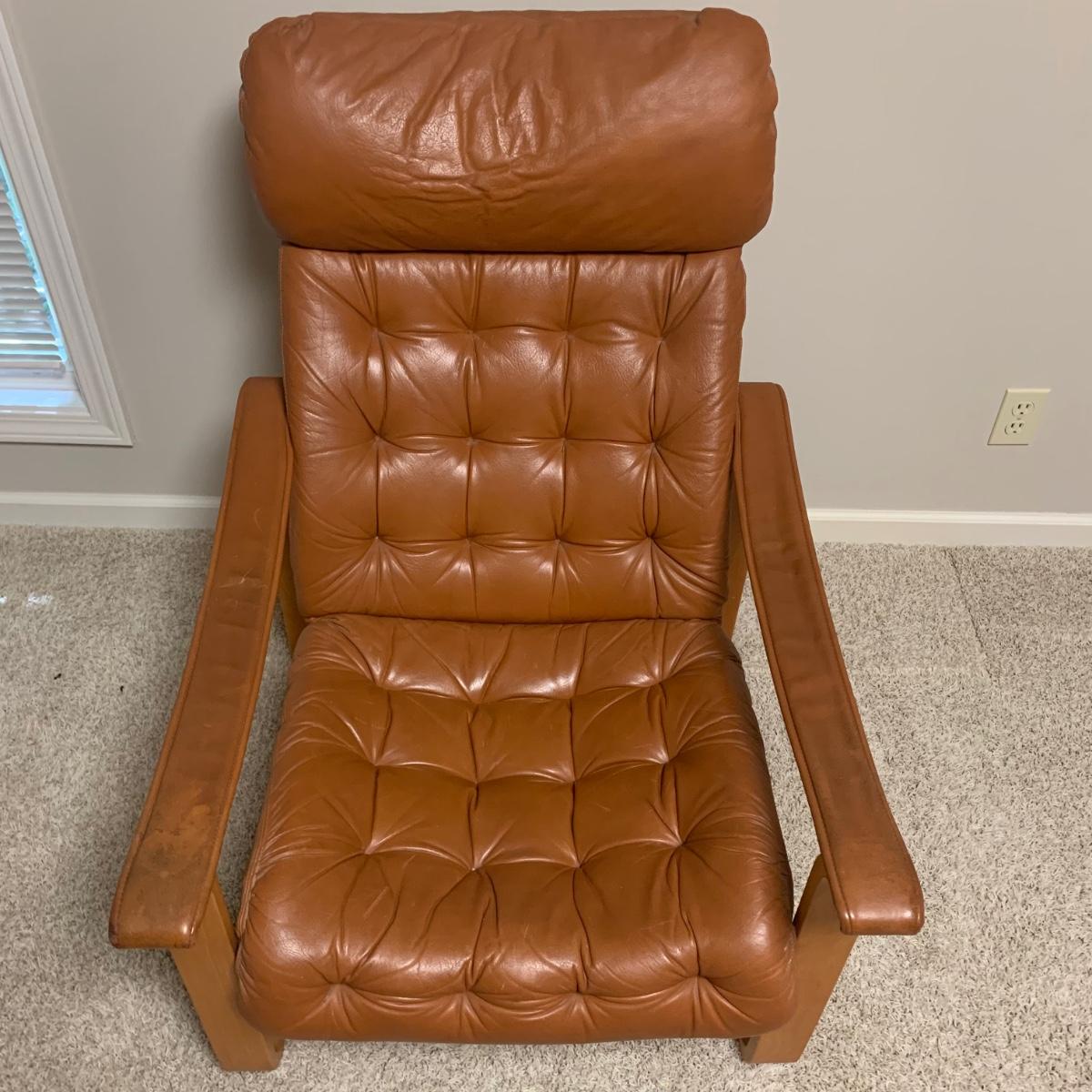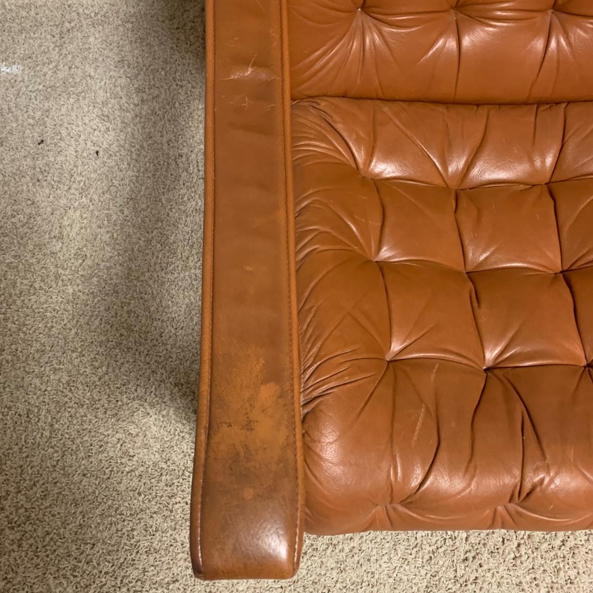 Bjarne Dahlqvist leather bentwood lounge chair in cognac color with matching footstool. Chair measures approximately, 27” x 30” x 37”H with a seat height of 13”H. Stool measures approximately, 22” x 22” x 16”H. Leather armrests could use light cleaning, please see photos for more details.