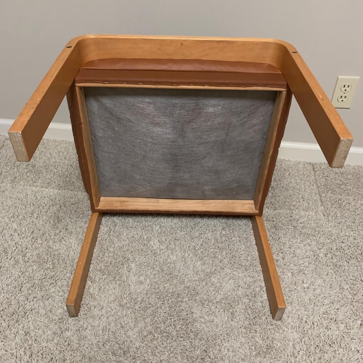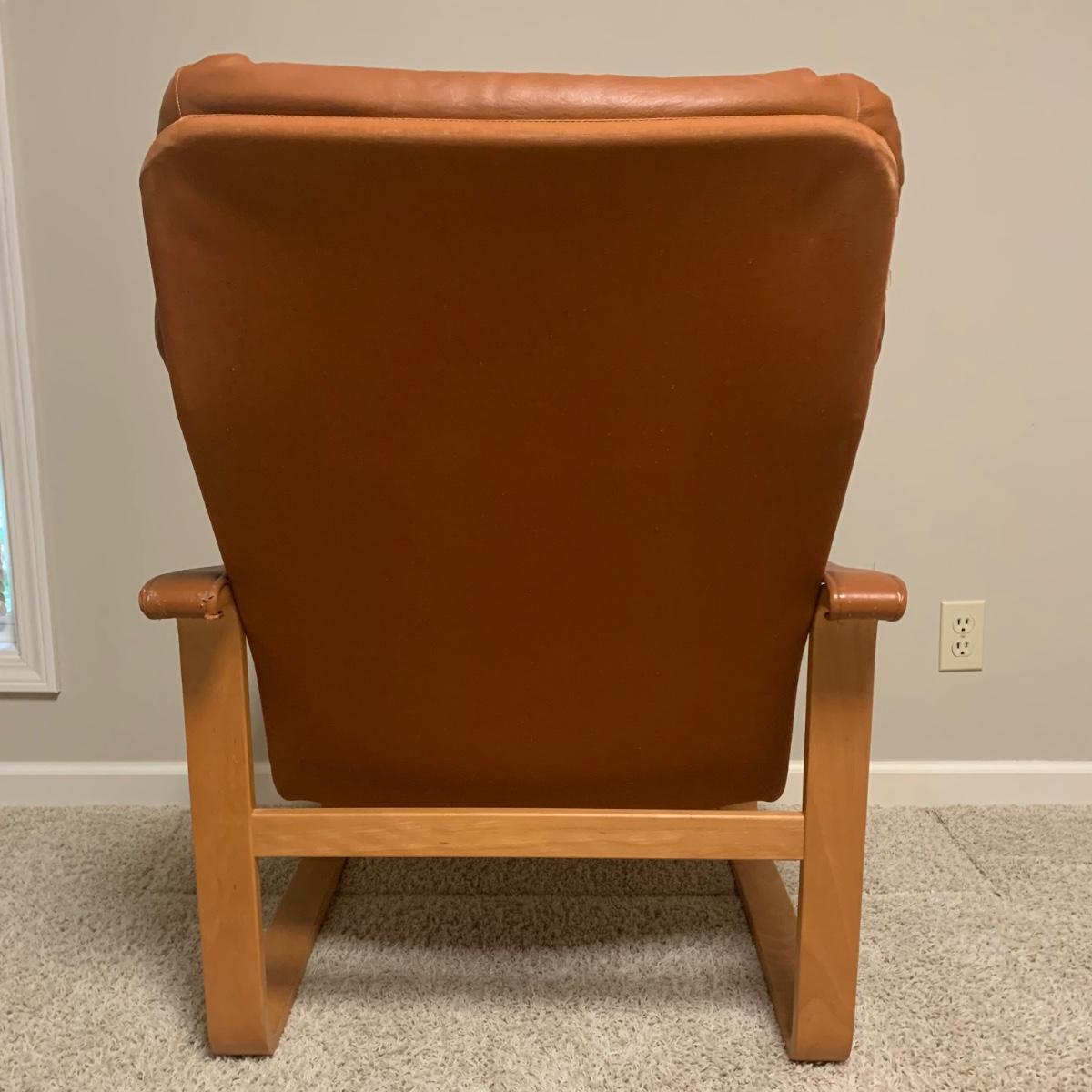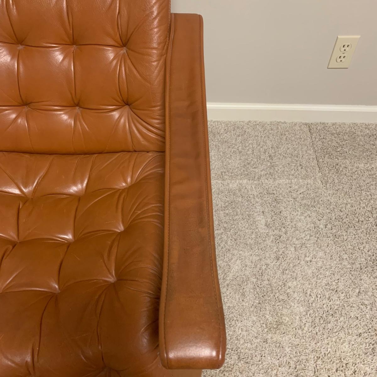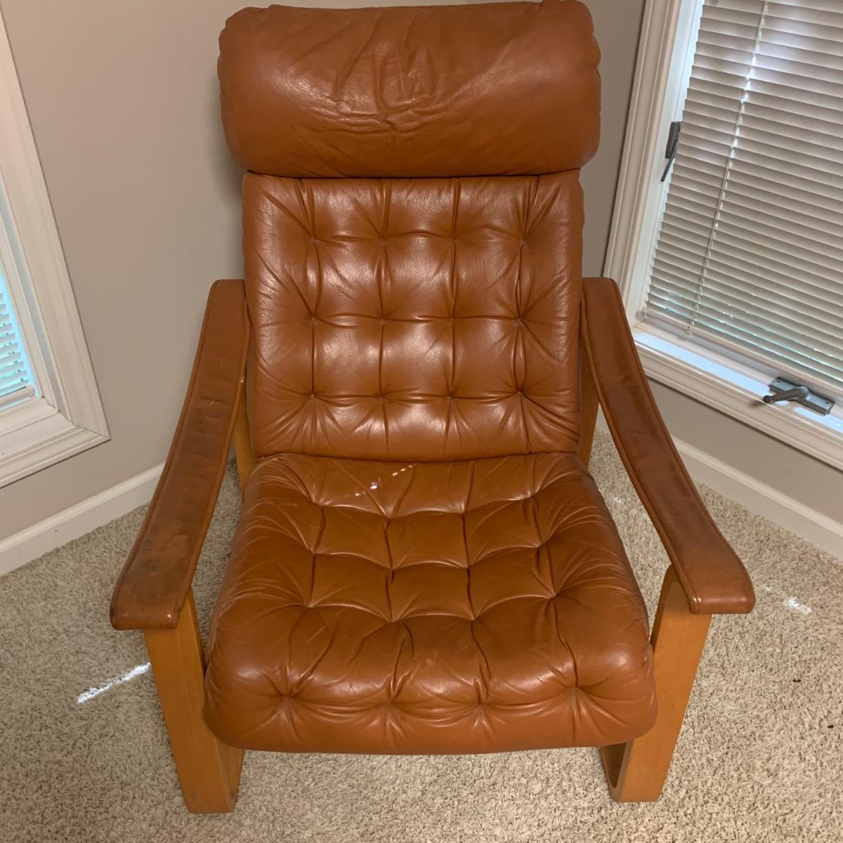 Bjarne Dahlqvist leather bentwood lounge chair in cognac color with matching footstool. Chair measures approximately, 27” x 30” x 37”H with a seat height of 13”H. Stool measures approximately, 22” x 22” x 16”H. Leather armrests could use light cleaning, please see photos for more details.