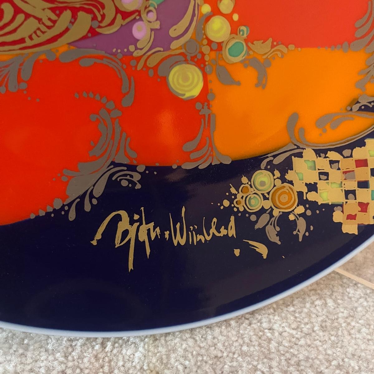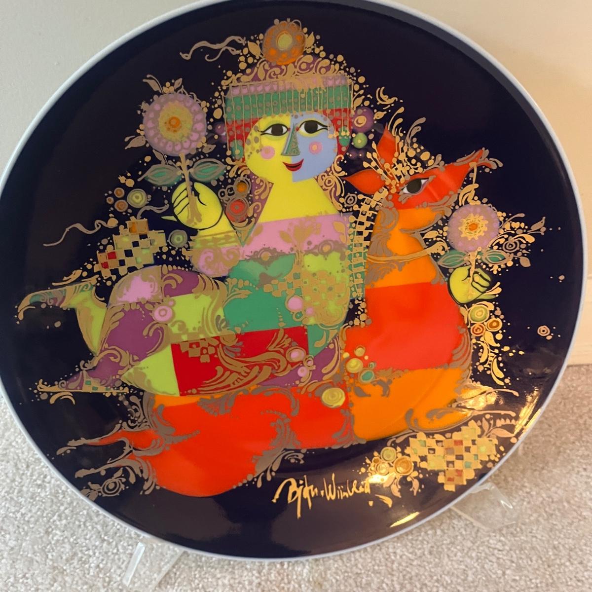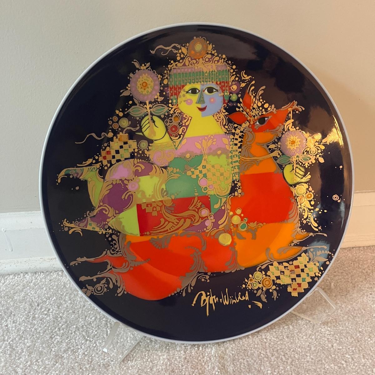 This Rosenthal plate with design by Bjorn Wiinblad has a wall mount on back and measures 13”D. Also includes plexiglass plate stand.