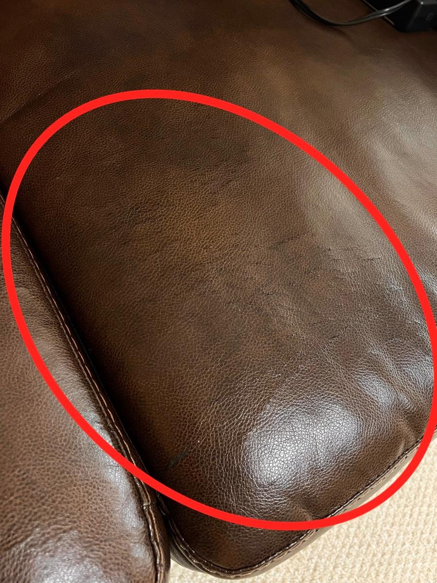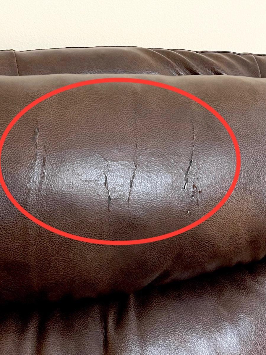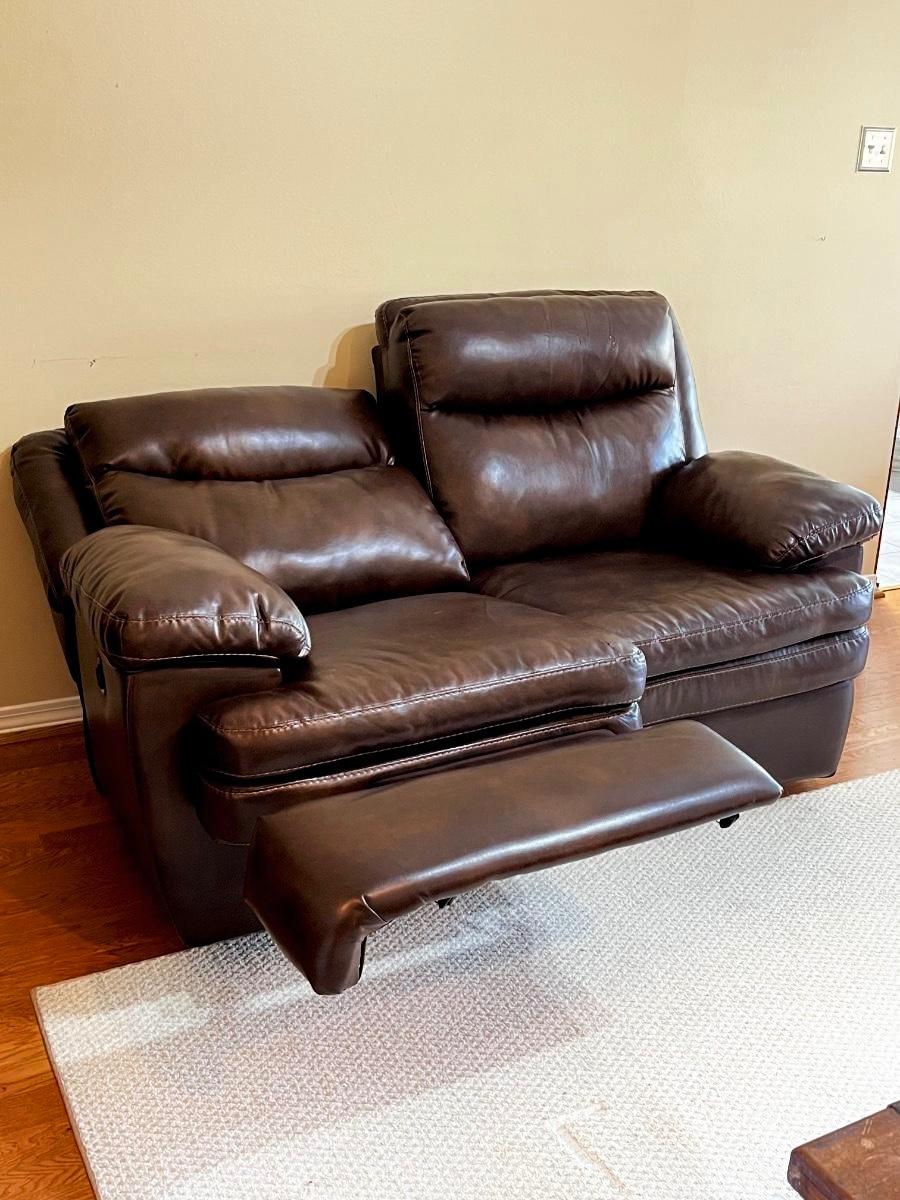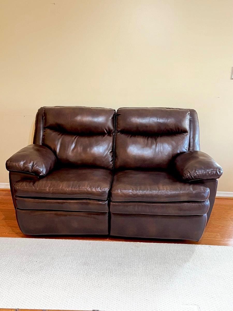 One side does not recline as seen in photo ~ Upholstery is starting to crack as seen in photos ~ 40” H x 63” W x 35” D ~ reclined 67” D