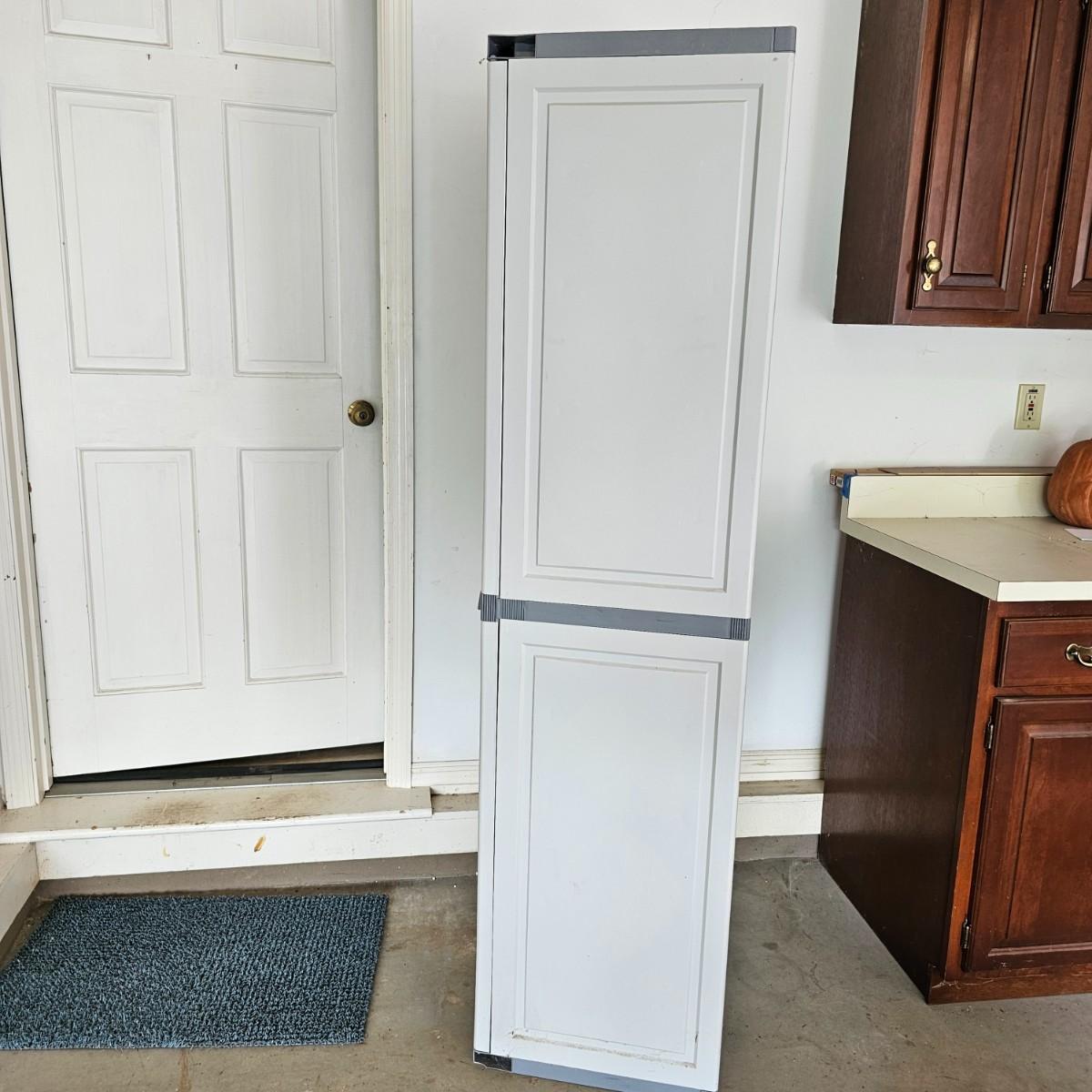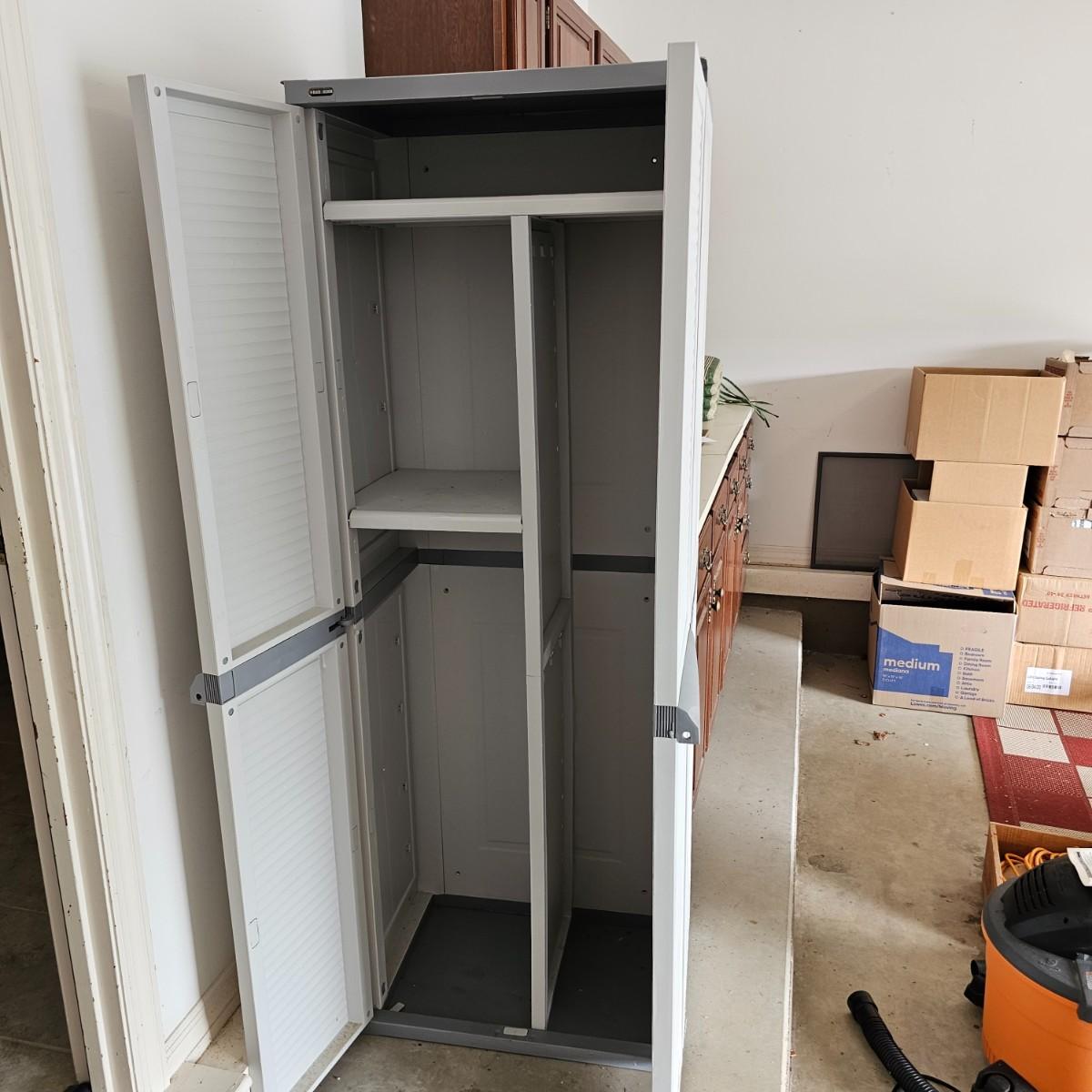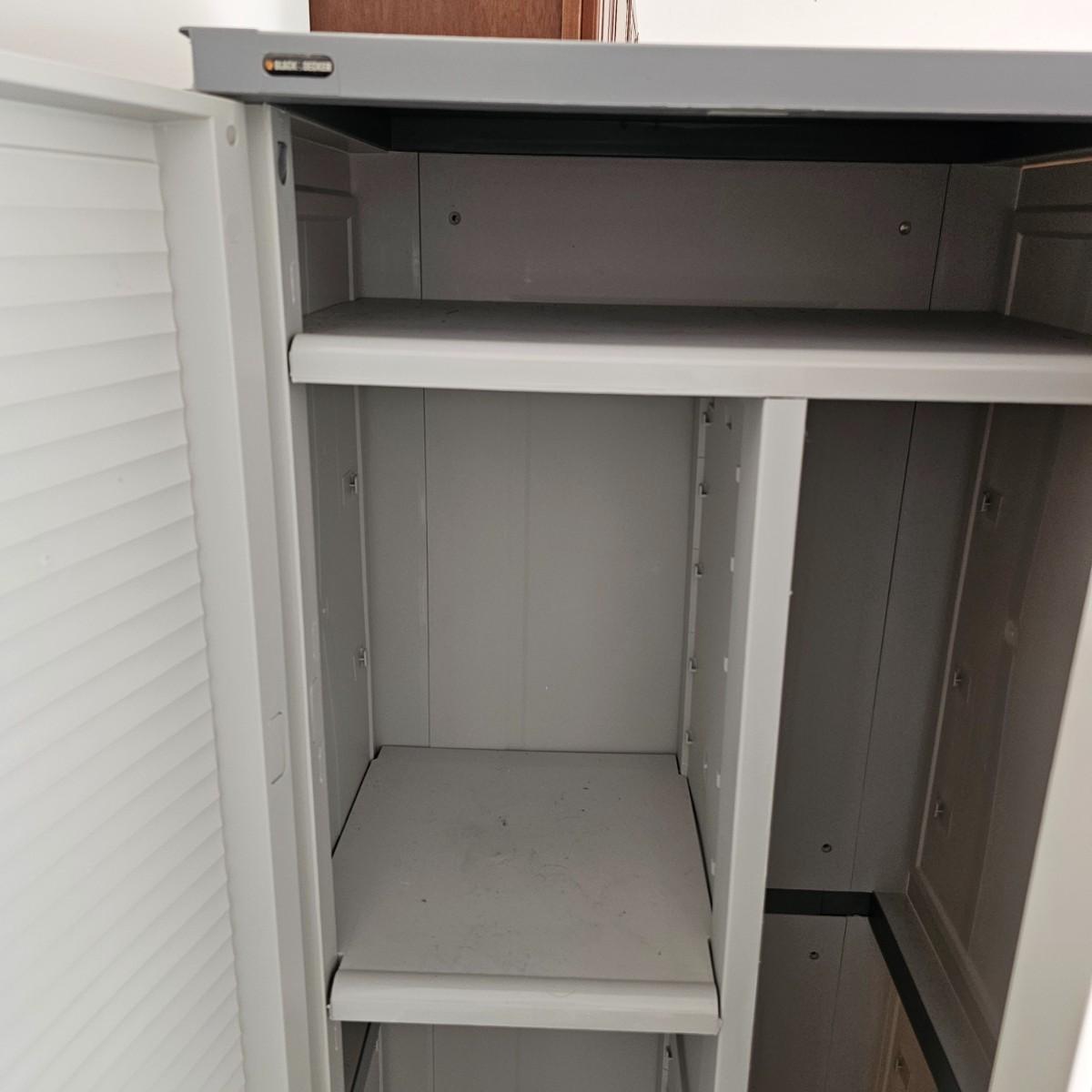 Two door Black & Decker plastic storage cabinet. One top shelf, one adjustable side shelf and full length storage on right side. Cabinet measures 25.5" x 17.5" x 69"H. See photos for details. Local pickup only.