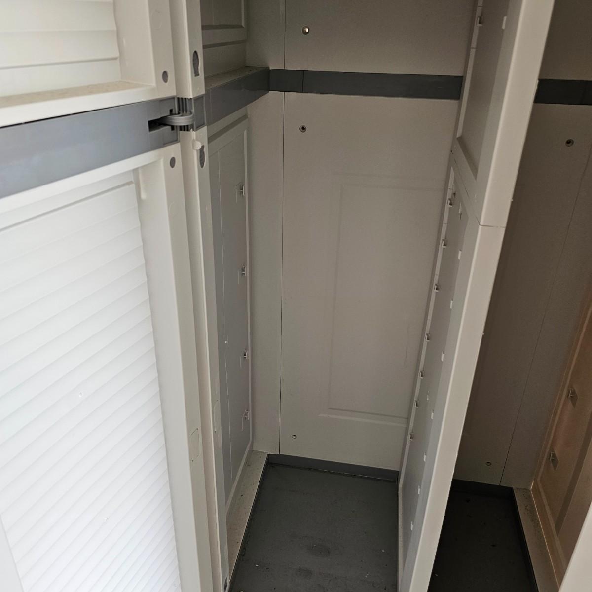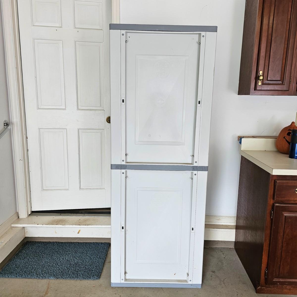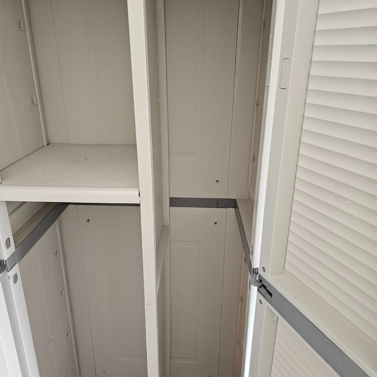 Two door Black & Decker plastic storage cabinet. One top shelf, one adjustable side shelf and full length storage on right side. Cabinet measures 25.5" x 17.5" x 69"H. See photos for details. Local pickup only.