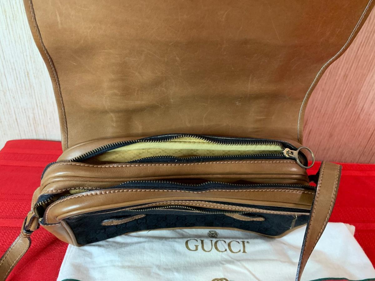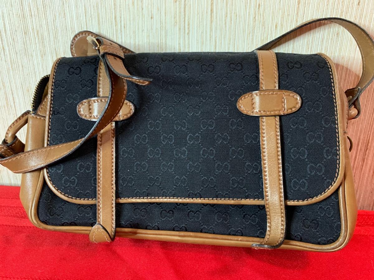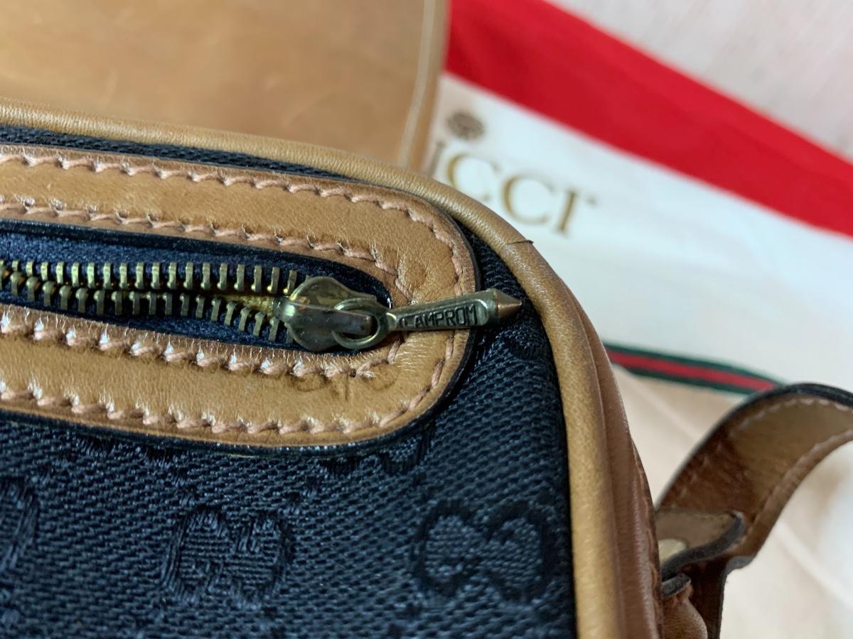 Black with Brown Leather Gucci purse with Lamprom zipper. Purse is in great condition all around. Comes with white Gucci bag.