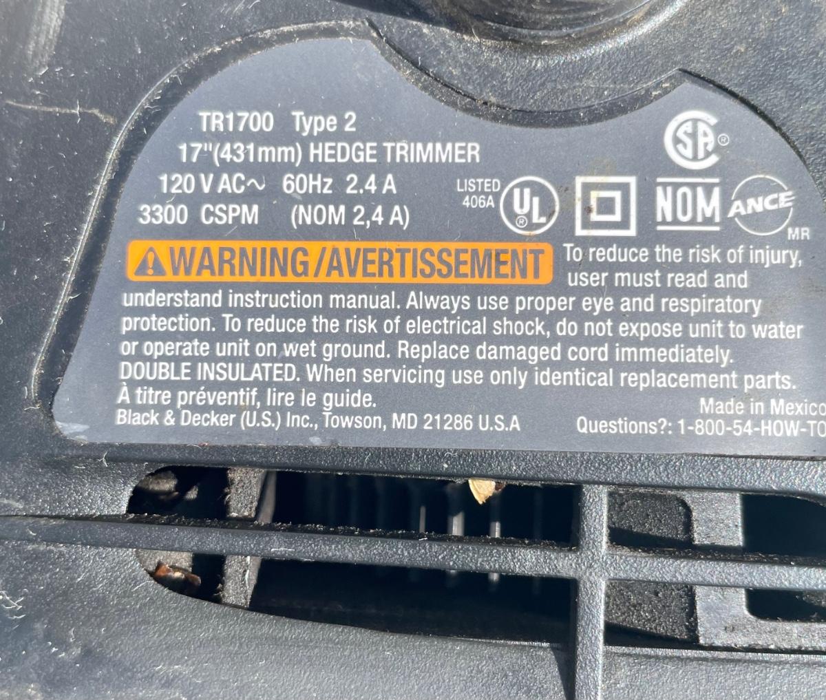 Black and Decker 17" Hedge Trimmer model TR1700 Type 2. Tested, runs strong. Includes 50ft. orange extension cord, see photos.
