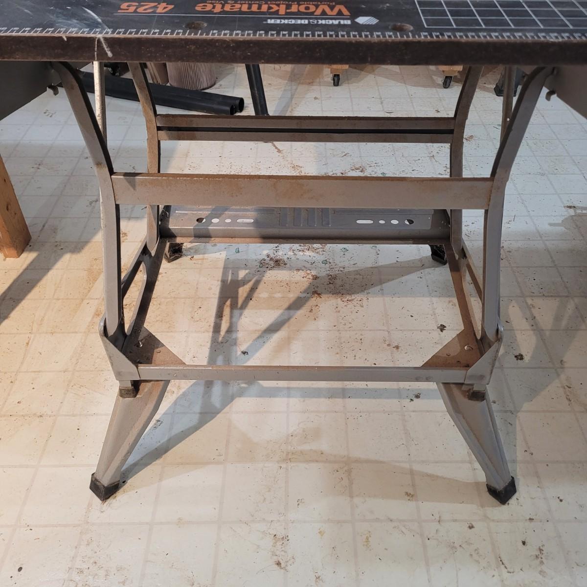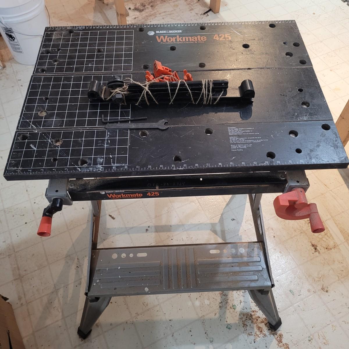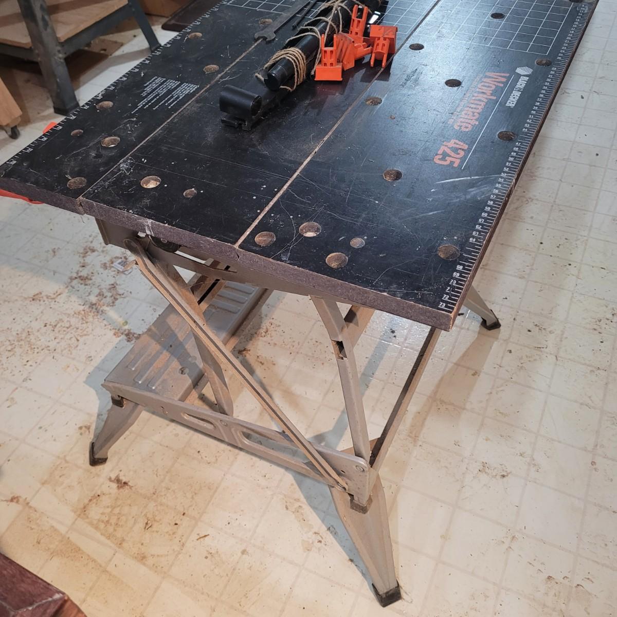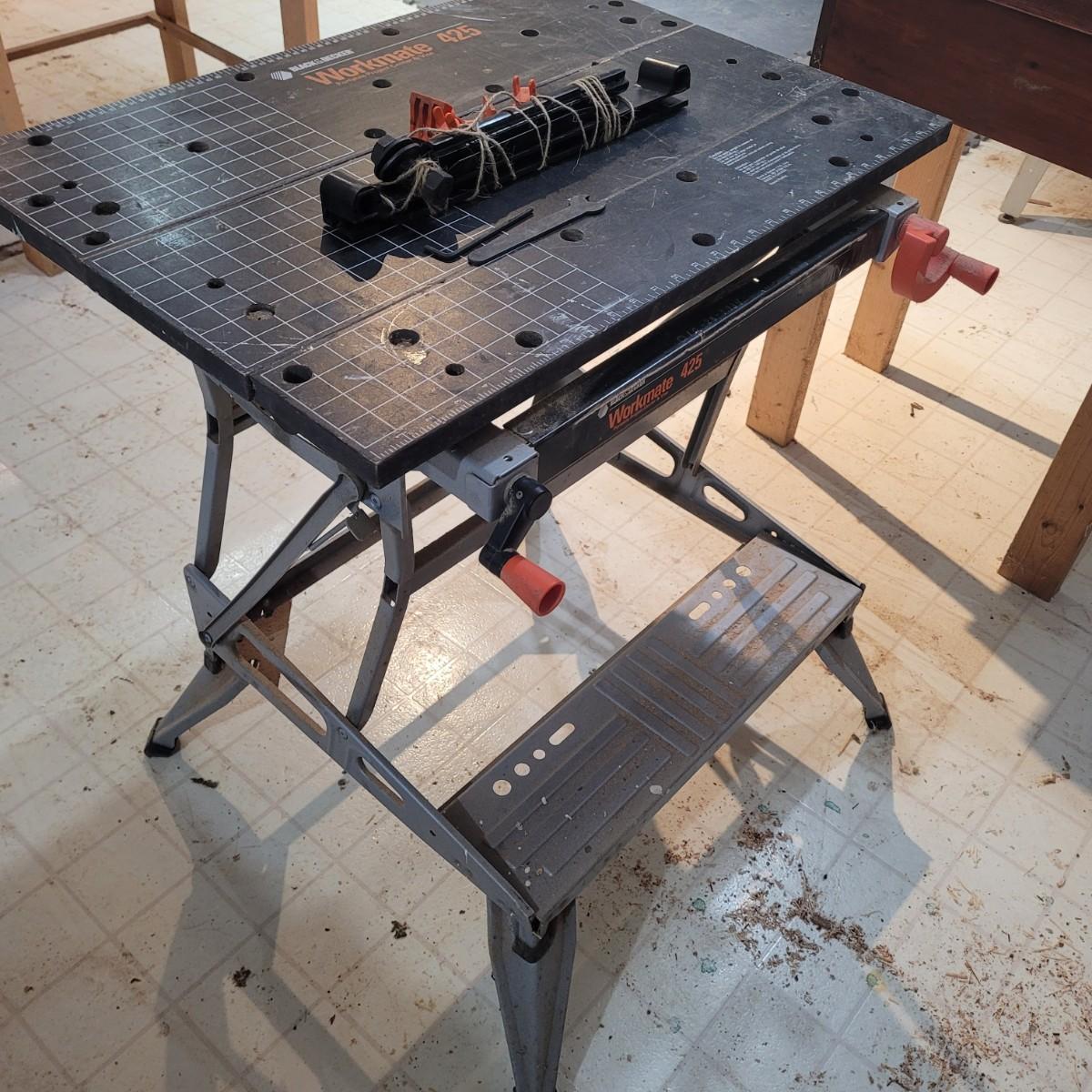Black and decker brand "Workmate 425" portable center and vise. Appears tonhave a wooden top and metal base. Folds for portability. 550 lb. Max load. Item measures approximately 29" x 26" x 31.5H.