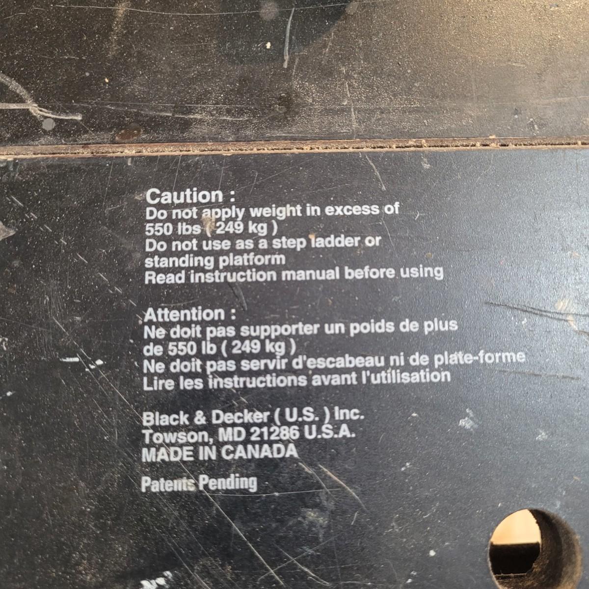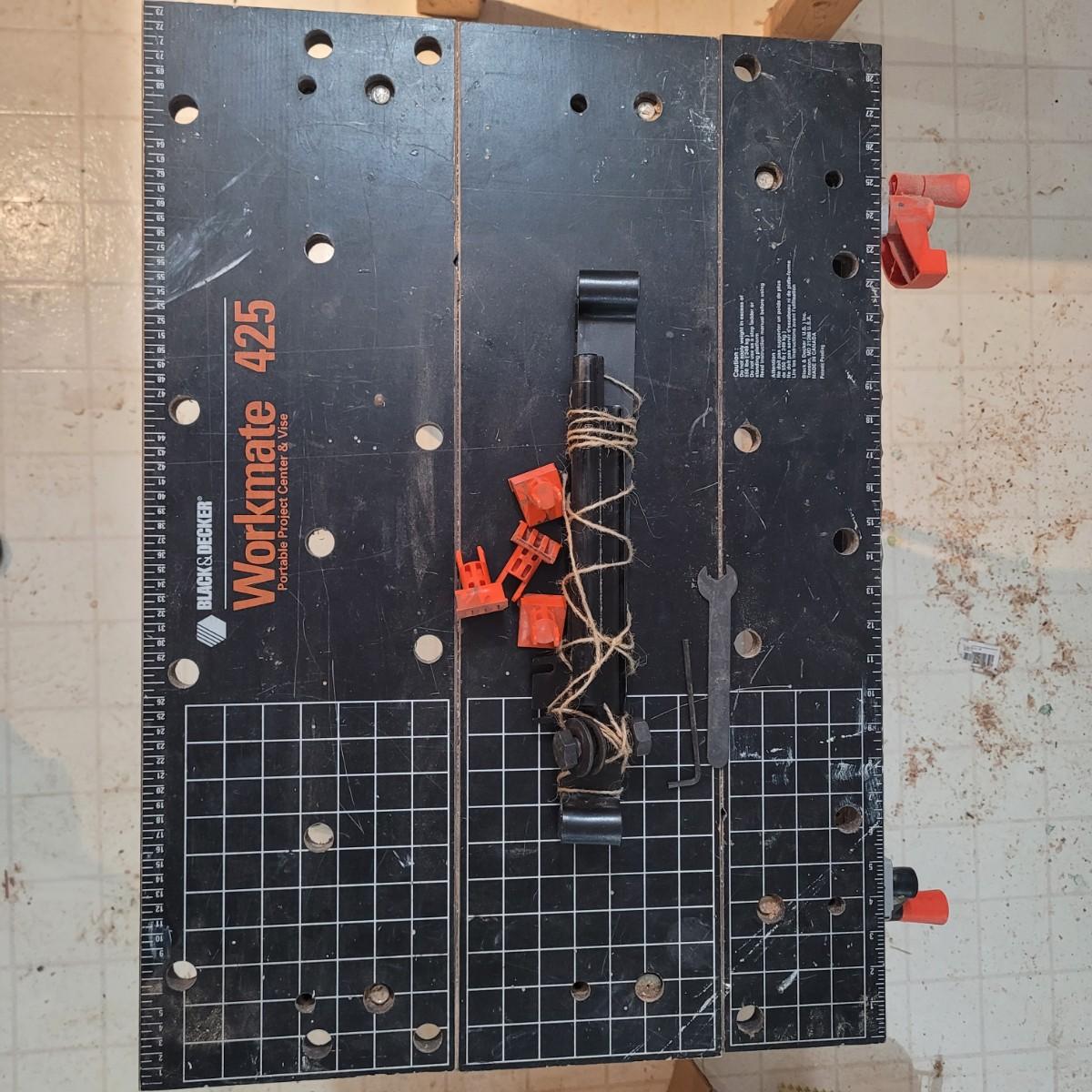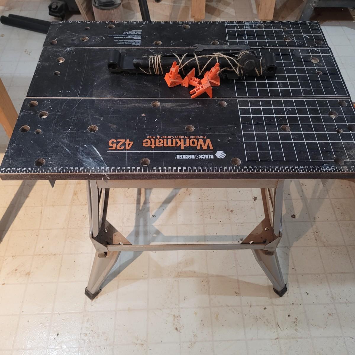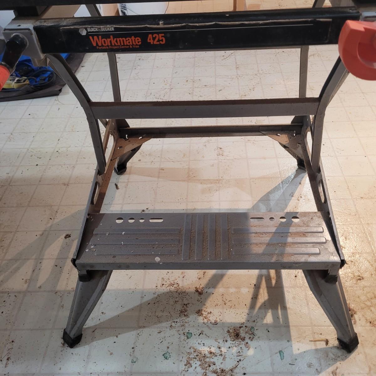 Black and decker brand "Workmate 425" portable center and vise. Appears tonhave a wooden top and metal base. Folds for portability. 550 lb. Max load. Item measures approximately 29" x 26" x 31.5H.